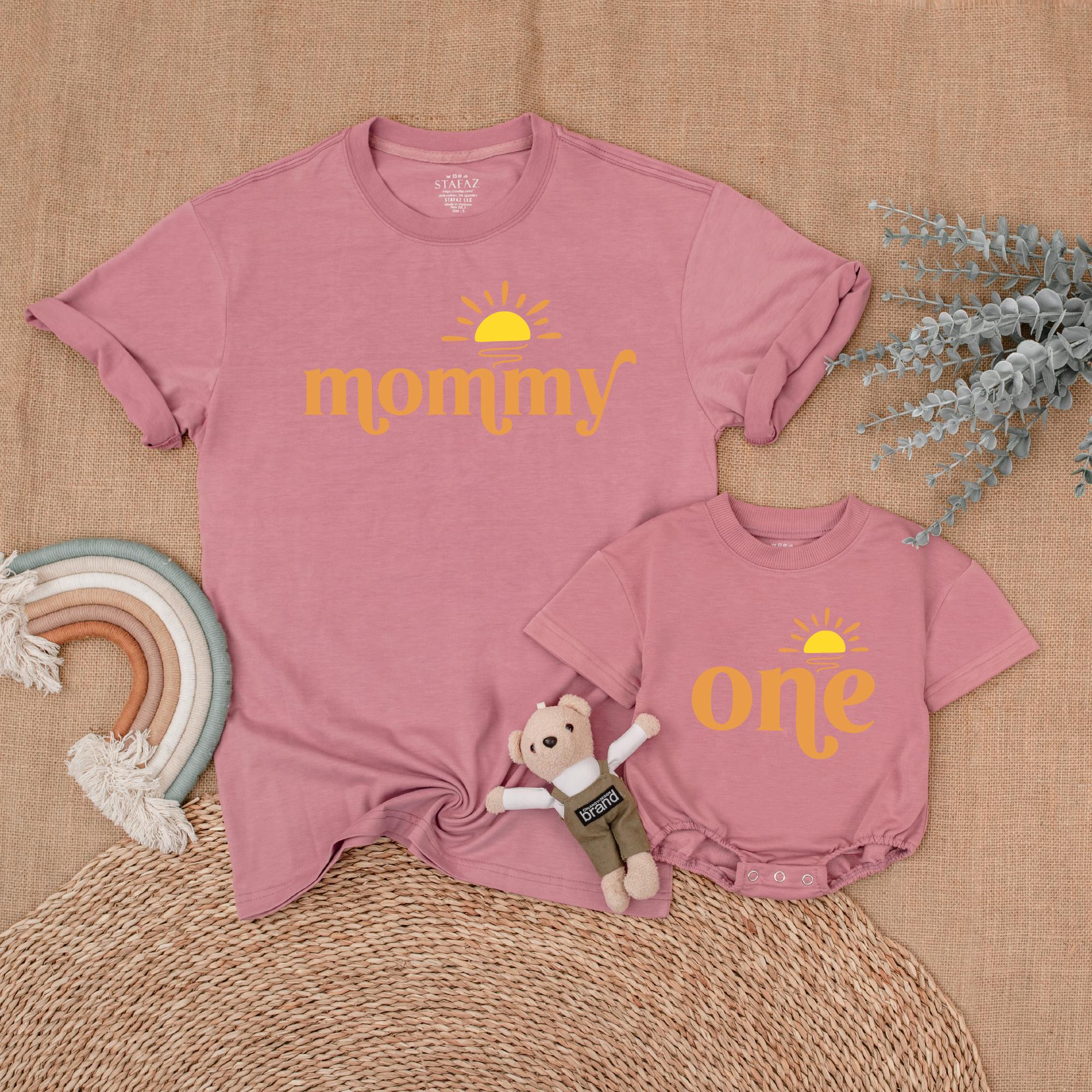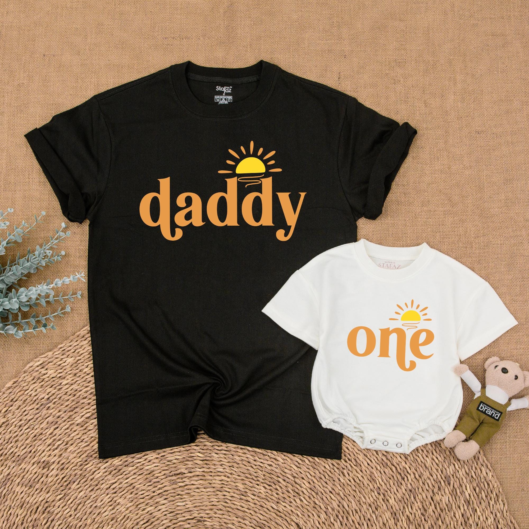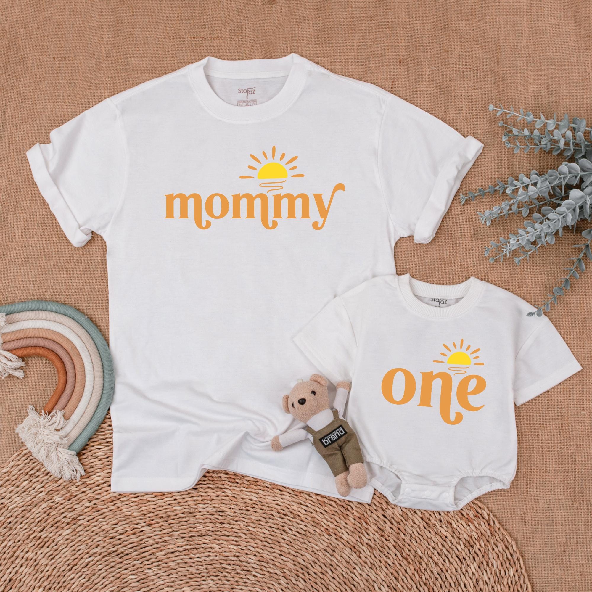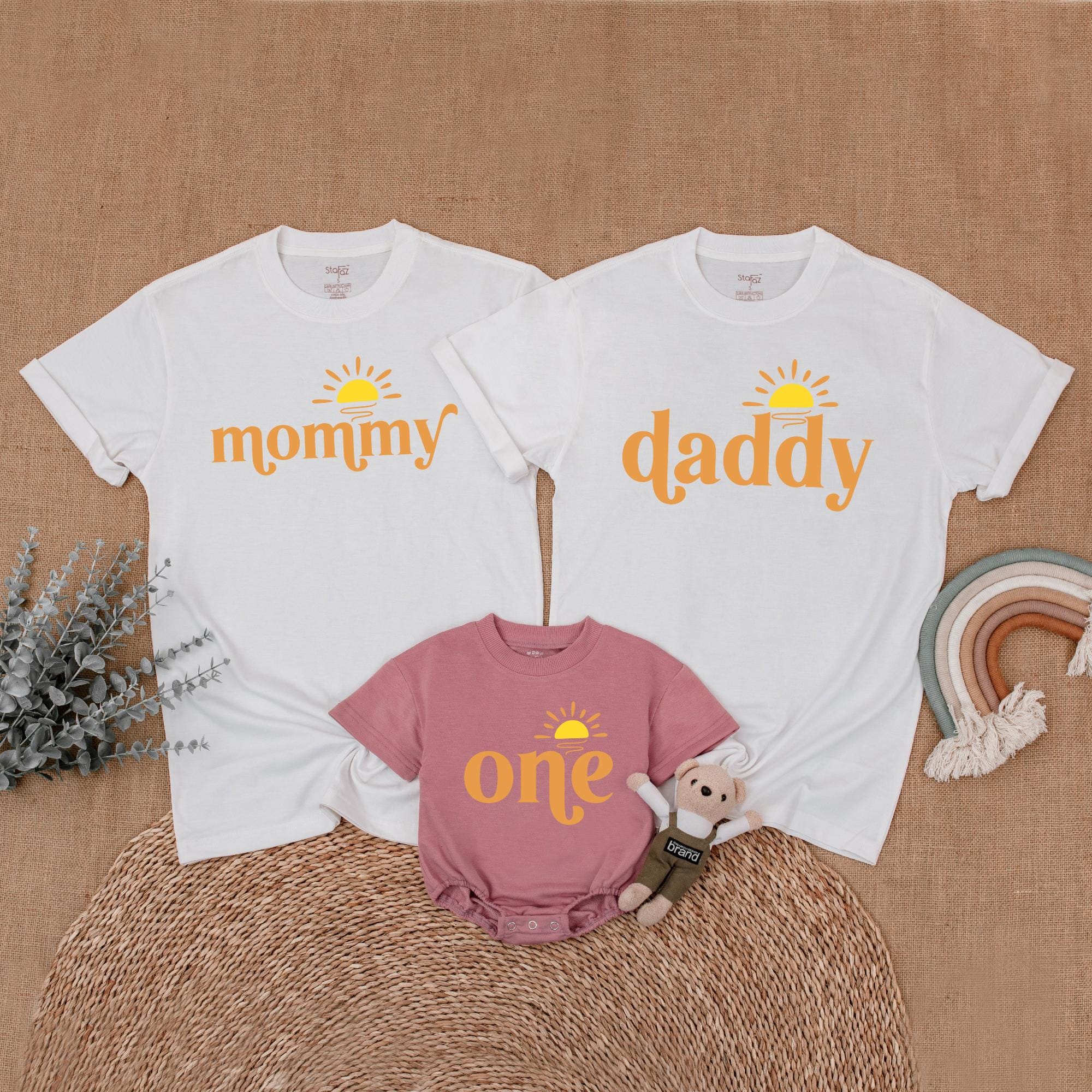 Celebrate your little one's first trip around the sun with a heartwarming family moment. Picture the joy on everyone's faces as you gather for a sunny birthday bash, each of you wearing a matching shirt adorned with a playful sun graphic. The cheerful yellow letters spell out 'mommy,' 'daddy,' 'sister,' and 'one,' creating an aura of warmth and togetherness. Imagine a delightful family photoshoot capturing these precious memories, or a casual day at the park where your coordinated outfits turn heads and spread smiles. Personalize each shirt with a name to make these soft cotton pieces a cherished keepsake that tells your family story. Whether it's a gift or a keepsake, embrace this opportunity to create a lasting bond with your loved ones. Order now to turn this celebration into a treasured memory.