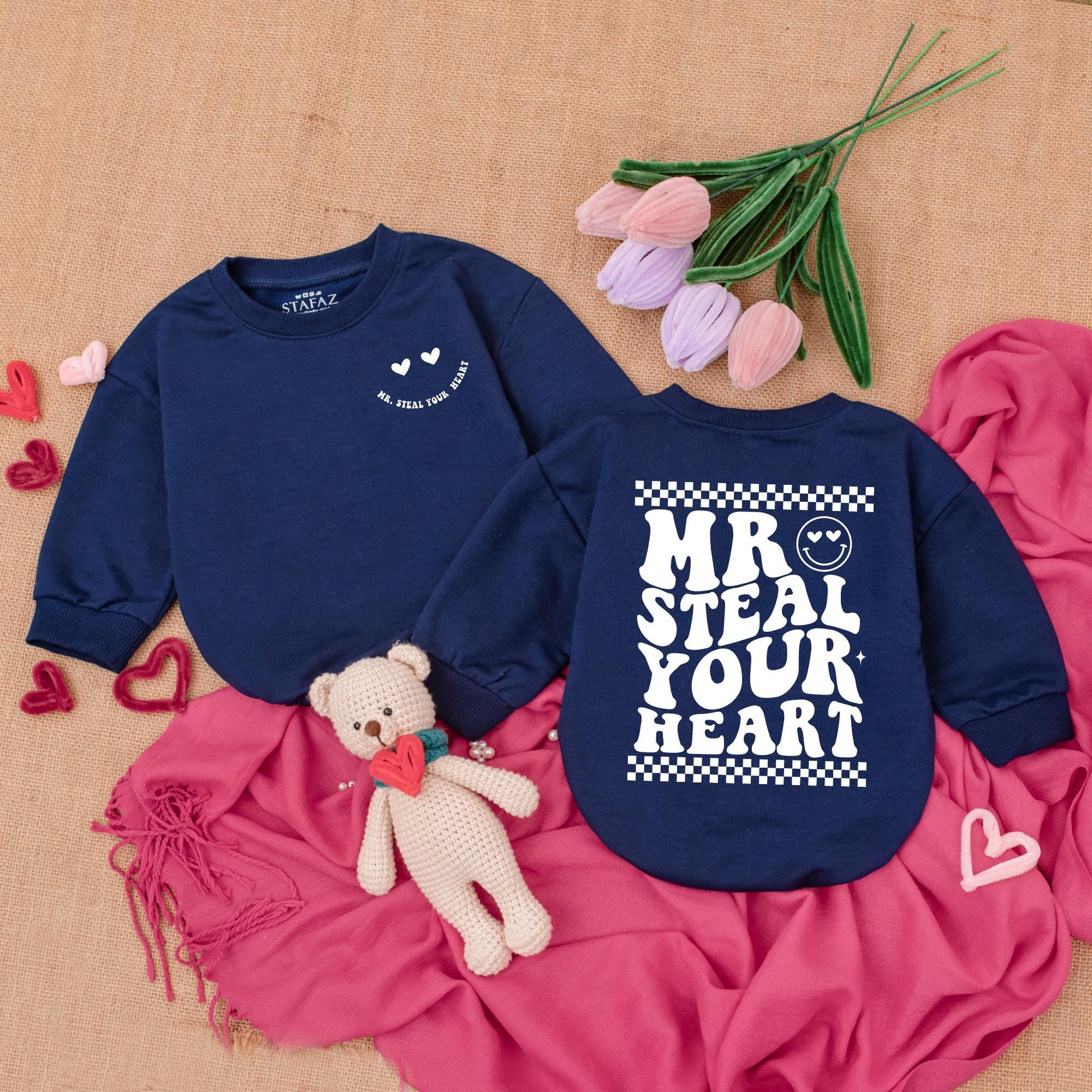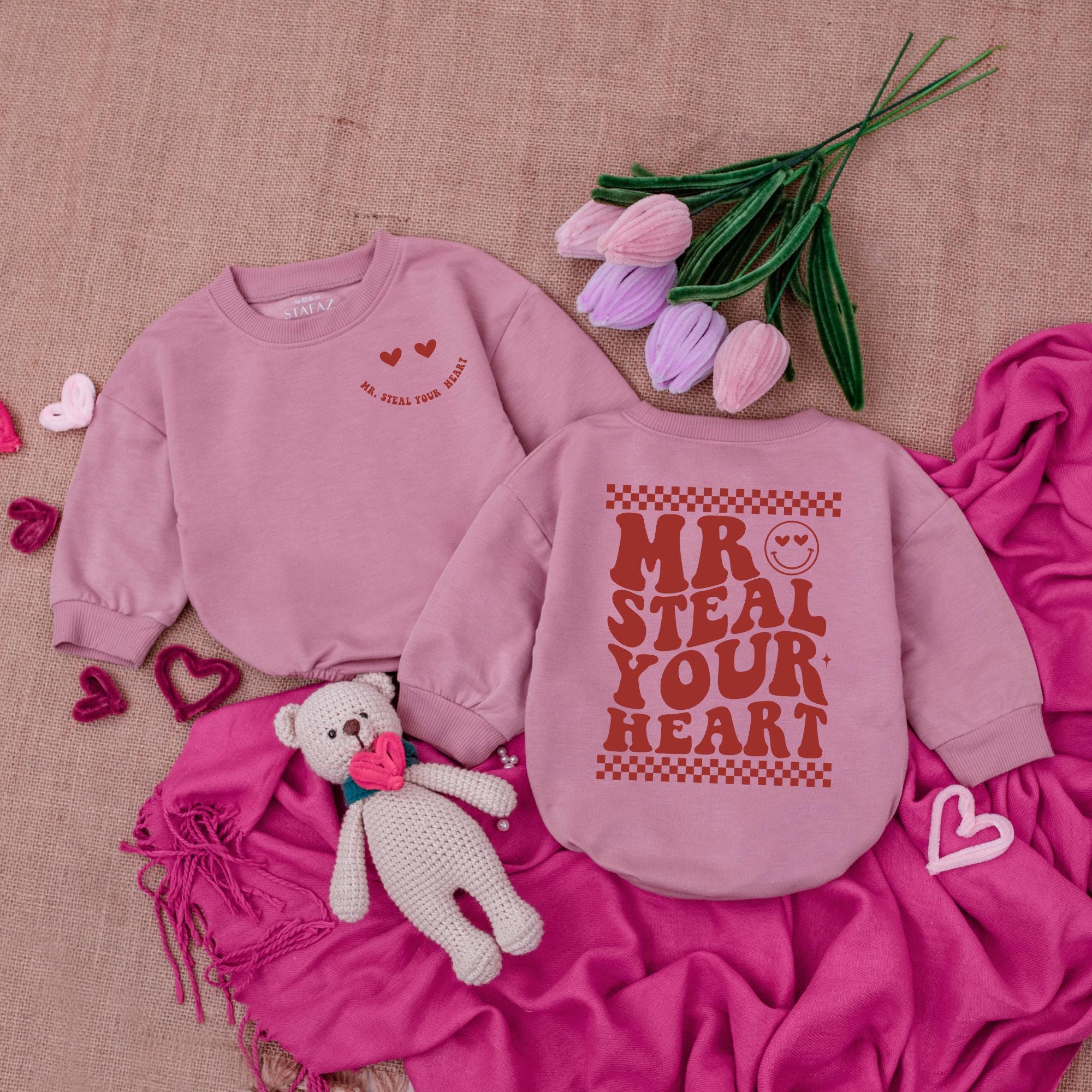 Imagine the joy of dressing your little one in a bodysuit that embodies playfulness and love. The 'MR STEAL YOUR HEART' design in bold brown letters is both charming and whimsical, set against a lively red and white checkered pattern. A cheerful smiley face tops the design, adding a touch of happiness, while two red hearts complete the theme of affection. This soft cotton romper is perfect for any occasion, from a cozy day at home to a special Valentine's celebration. Whether it's for a memorable photo shoot or a delightful gift, this bodysuit captures the essence of love and joy. Let your baby be the heart-stealer at any gathering, infusing warmth and smiles wherever they go.