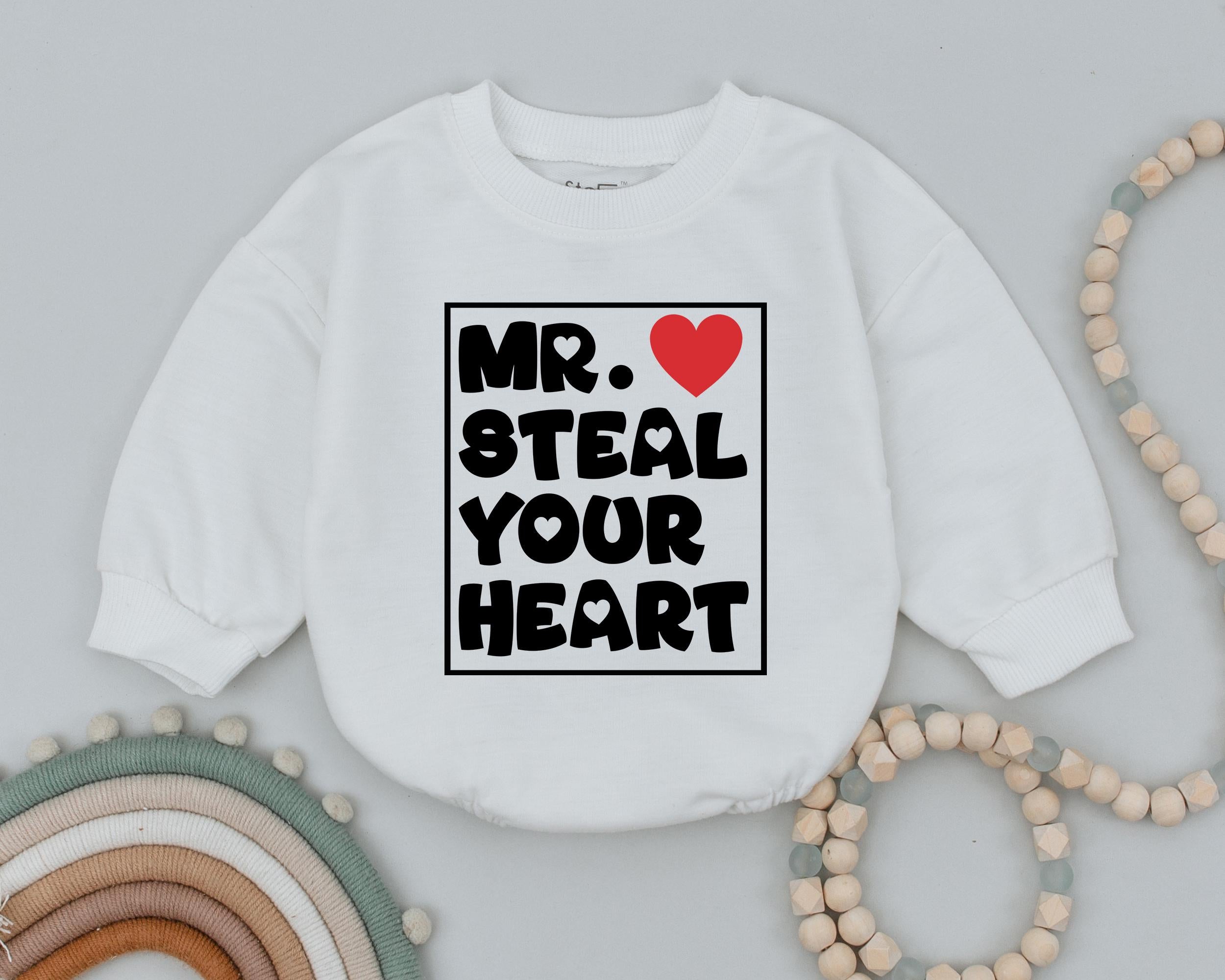 Mr. Steal Your Heart Baby Boy Valentines Romper First Holiday Outfit Cute Infant Bodysuit Red Heart Design Baby Shower Gift