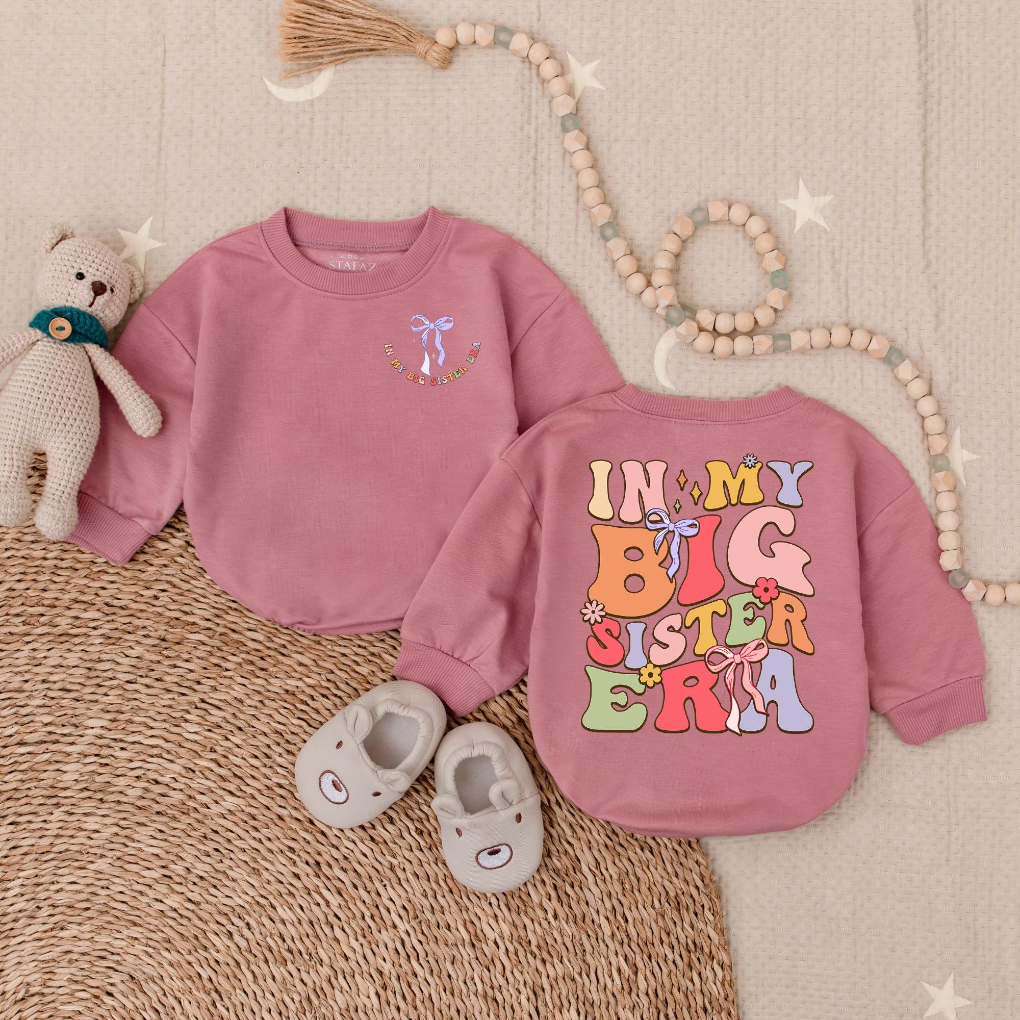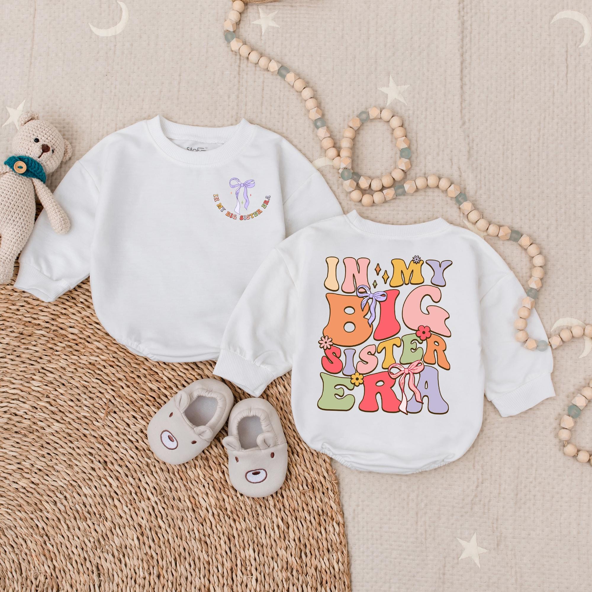 In My Big Sister Era Toddler Romper Playful Floral Design Gift Soft Cotton Birthday Outfit for Girls with Colorful Bow Detailing