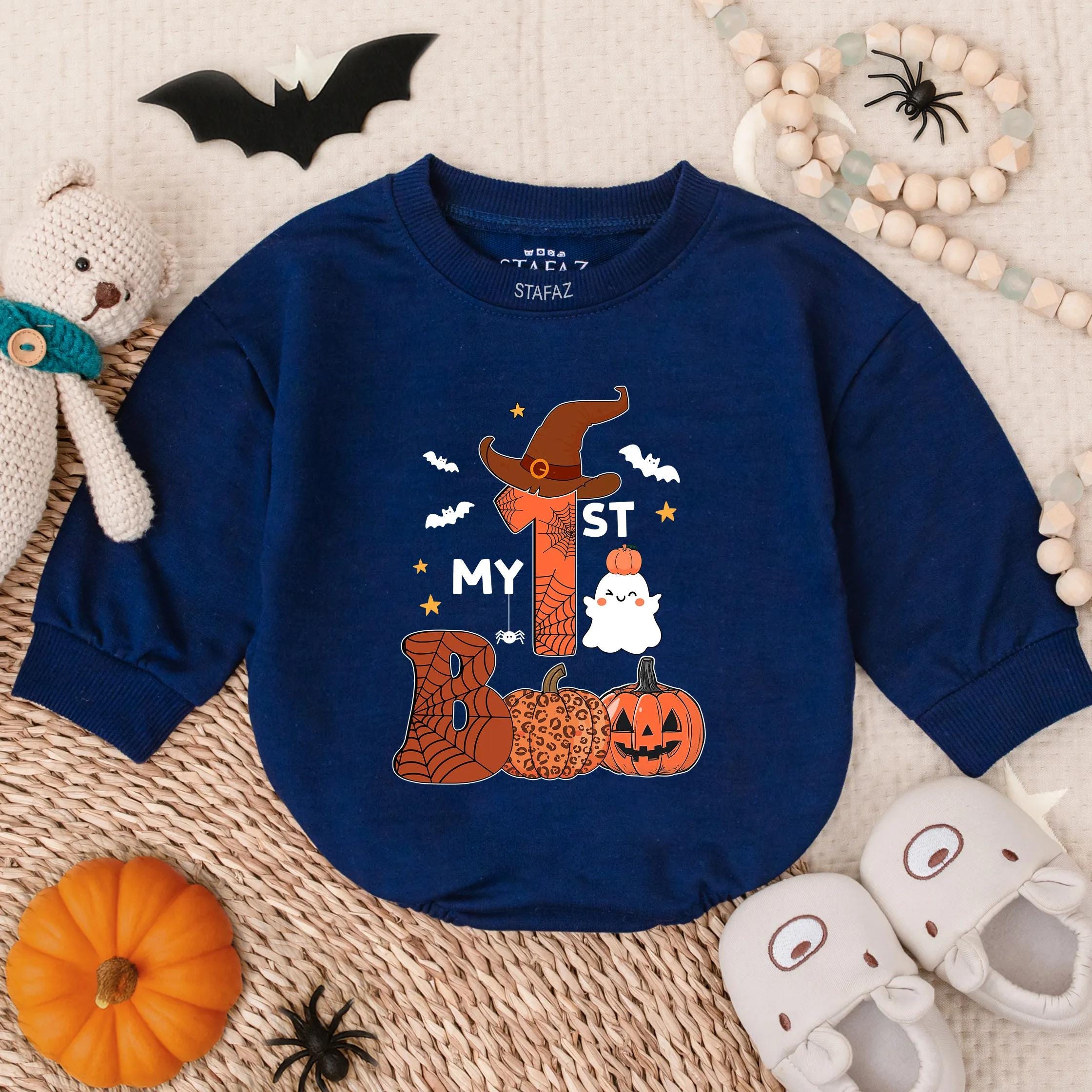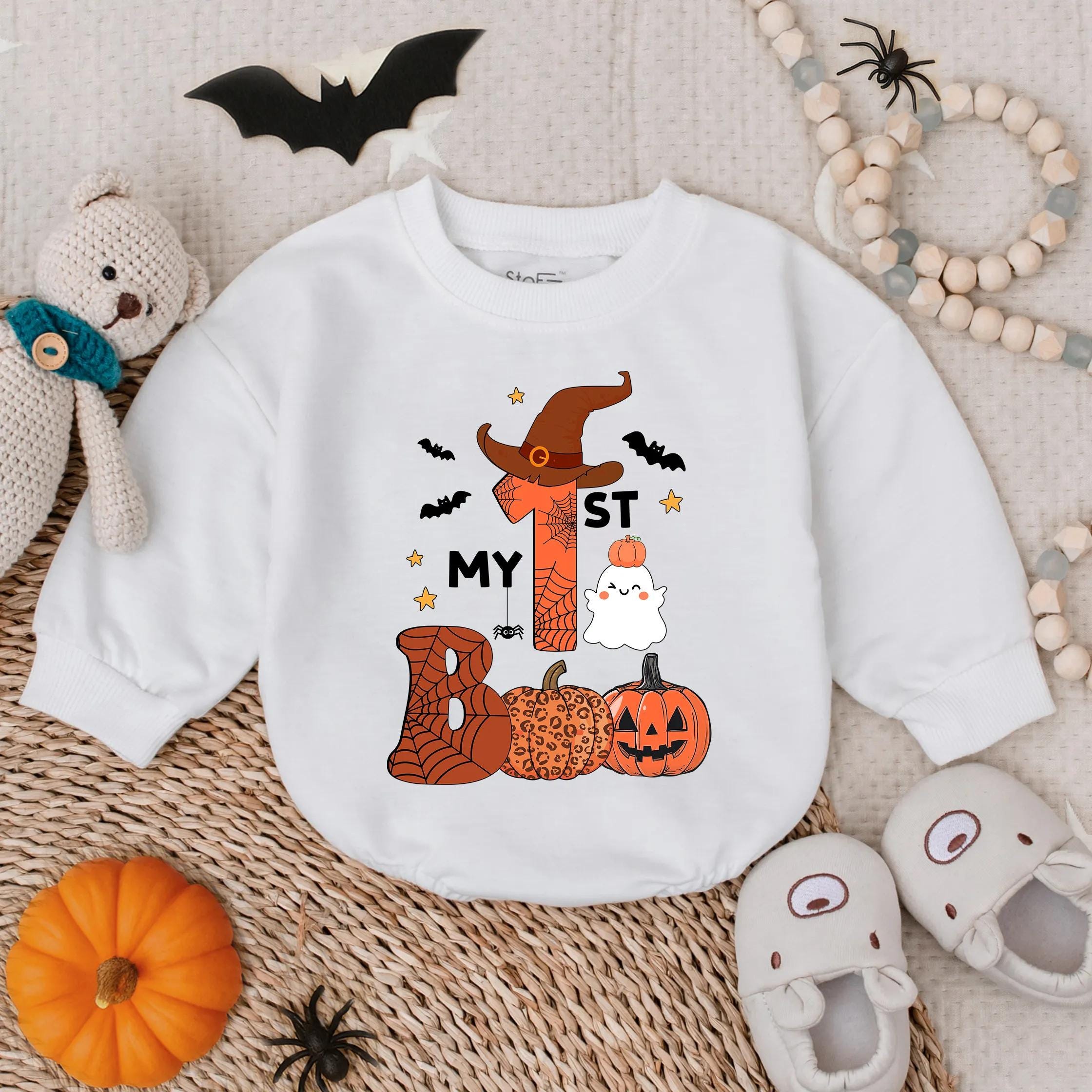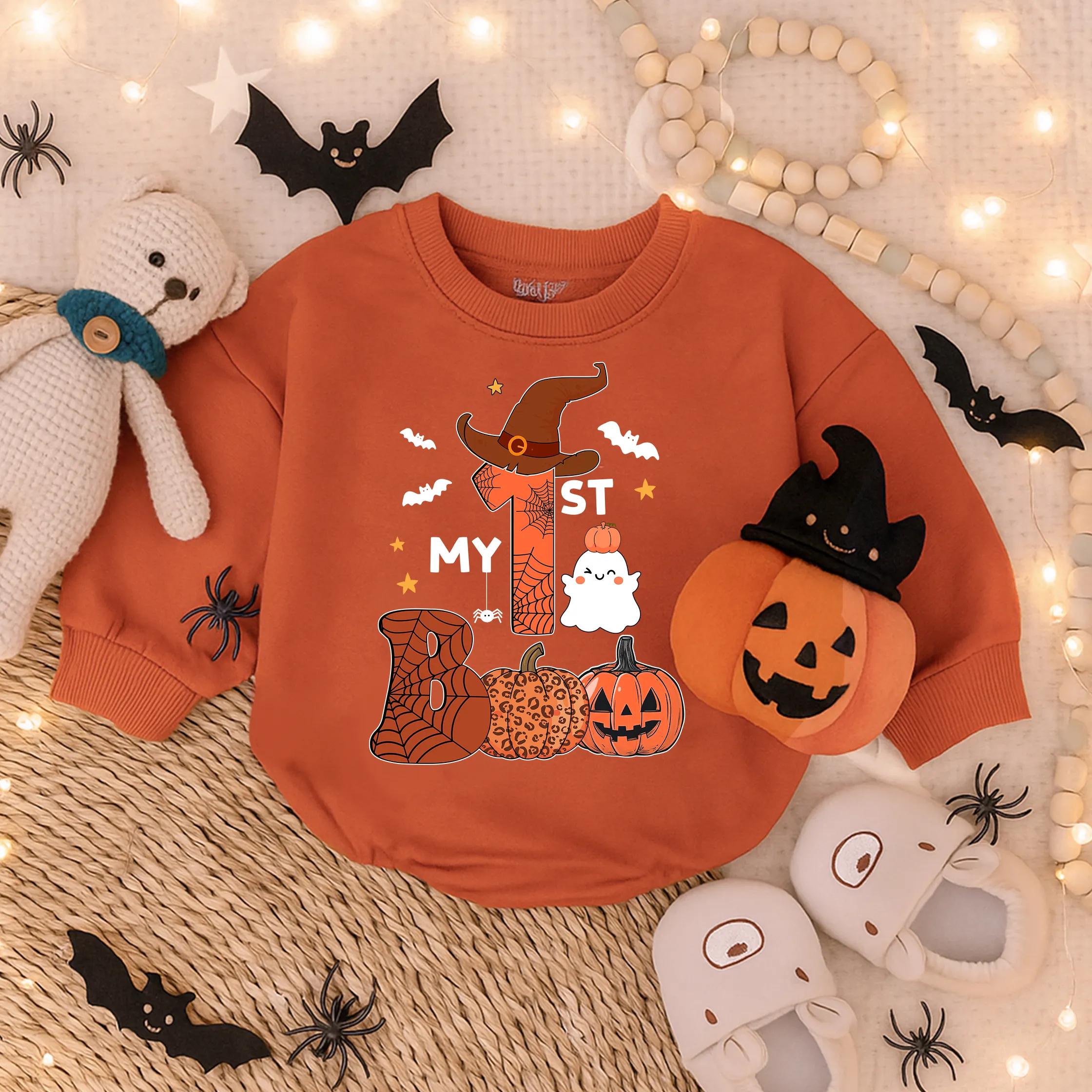 Celebrate your little one's first Halloween with a touch of whimsy and festivity. Imagine the joy on their face as they wear this delightful romper, featuring a playful number '1' adorned with a witch's hat and a sneaky little ghost. The warm colors of orange, black, and white bring the spirit of Halloween to life, surrounded by pumpkins, stars, and bats. It's perfect for capturing those precious first moments, whether you're heading to a pumpkin patch or enjoying a cozy family gathering. The bold 'MY 1ST' font adds a celebratory feel, making it an adorable keepsake for years to come. Wrap your baby in comfort with its soft cotton material, ideal for joyful play or a snug nap. Don't miss the chance to make this holiday memorable — embrace the magic of their first Halloween with this charming romper.