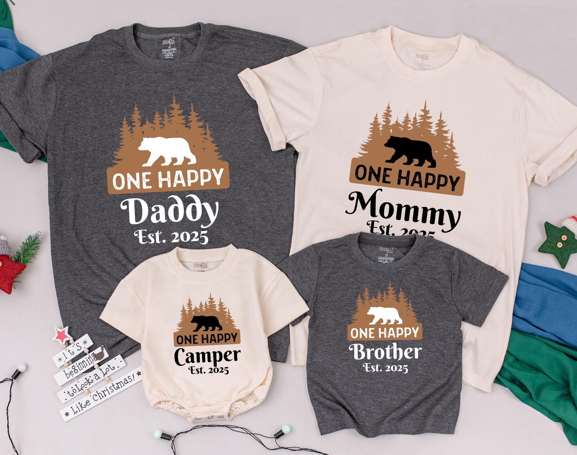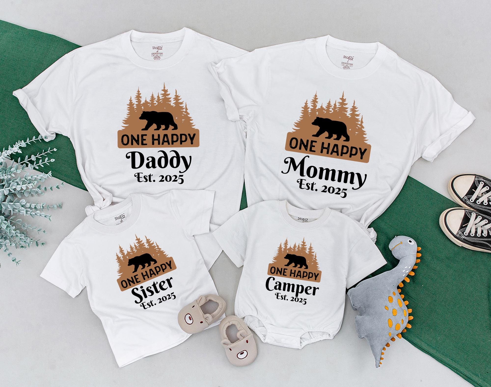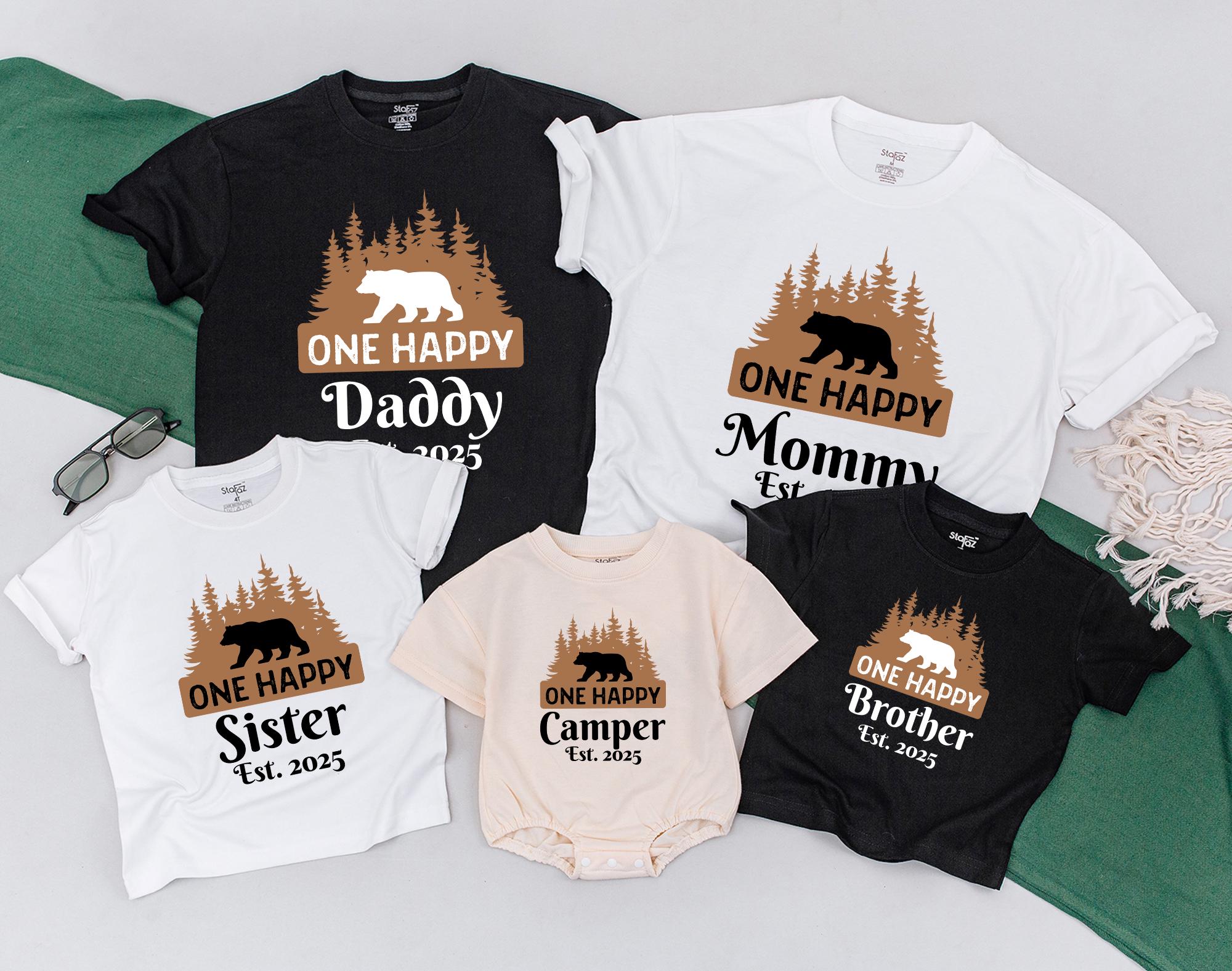 One Happy Camper Family Matching Shirts Personalized Rustic Bear Design Cozy Birthday Outfits Cotton Soft Custom Names Est. 2025 Gift