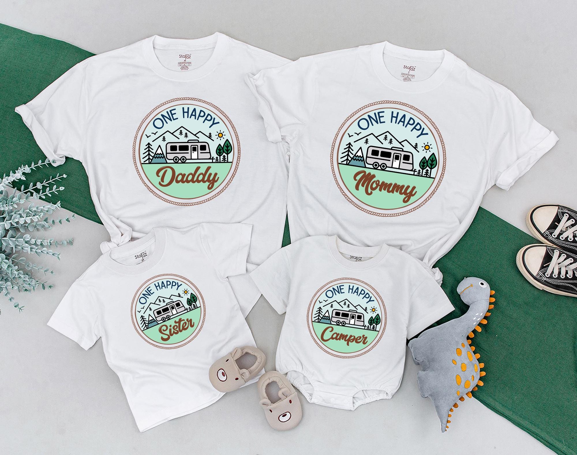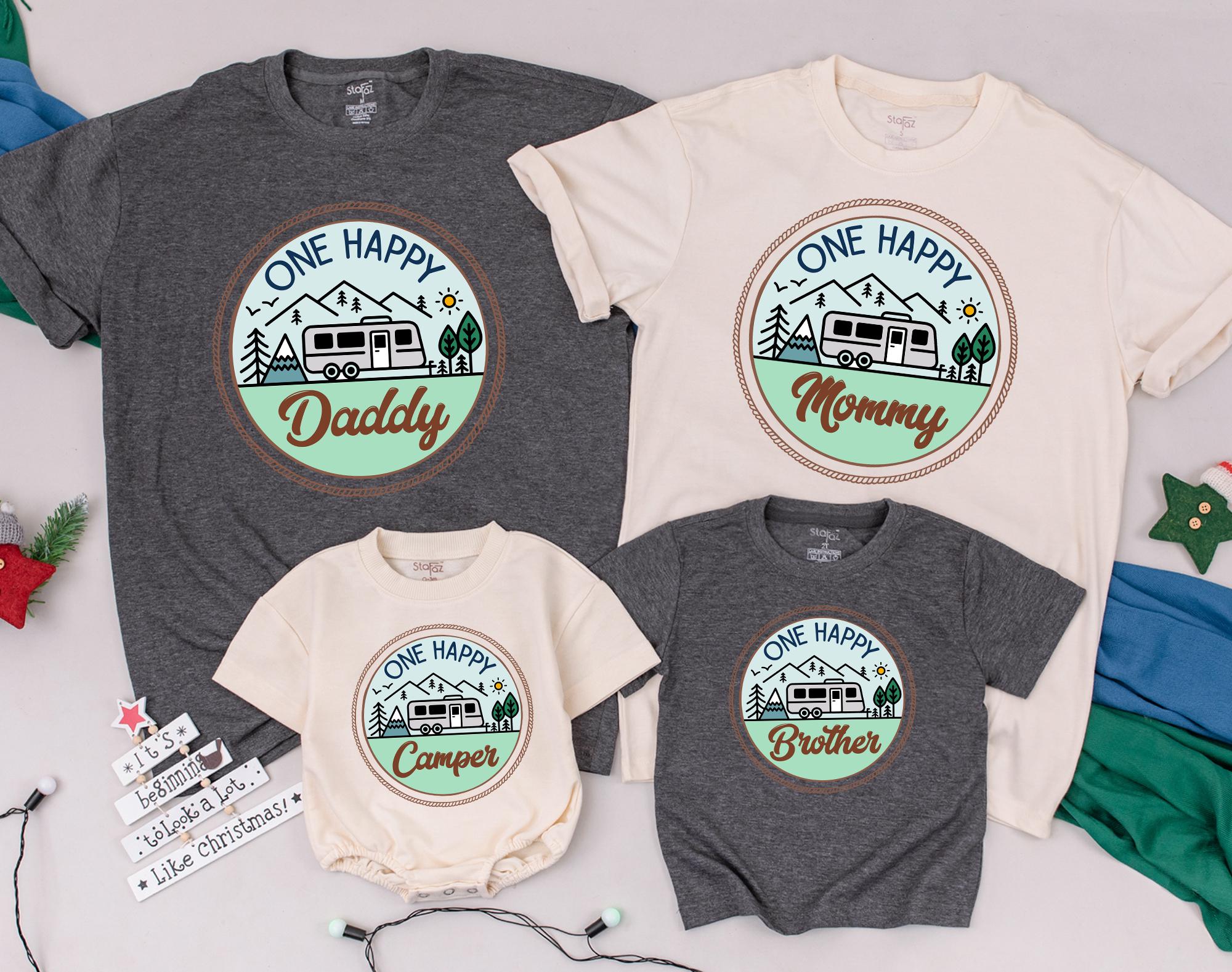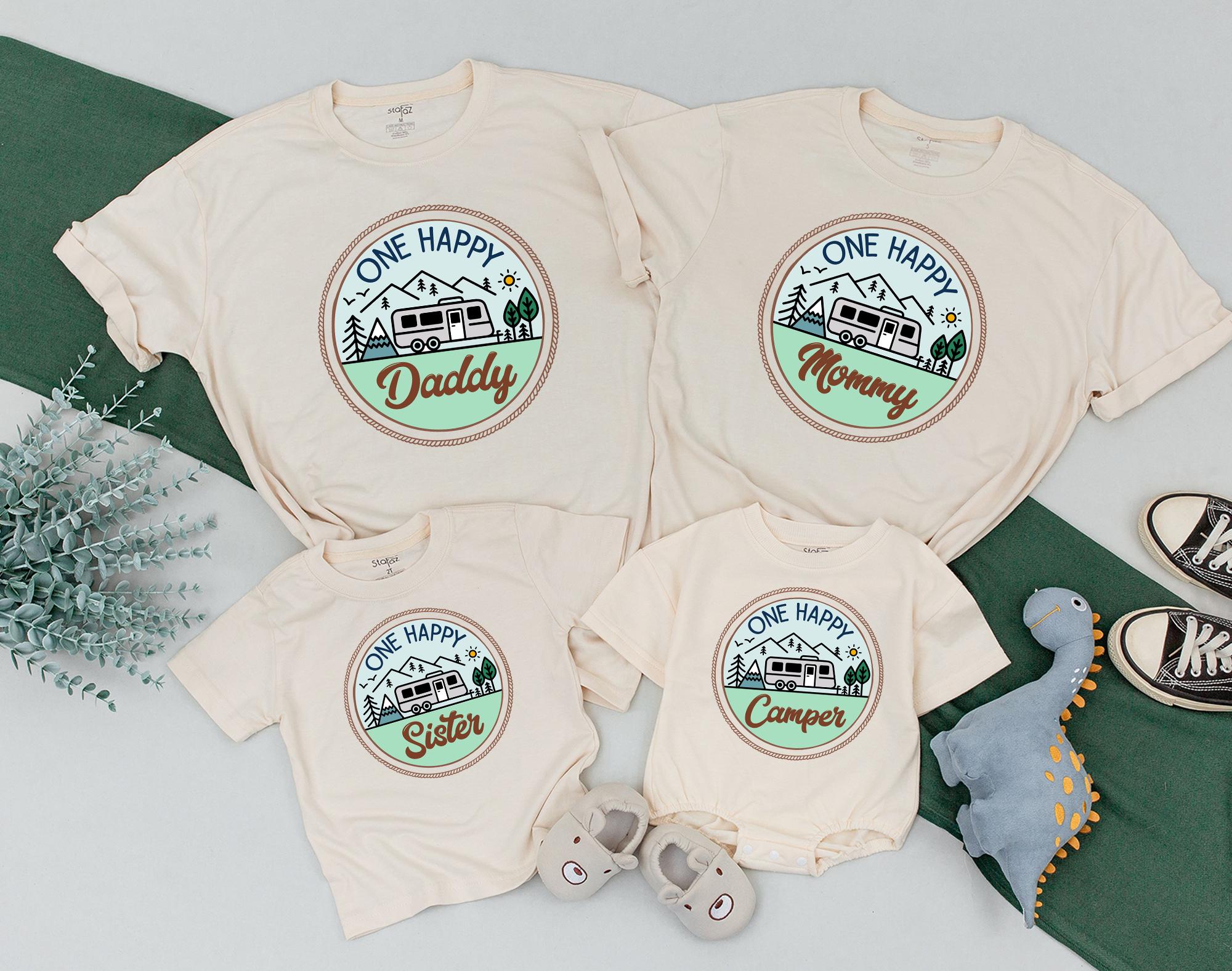 Imagine a perfect day in the great outdoors, where every family member feels the joy of togetherness. This delightful shirt captures that spirit with a charming circular graphic featuring a camper van nestled amid majestic mountains and serene trees. The earthy hues of green, blue, and brown evoke a sense of nature and adventure, making it ideal for a cozy family camping trip or a fun birthday celebration. The playful script proudly declares 'ONE HAPPY' above, with titles like 'Daddy,' 'Mommy,' and 'Sister' below, adding a touch of vintage charm. Perfect for a family photoshoot or a casual day out, this personalized shirt becomes a treasured keepsake, celebrating love and connection. Make a memorable gift by adding a name or date, ensuring it becomes a cherished reminder of shared adventures. Embrace the joy of family bonding and create lasting memories with this unique piece.