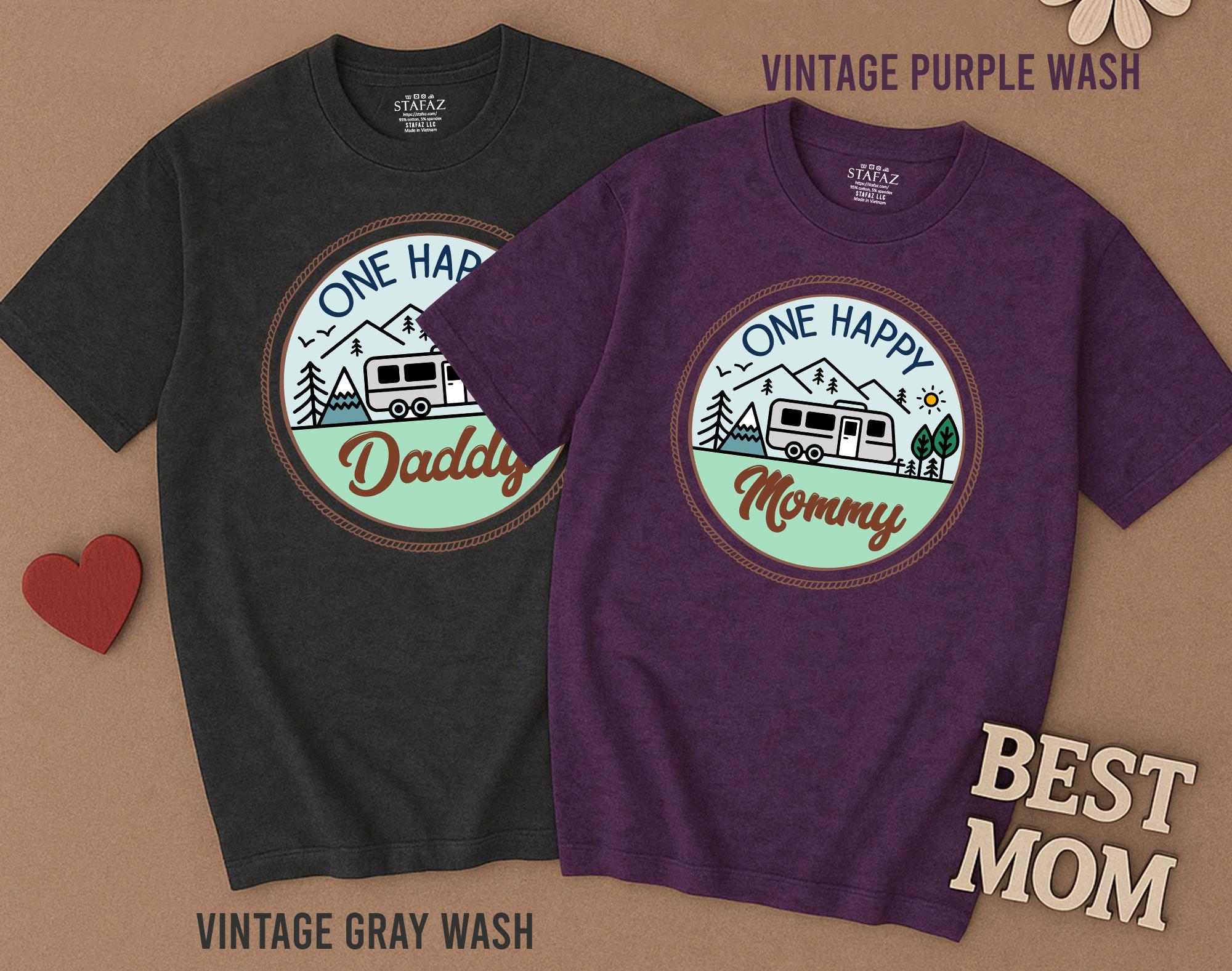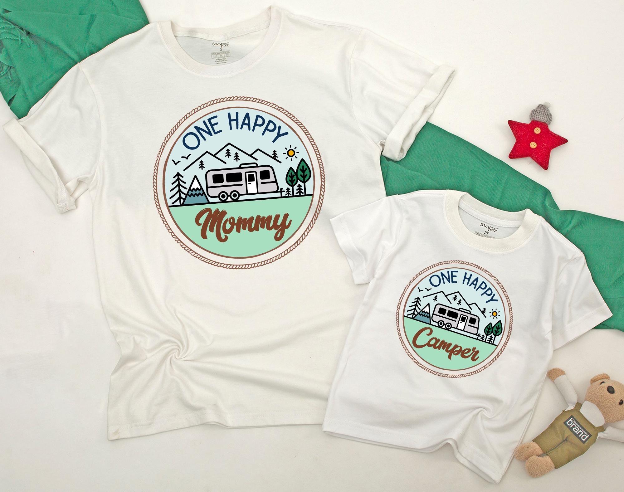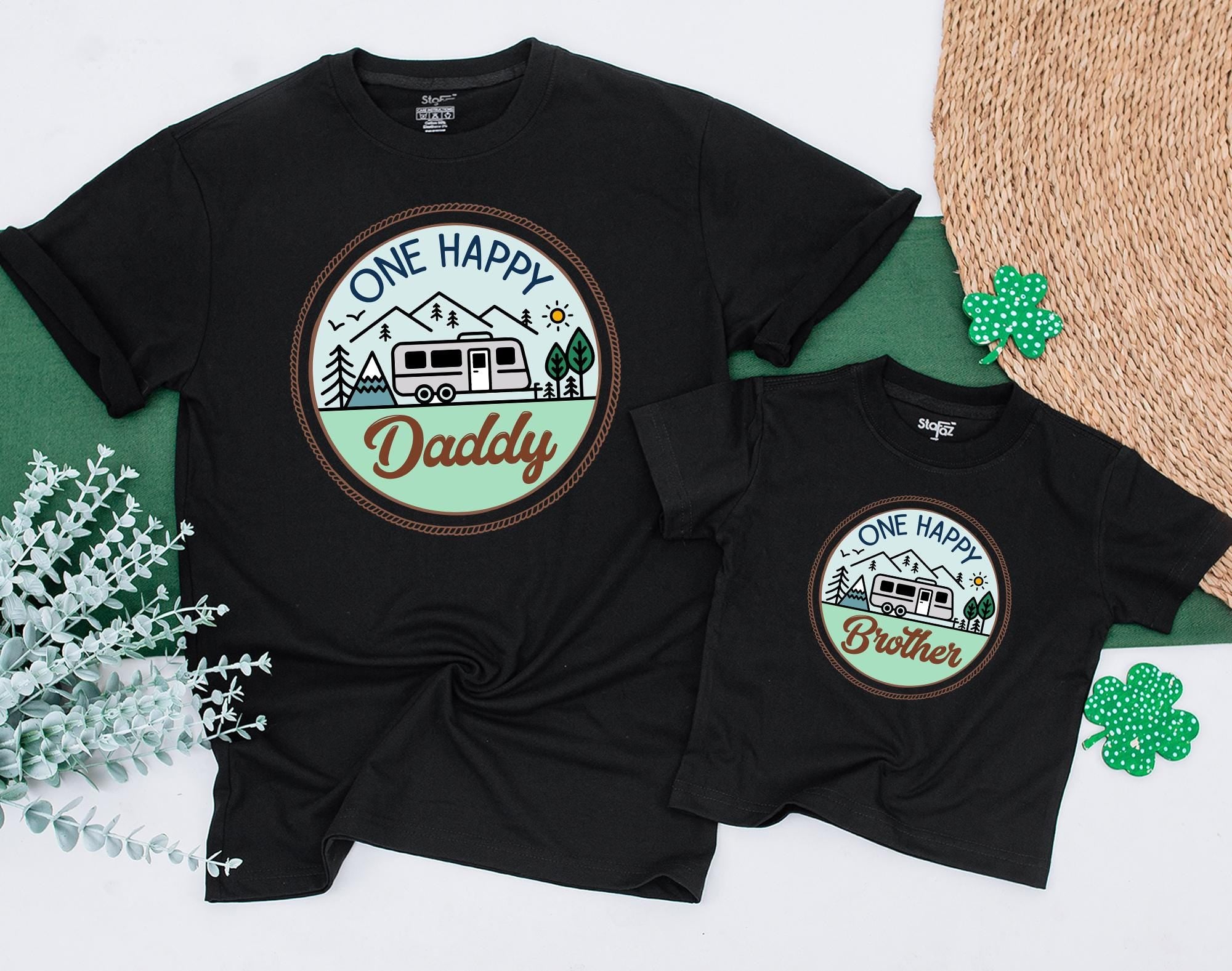 Imagine a perfect day in the great outdoors, where every family member feels the joy of togetherness. This delightful shirt captures that spirit with a charming circular graphic featuring a camper van nestled amid majestic mountains and serene trees. The earthy hues of green, blue, and brown evoke a sense of nature and adventure, making it ideal for a cozy family camping trip or a fun birthday celebration. The playful script proudly declares 'ONE HAPPY' above, with titles like 'Daddy,' 'Mommy,' and 'Sister' below, adding a touch of vintage charm. Perfect for a family photoshoot or a casual day out, this personalized shirt becomes a treasured keepsake, celebrating love and connection. Make a memorable gift by adding a name or date, ensuring it becomes a cherished reminder of shared adventures. Embrace the joy of family bonding and create lasting memories with this unique piece.
