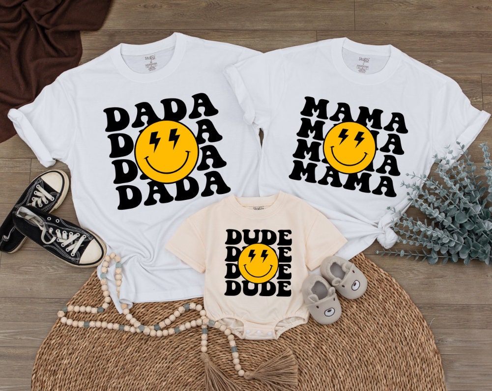 Imagine the joy on a little one's face as they celebrate their birthday with this delightful shirt, featuring a bright yellow smiley with quirky lightning bolt eyes. Its vintage, distressed look adds a touch of nostalgia, while playful words like 'DADA,' 'MAMA,' 'MINI,' and 'DUDE' capture the fun spirit of family togetherness. Whether you're at a family gathering or capturing moments in a photoshoot, these matching outfits create lasting memories and reinforce bonds. Soft cotton ensures comfort, making it perfect for a day full of play and laughter. Personalize it with a name to transform it into a cherished keepsake that stands out in any celebration. Capture these precious moments and let your family shine in coordinated style.