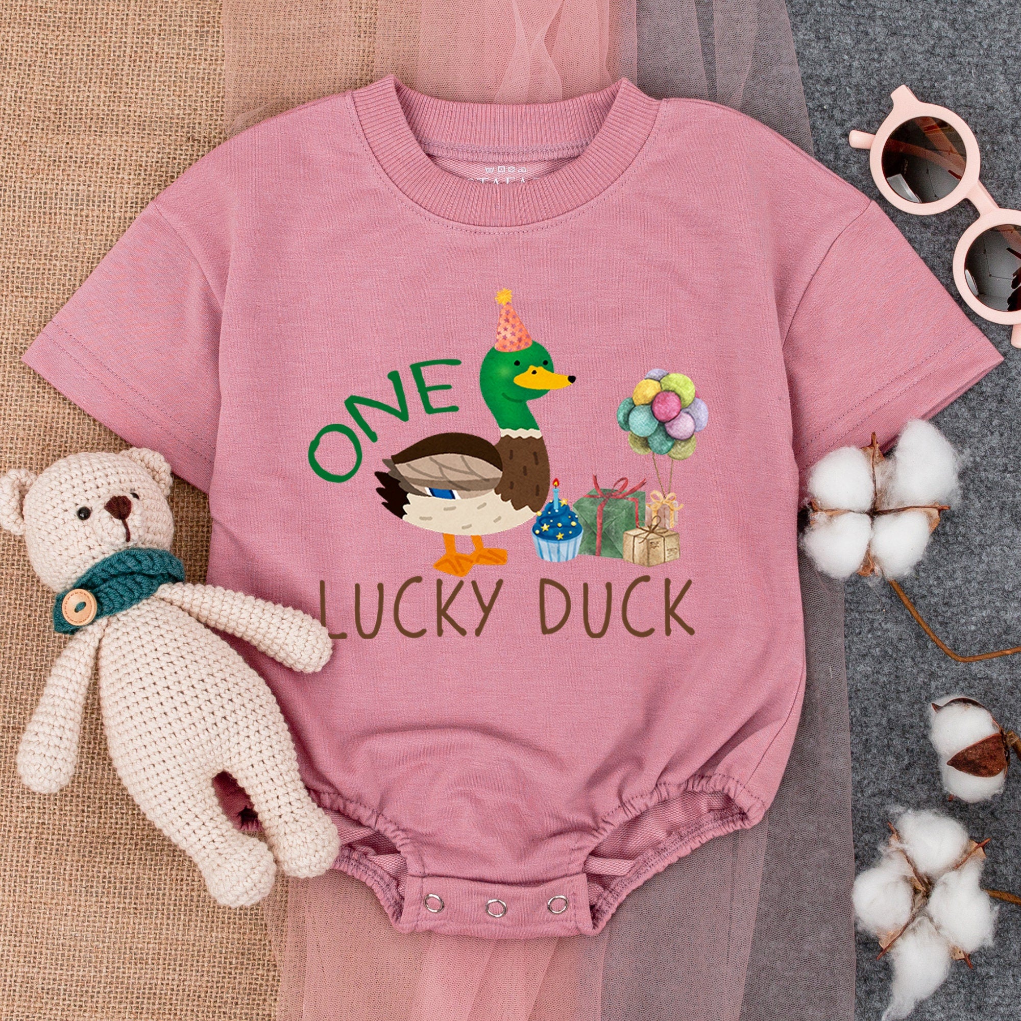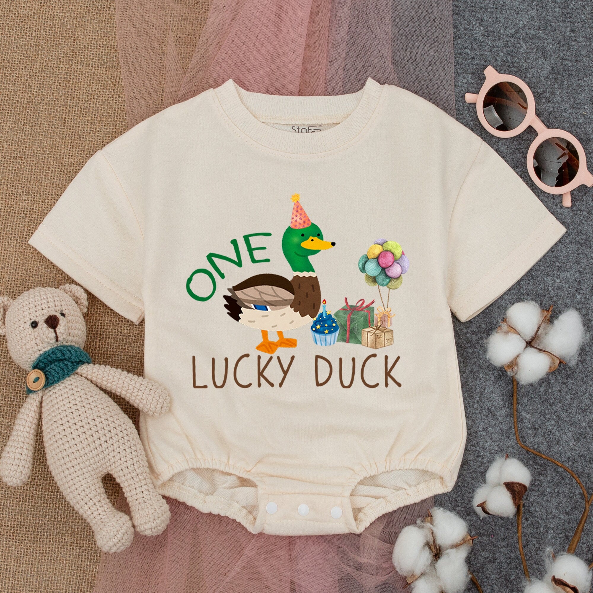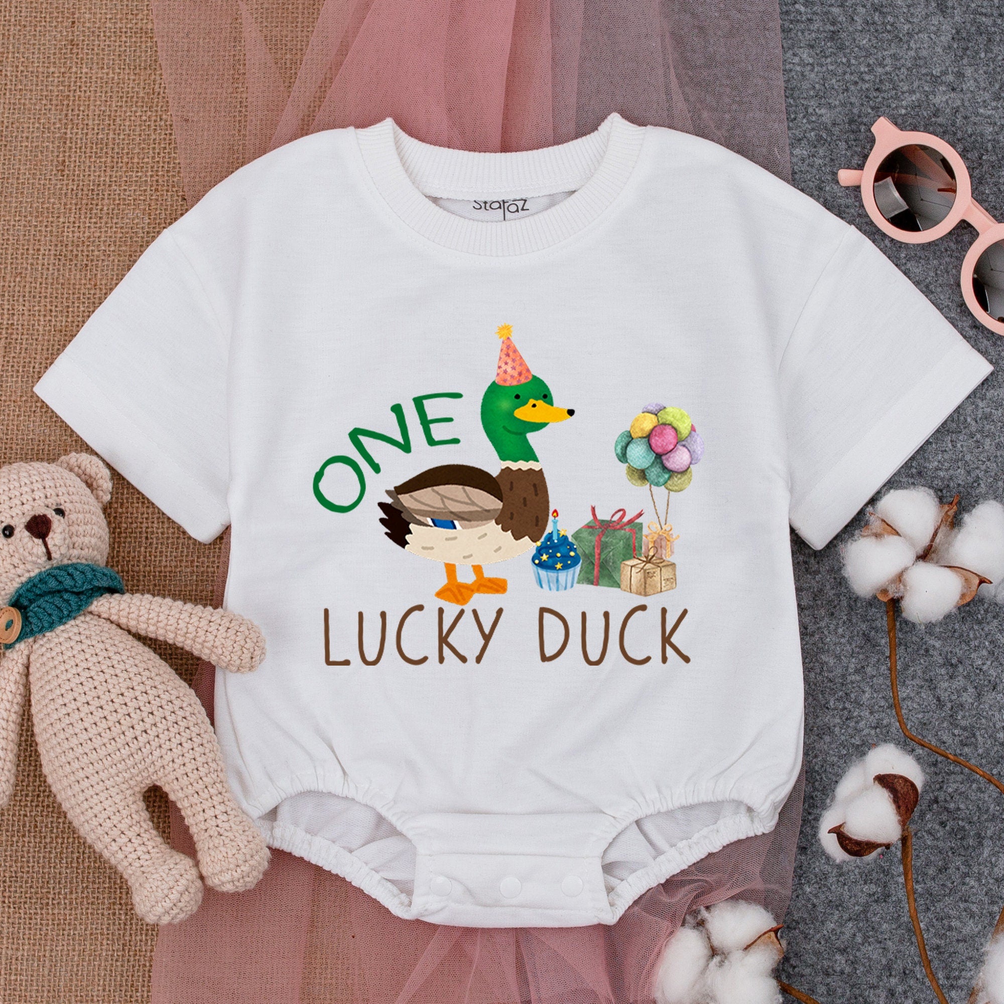 ONE Lucky Duck Baby Romper 1st Birthday Outfit with Party Hat and Balloons Soft Cotton Comfortable Playful Design Boy Toddler Celebration
