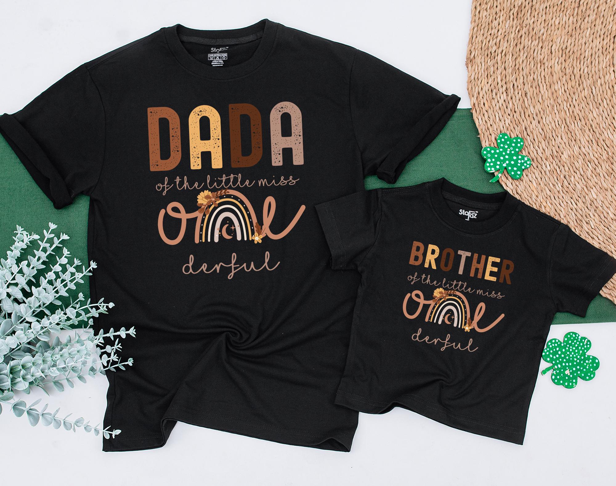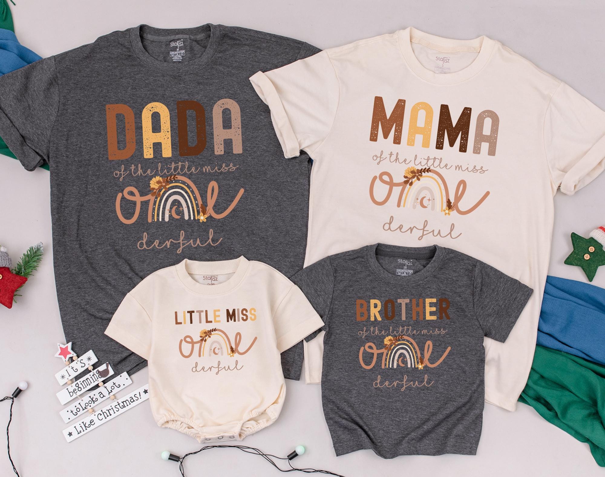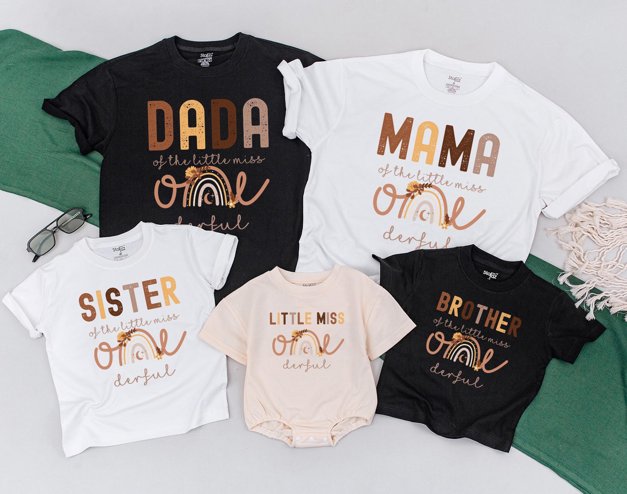 Celebrate a little one's first birthday with a touch of boho charm and family love. Picture the joy of a sunny afternoon party where everyone wears a matching shirt adorned with earthy tones of brown, orange, and beige. Each shirt proudly displays titles like 'DADA,' 'MAMA,' or 'SISTER,' followed by the sweet phrase 'of the little miss ONEderful' in playful script. A whimsical rainbow graphic ties the design together, creating a heartwarming theme that suits a first birthday perfectly. These soft cotton shirts are not just outfits but a way to capture precious memories together—ideal for a fun family photoshoot or a casual day out. Personalize the experience by adding names, making these shirts a cherished keepsake. Embrace the warmth of family bonds and the magic of this milestone celebration.