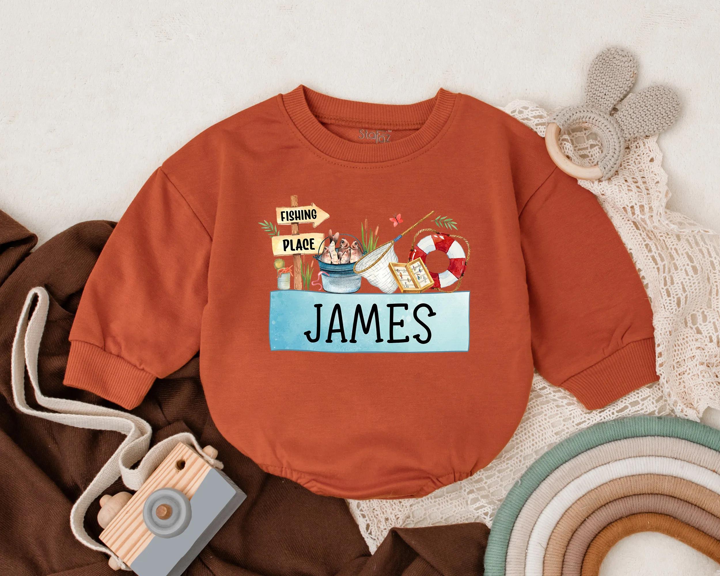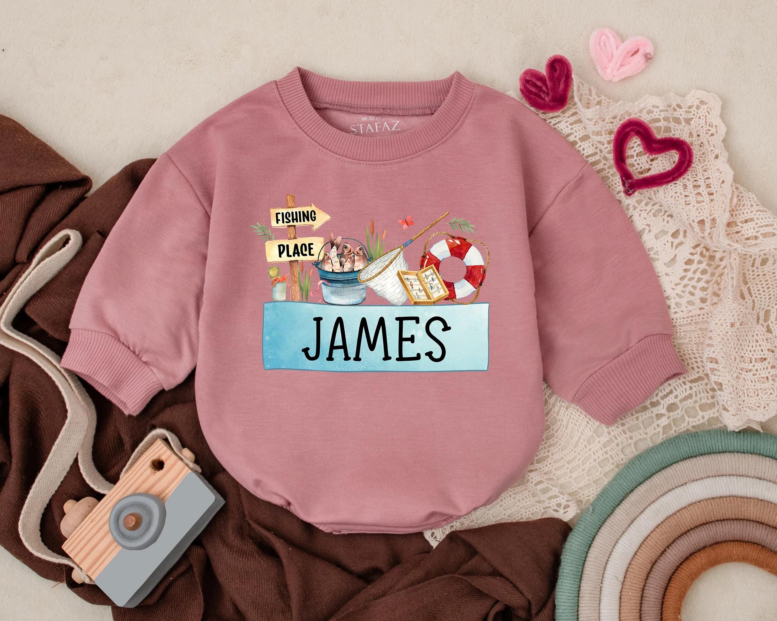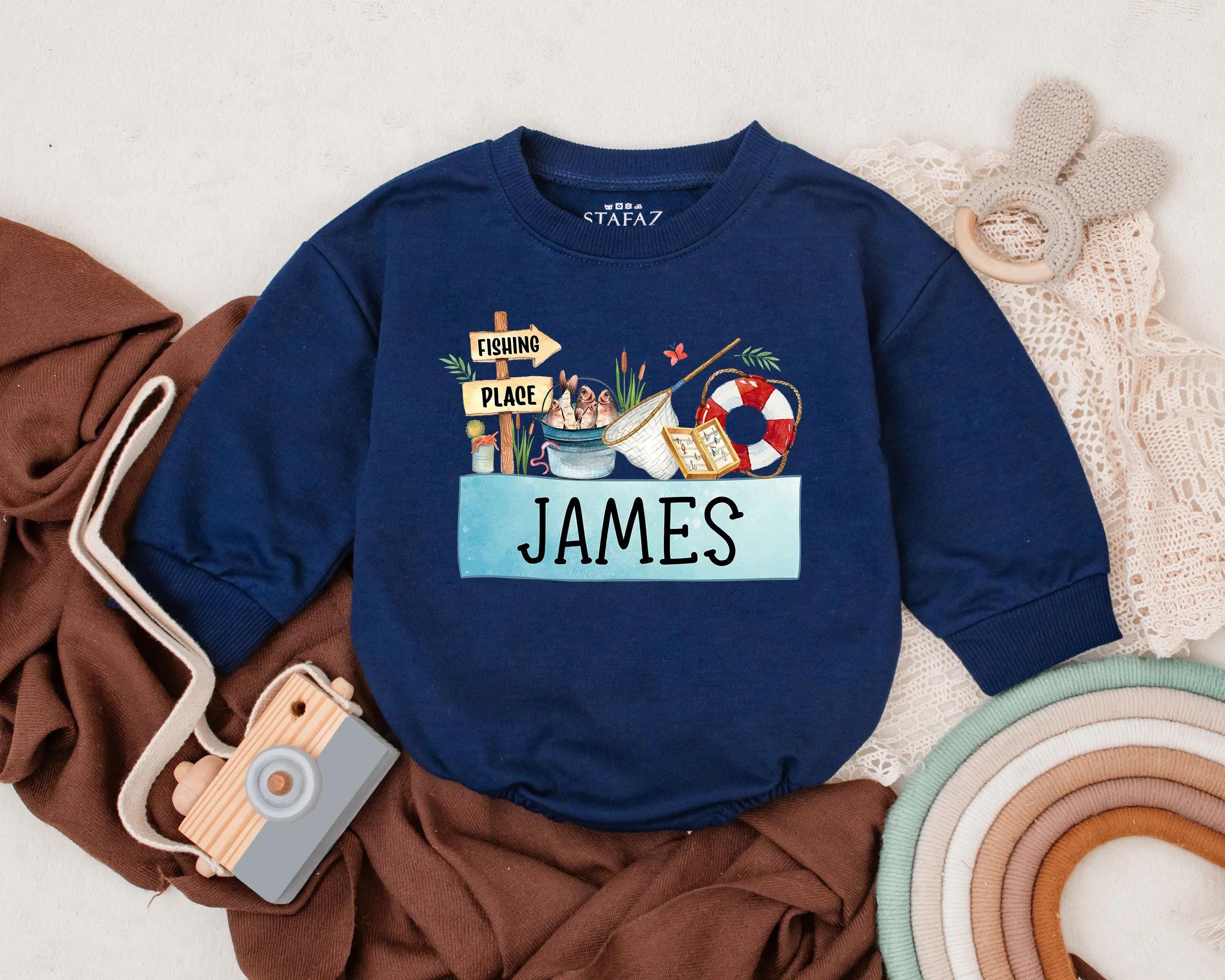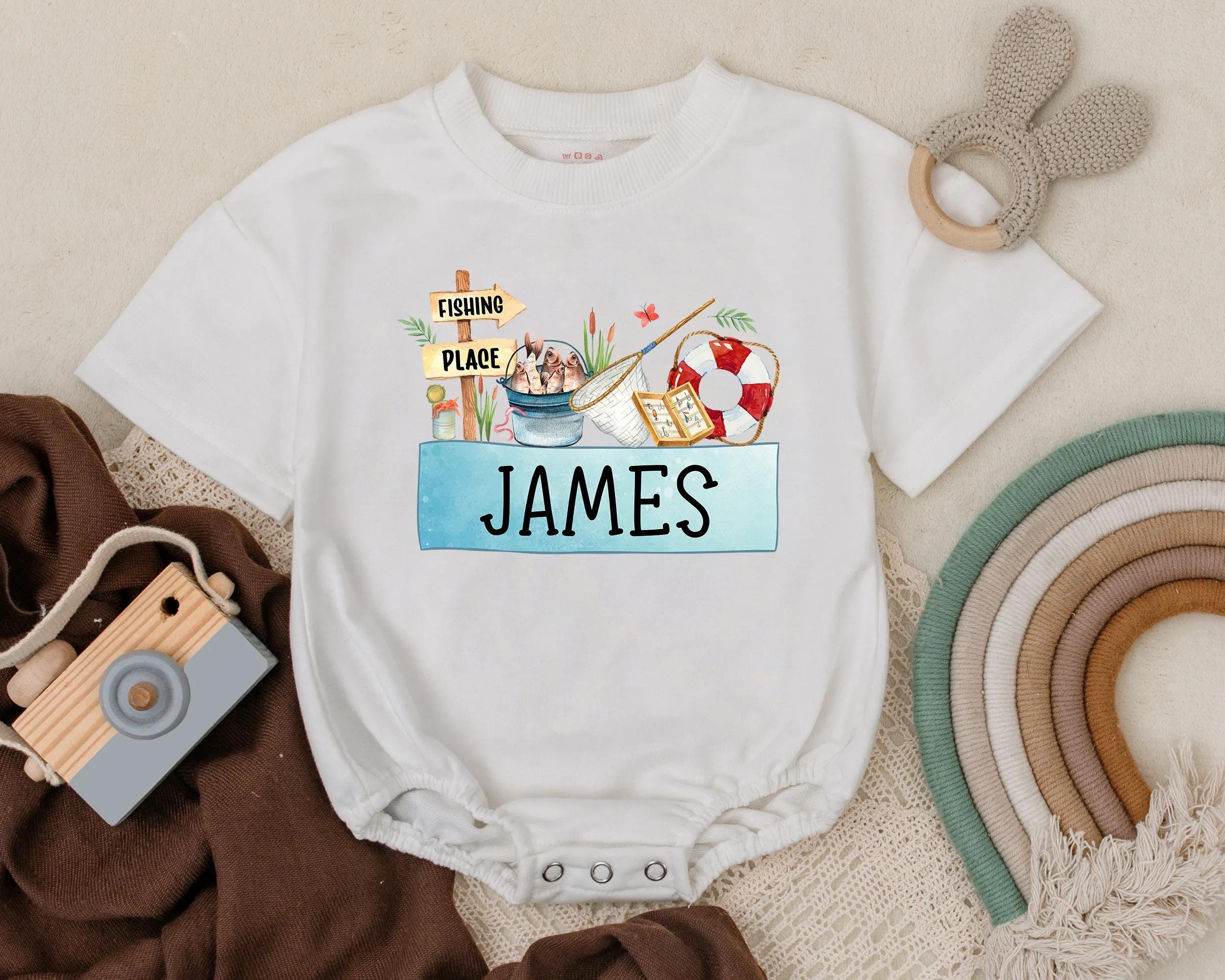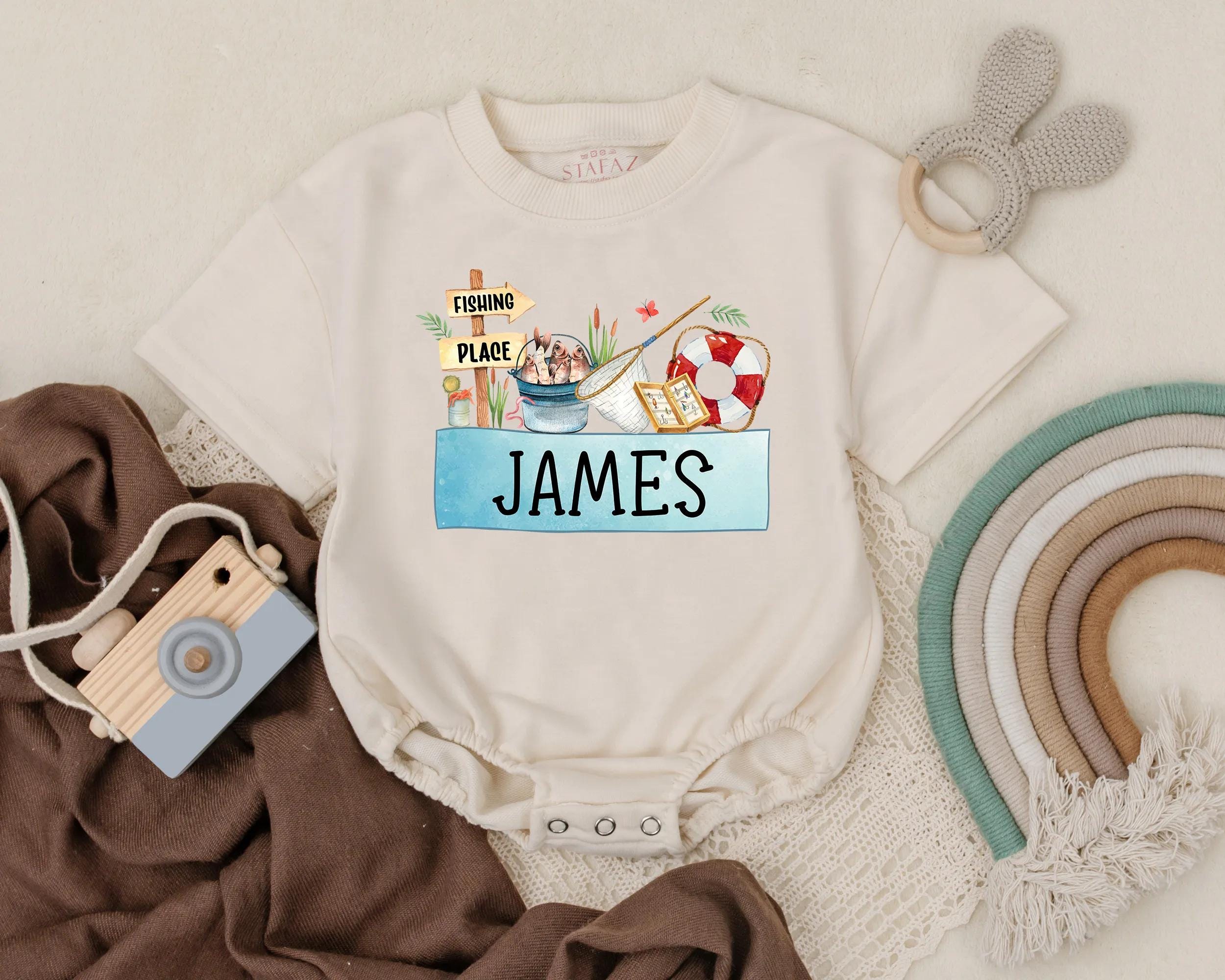 Imagine your little one delighting in the playful world of fishing with this charming romper. The design captures the essence of a sunny day by the water, featuring a vibrant blue rectangle adorned with the bold name 'JAMES' at its center. Whimsical elements like a fishing bucket, a life preserver, and a 'FISHING PLACE' sign add to the cheerful, outdoor theme. Crafted for comfort and style, this romper is perfect for family outings or cozy playdates, sparking joy and imagination. Adding your baby's name transforms it into a keepsake, making it a truly unique gift for birthdays or special occasions. Let this adorable outfit become a part of your child’s cherished memories, wrapped in love and laughter.