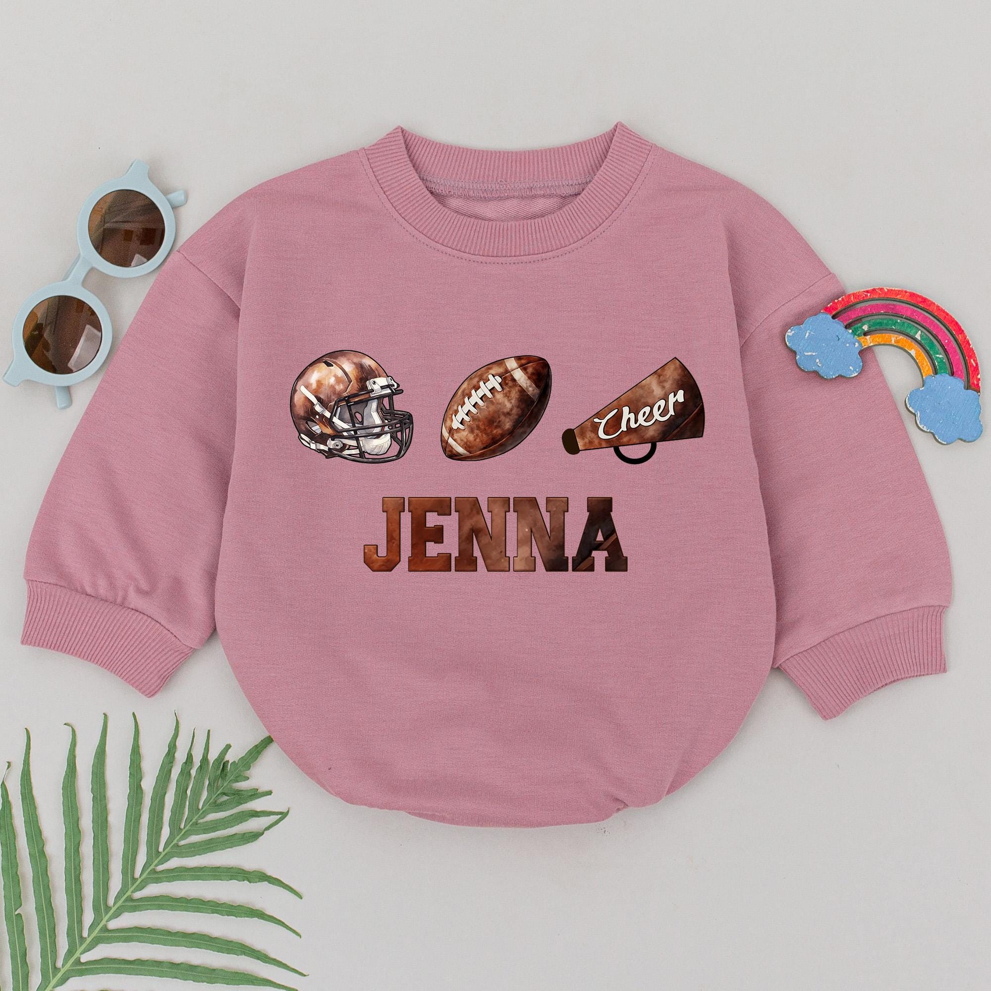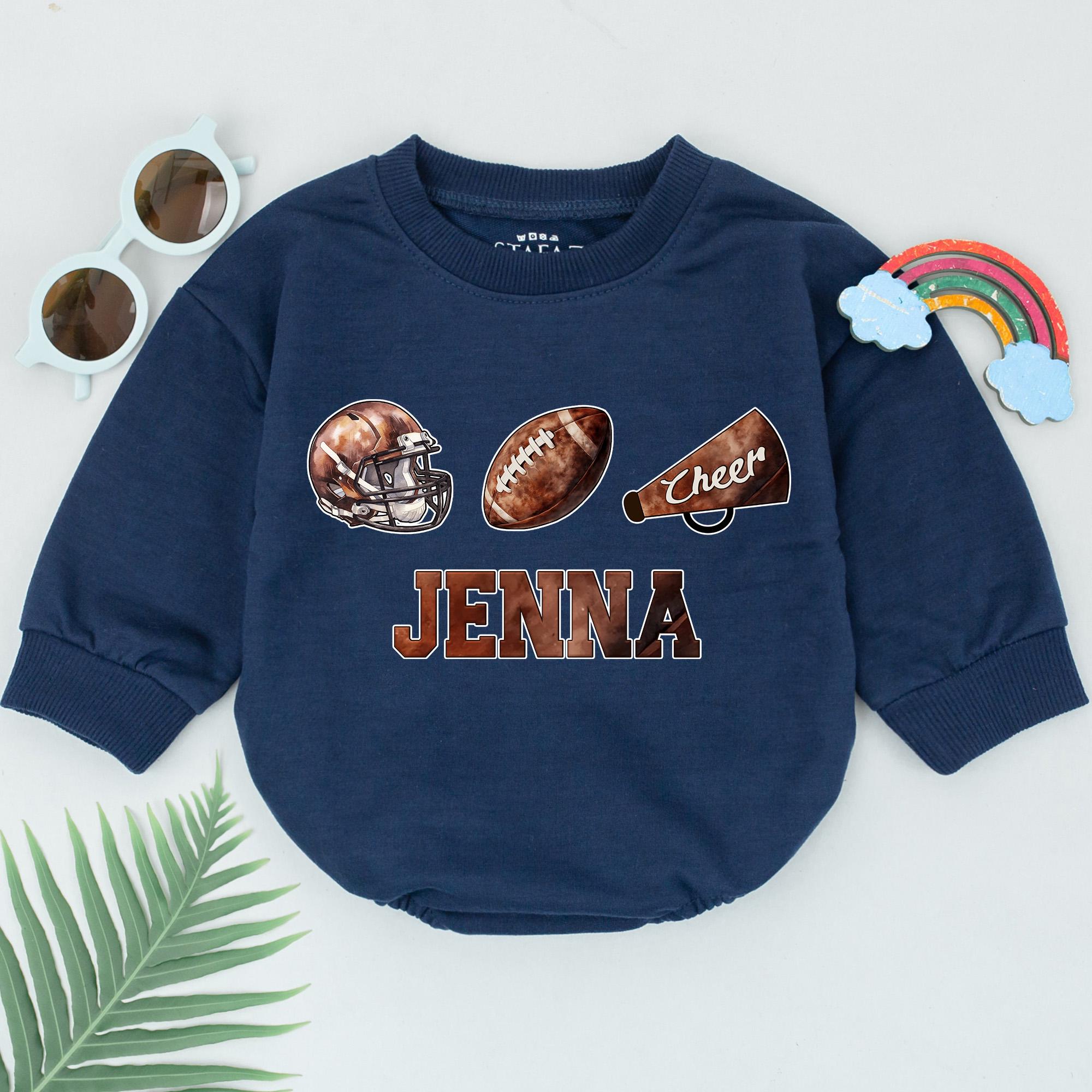 Imagine the excitement of a classic game day, with your little one dressed in this charming romper. The vintage football theme, complete with a helmet, football, and megaphone, brings a nostalgic feel, all wrapped up in warm browns and crisp whites. Picture your baby girl cheered on by the elegantly scripted 'Cheer' on the megaphone, with her name, Jenna, proudly displayed below in bold block letters. Whether it's a family game night or a casual weekend outing, this soft cotton romper captures the spirit of team pride and playful memories. Customizing this outfit with her name turns it into a cherished keepsake, perfect for celebrating milestones or simply enjoying everyday moments. This romper is more than just an outfit; it's a touchstone for joyful memories and family bonds. Capture the essence of a classic game day and share in the nostalgia with this unique, personalized gift.
