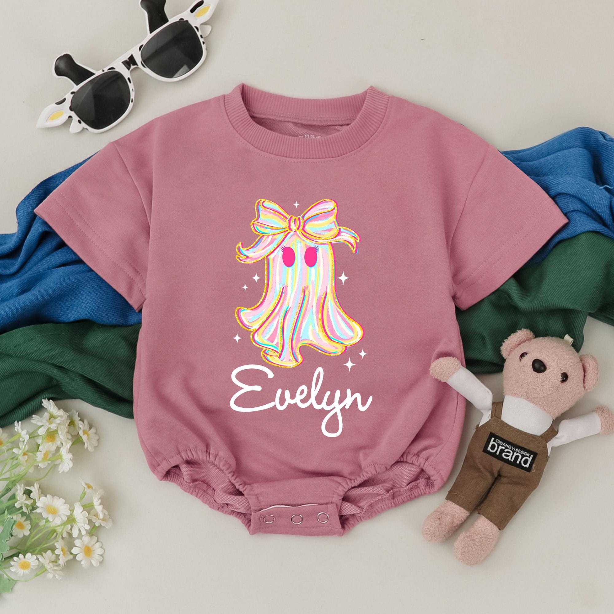 Personalized Baby Girl Halloween Romper with Whimsical Ghost and Bow Birthday Outfit Soft Cotton Custom Name Evelyn Festive Holiday Gift