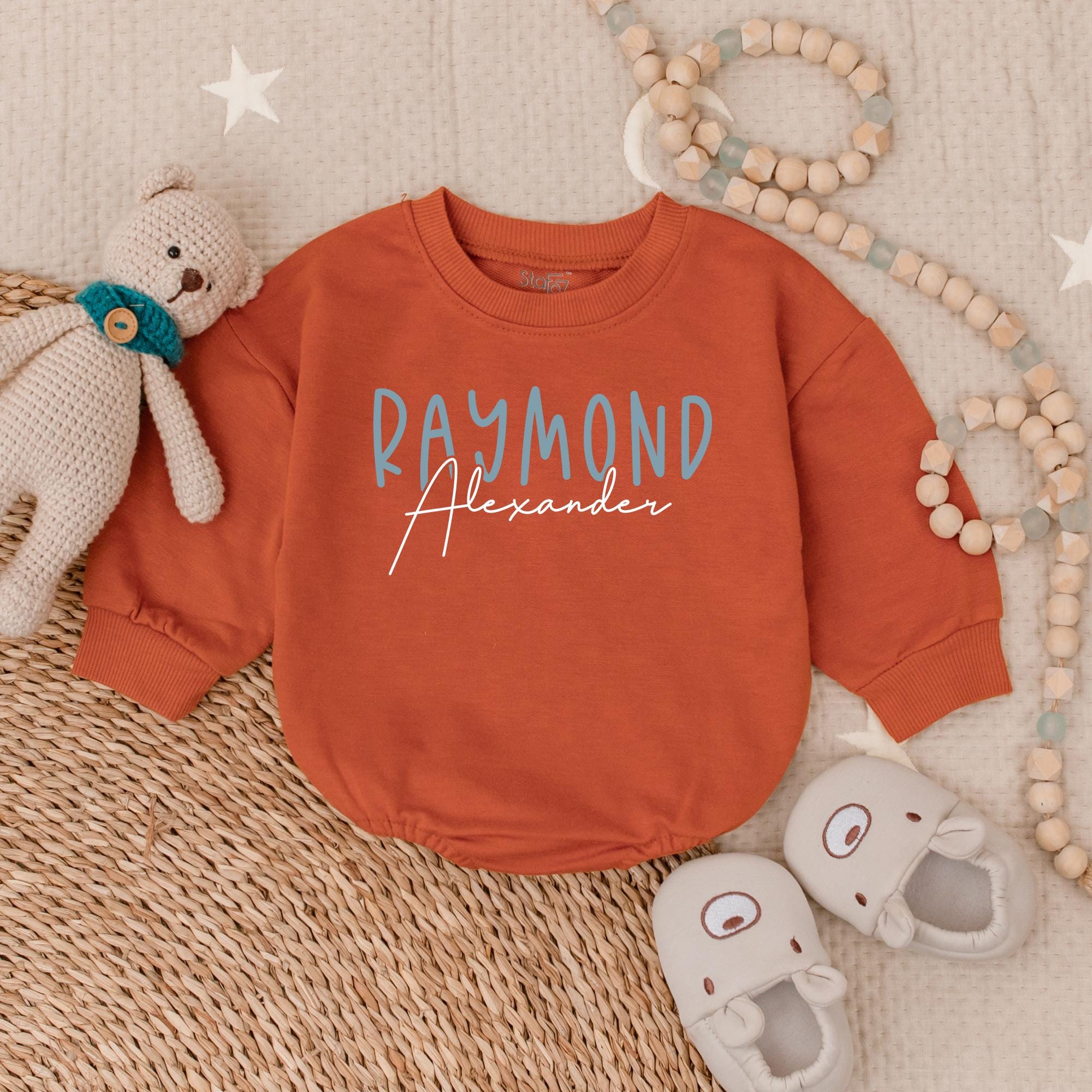 Imagine the joy of seeing your little one wrapped in comfort and style, with their name displayed proudly. This baby romper features 'RAYMOND Alexander' in a sophisticated design, where 'RAYMOND' stands out in bold, soft blue, and 'Alexander' adds a personalized touch in elegant cursive. Perfect for cuddling during family gatherings or celebrating special milestones, this cotton romper is as comfortable as it is charming. The minimalist aesthetic ensures your baby's name takes center stage, making each wear a cherished moment. It's more than just clothing; it's a keepsake that transforms everyday occasions into memorable moments. Capture the joy of personalization and create a unique piece that will be treasured for years.