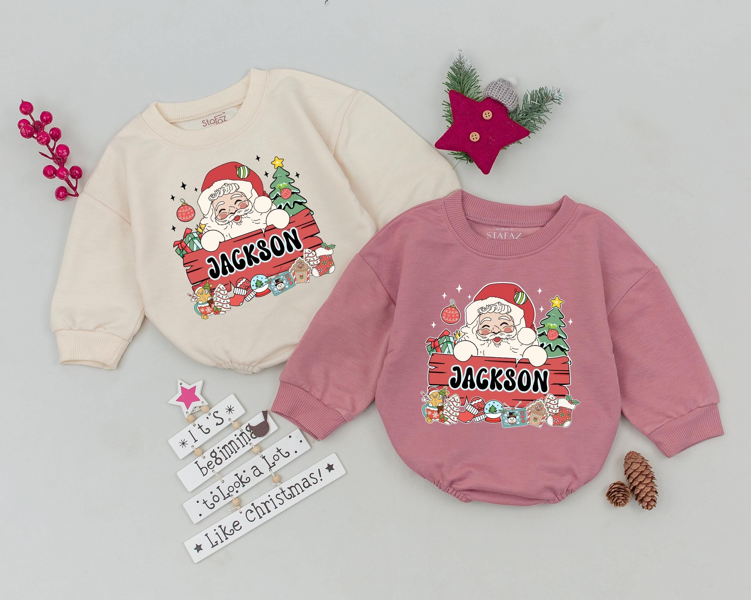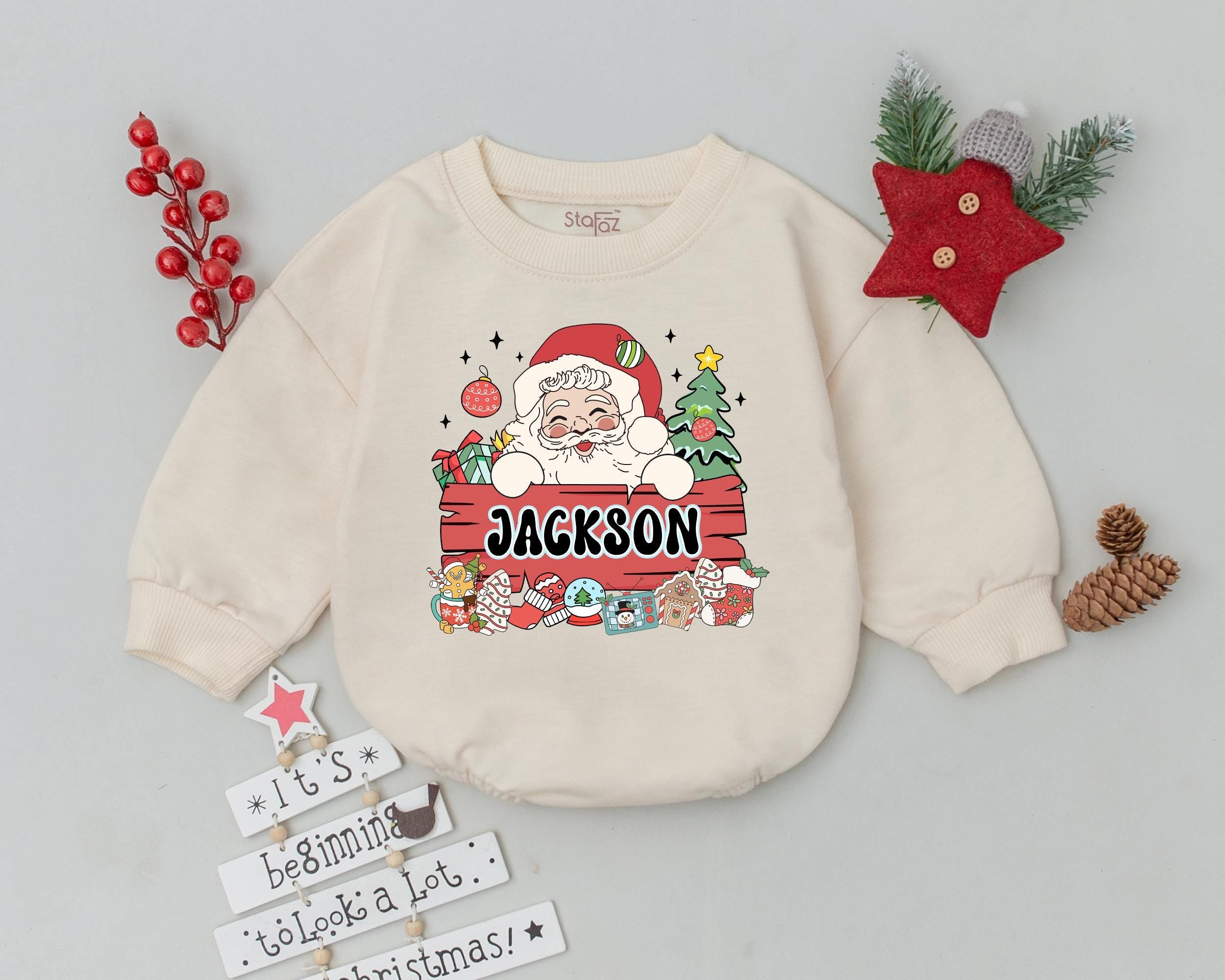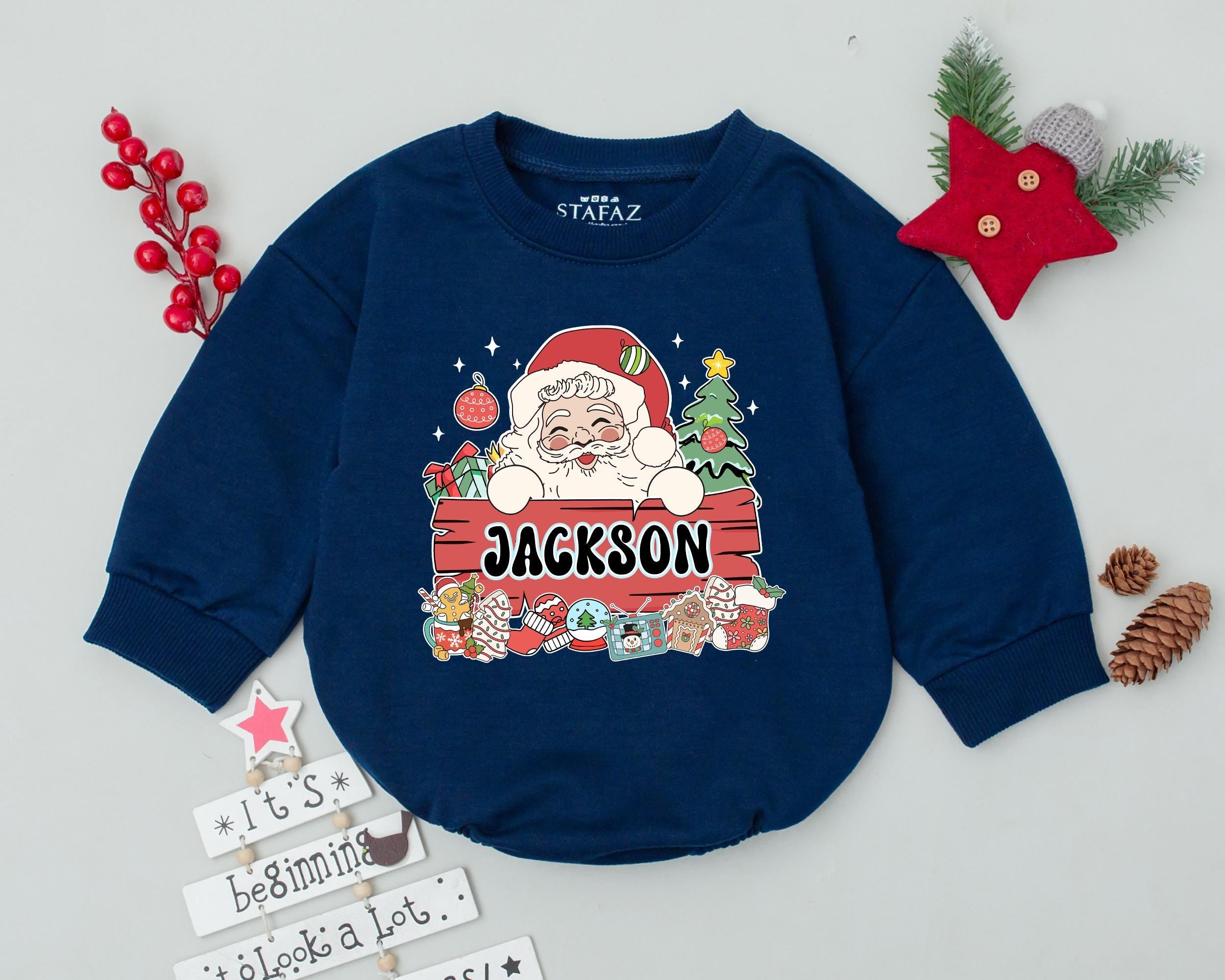 Imagine the joy of baby's first Christmas morning, surrounded by the warmth of family and the magic of the holiday season. This charming romper features a vintage-style Santa Claus with a jolly expression, nestled among festive elements like a twinkling Christmas tree, colorful ornaments, and delightful holiday treats. The name 'Jackson' stands out in bold, playful lettering, adding a personal touch that turns this outfit into a treasured keepsake. Crafted in soft cotton, it's perfect for cozying up during festive gatherings or capturing those precious first holiday photos. This romper is more than just clothing; it’s a celebration of family moments and holiday cheer. Embrace the nostalgia and create a memory that will be cherished for years to come.