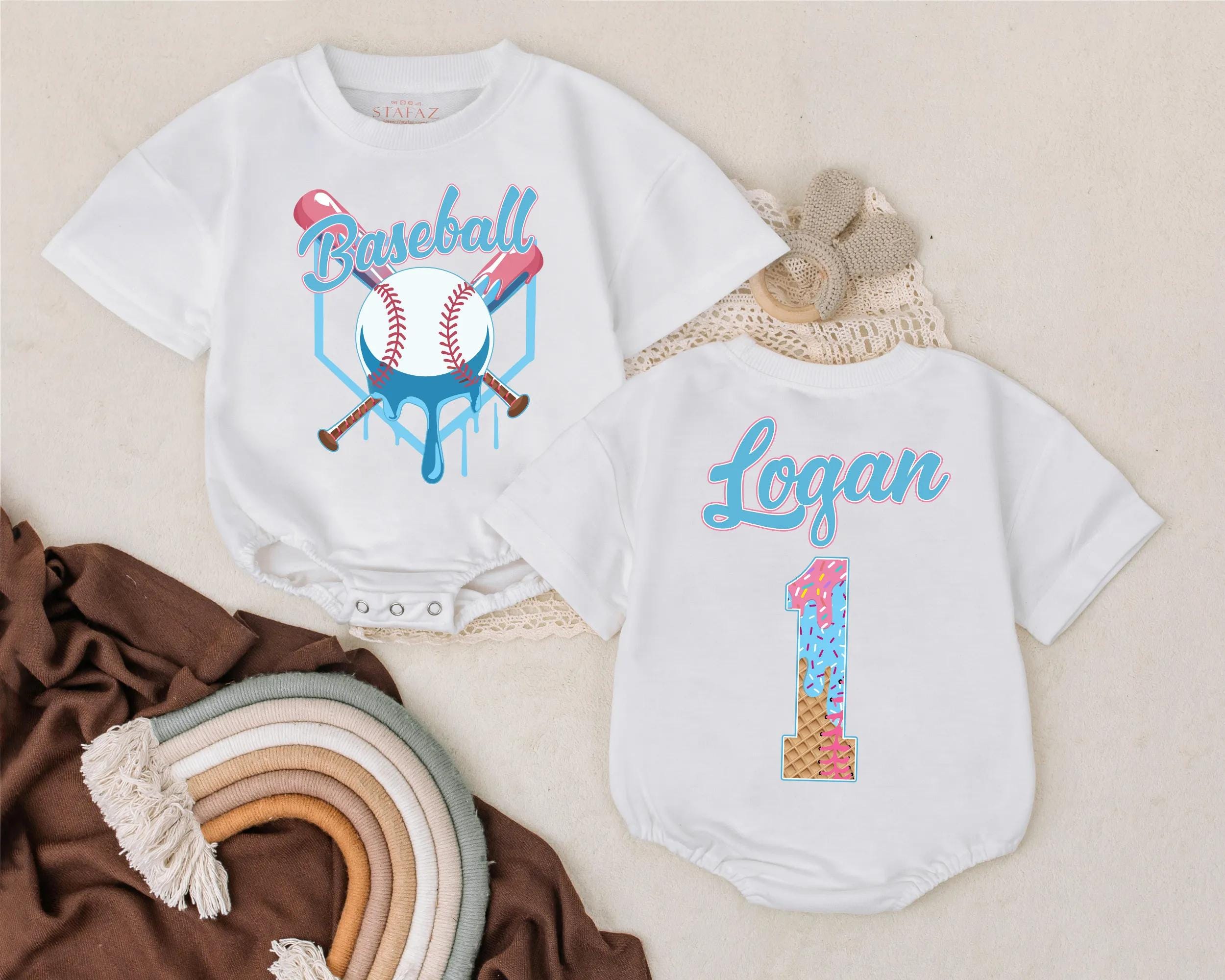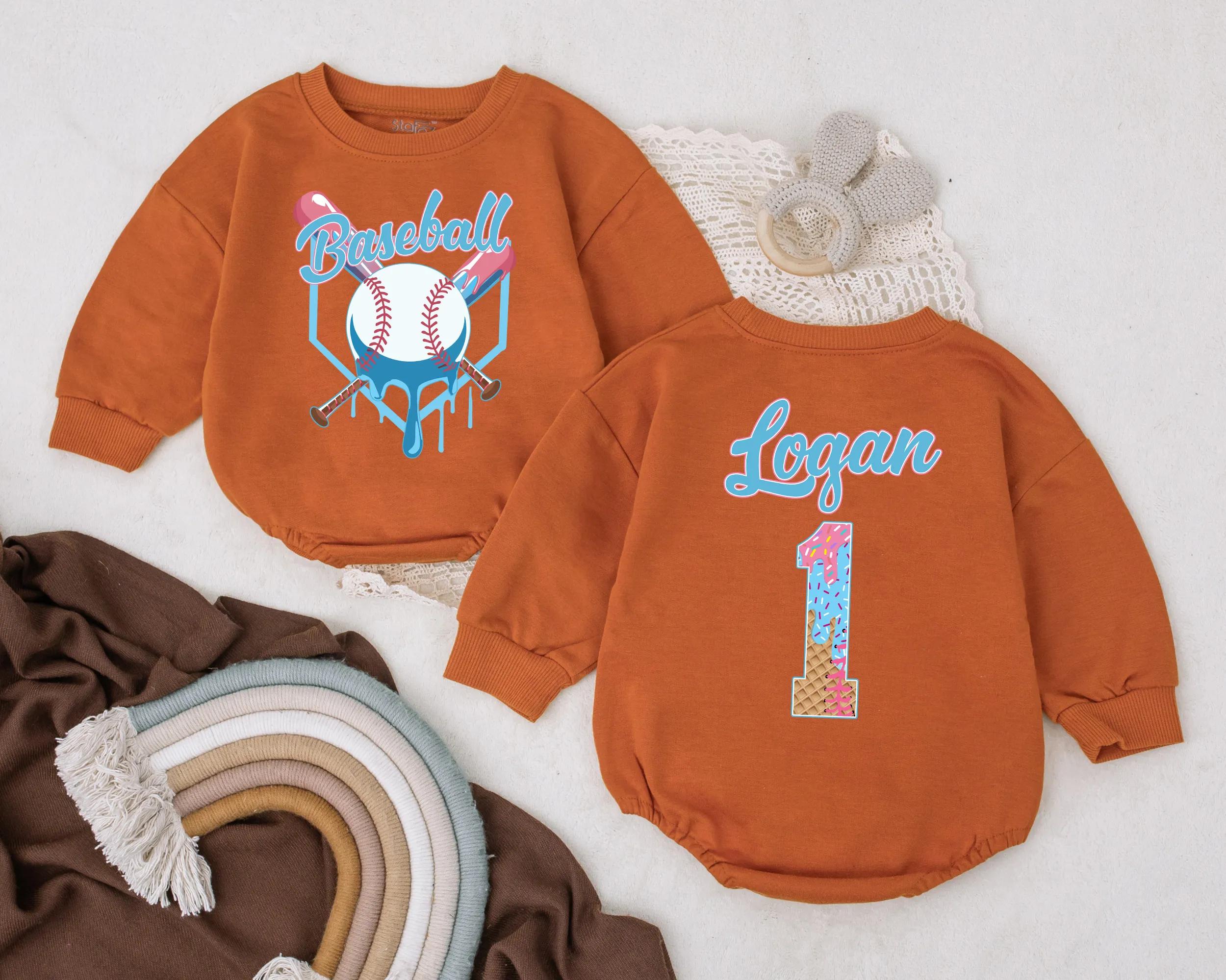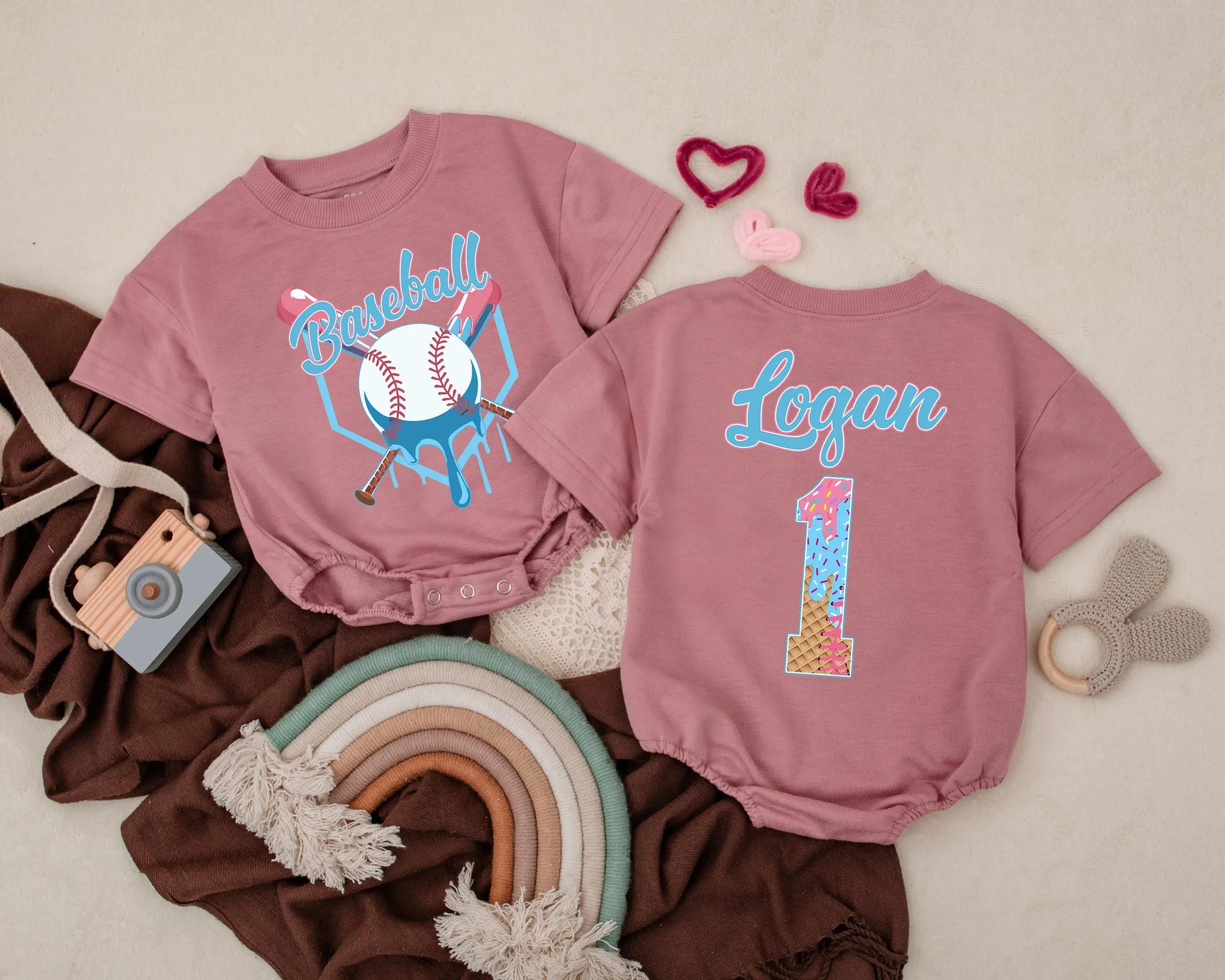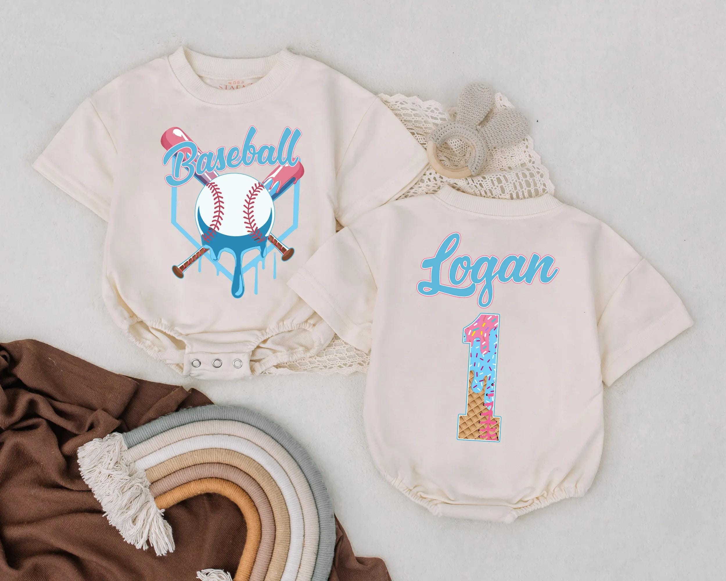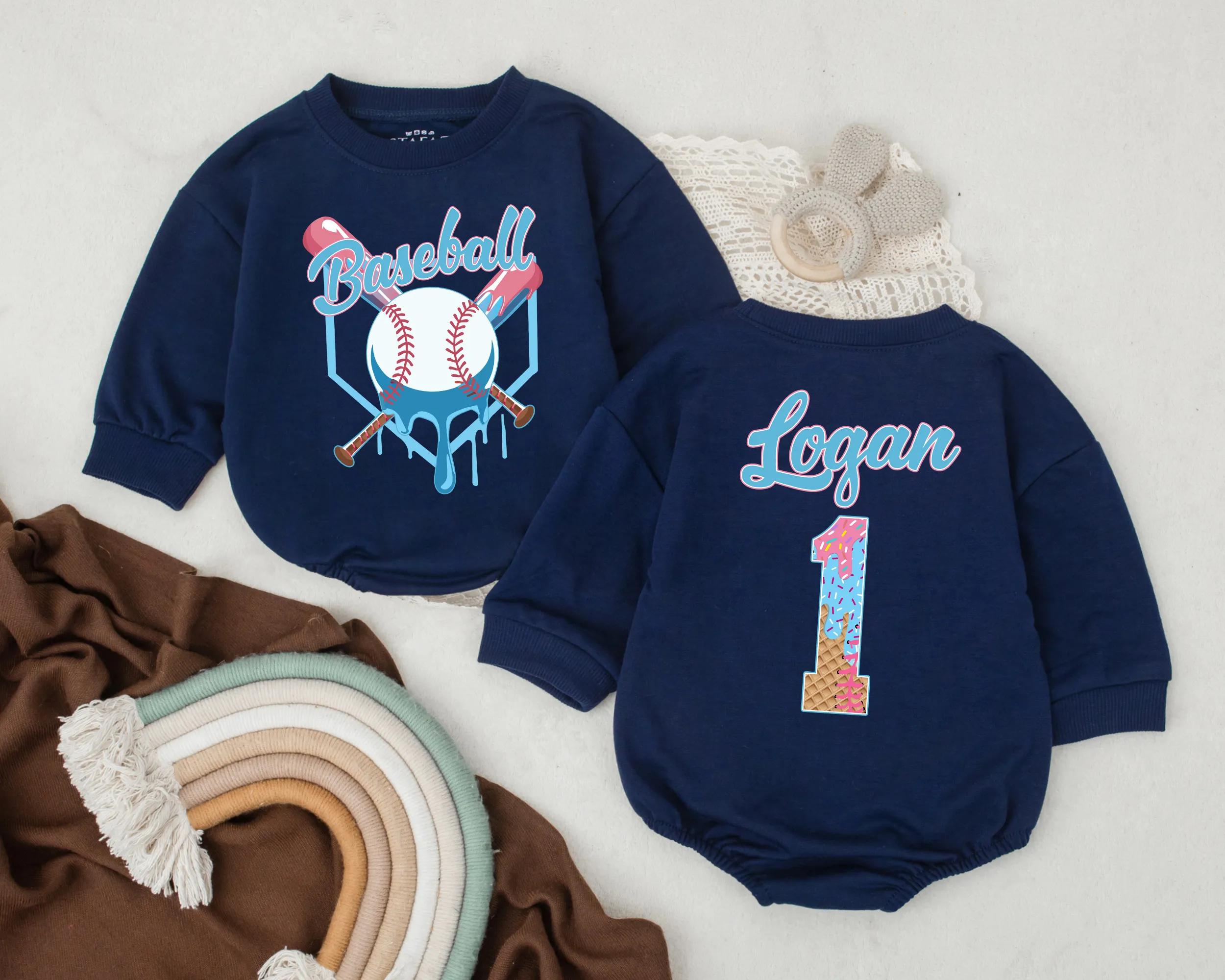 Celebrate your little one's first birthday with a romper that captures the joy of the occasion. This vibrant baby romper features a playful baseball theme, with a bright blue 'Baseball' script and crossed bats on the front. The back showcases your child's name above a starry number '1', bringing a touch of celebration and pride. Imagine your baby wearing this during a fun cake smash or a family gathering, creating memories that last a lifetime. The colorful stars and stripes pattern adds a joyful, energetic vibe, perfect for photos and keepsakes. Personalizing it with your child's name turns this romper into a cherished memento, making it a unique and thoughtful gift. Capture this special moment and let the romper tell a story of love and celebration.