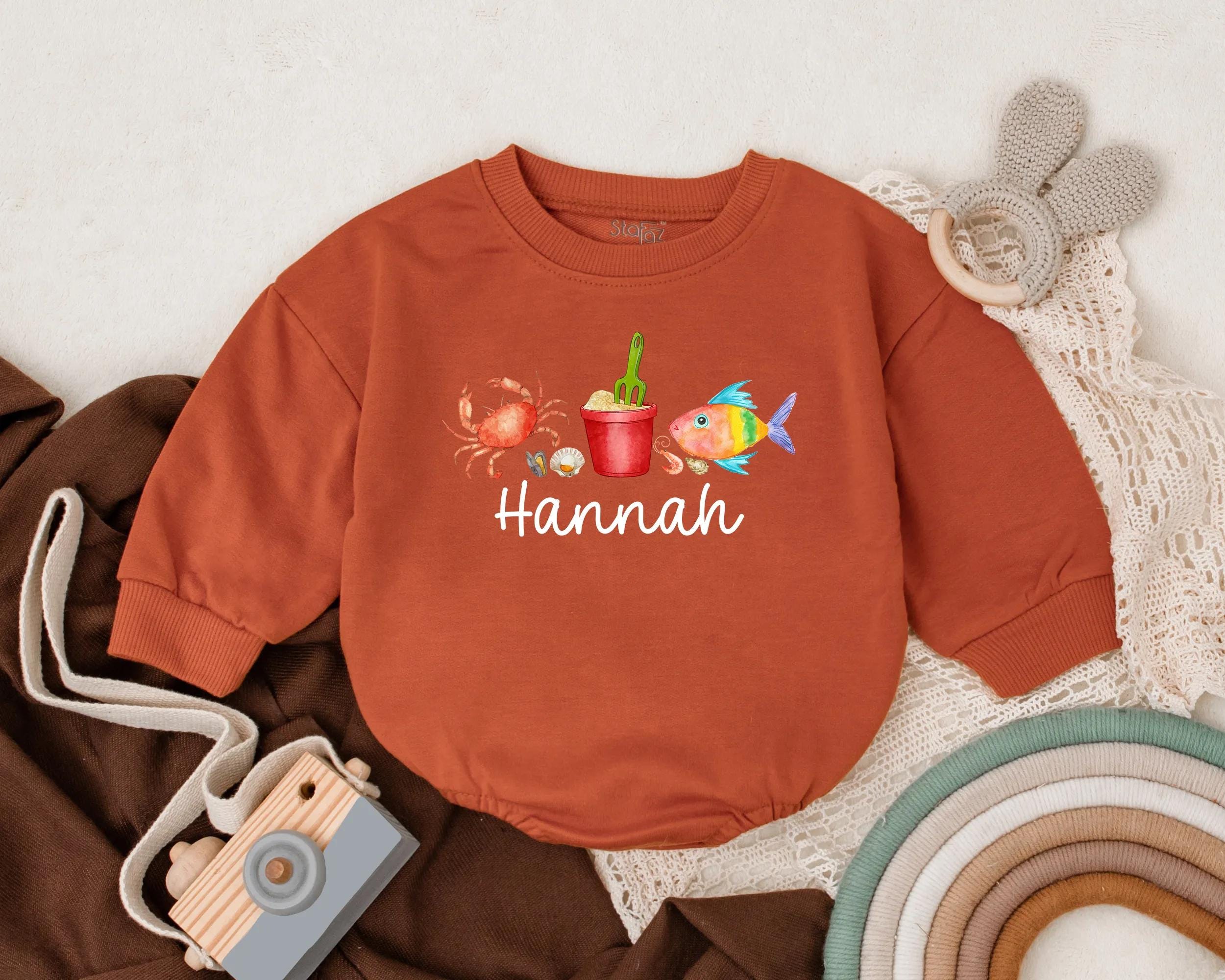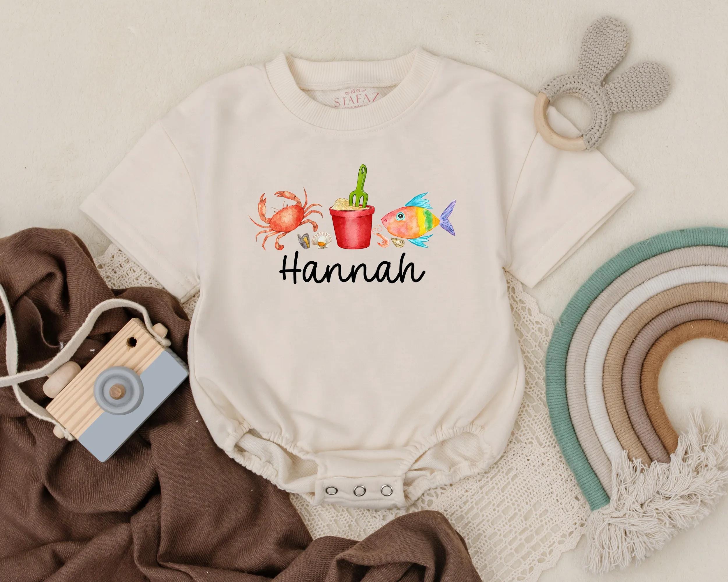 Imagine a joyful day at the beach, where your little one plays happily in the sand, wearing this adorable beach bubble romper. The vibrant design features a playful ocean theme with a cheerful red crab and a colorful fish, perfectly flanking a red sand bucket with a green shovel. The bright and whimsical artwork captures the essence of summer with its lively palette of reds, greens, blues, and yellows. Personalized with the name 'Hannah' elegantly printed in a stylish black script, this romper becomes a cherished keepsake. Perfect for a sunny day at the beach or a fun family vacation, it offers both comfort and style. Give the gift of a precious memory, and let this romper be a part of your baby's summer adventures.