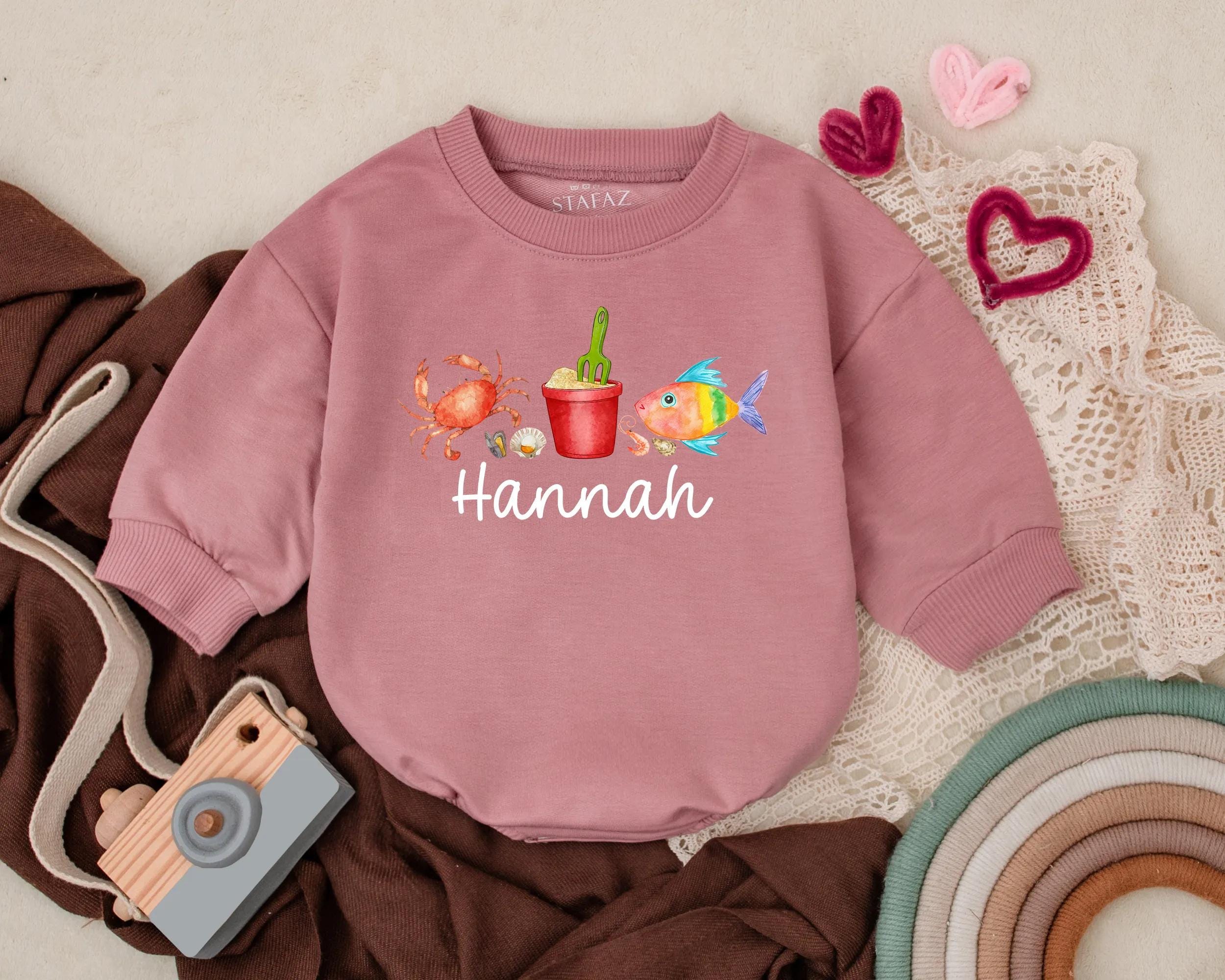 Personalized Beach Bubble Romper with Crab and Fish Design for Baby Girl Custom Summer Outfit Vacation Baby Gift in Soft Cotton