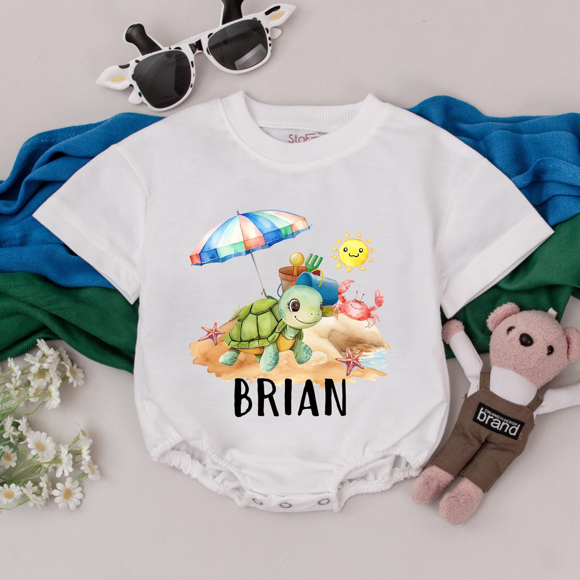 Picture your little one basking in the summer sun, with laughter in the air and sand between their tiny toes. This charming romper captures the essence of a joyful day at the beach with its delightful design. Featuring a playful turtle donning a blue hat under a vibrant beach umbrella, and a smiling sun, this outfit is a canvas of fun and color. Surrounding starfish and a friendly crab add to the whimsical theme, making it perfect for seaside adventures or backyard playdates. Crafted from soft, comfortable cotton, it's as cozy as it is cute, ideal for everyday wear or special holiday outings. Personalize it with your child's name, and it becomes more than just clothing—it's a keepsake that cherishes their first beach memories. Let this romper be a part of your family's cherished moments, a piece they'll look back on with fondness.