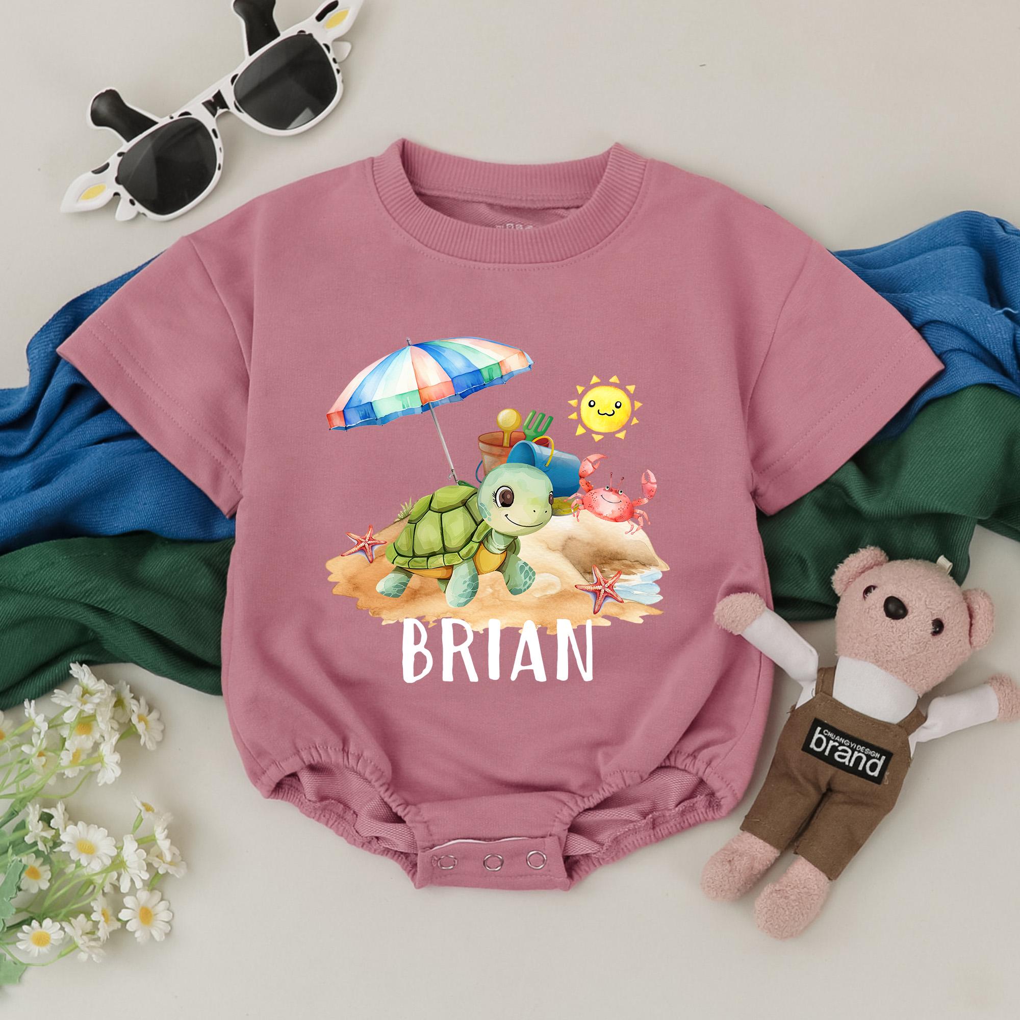 Personalized Beach Turtle Romper for Toddler Baby Summer Vacation Outfit with Custom Name, Colorful Beach Scene, Soft Cotton Gift