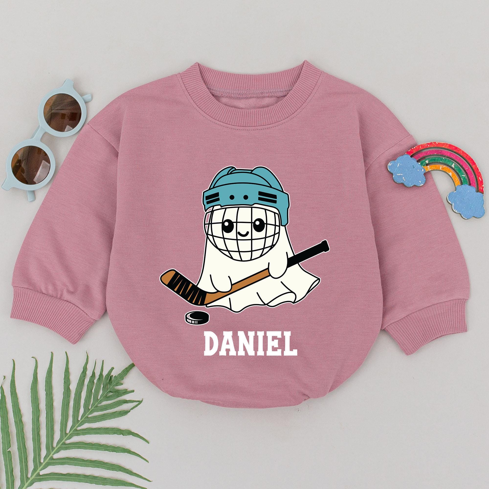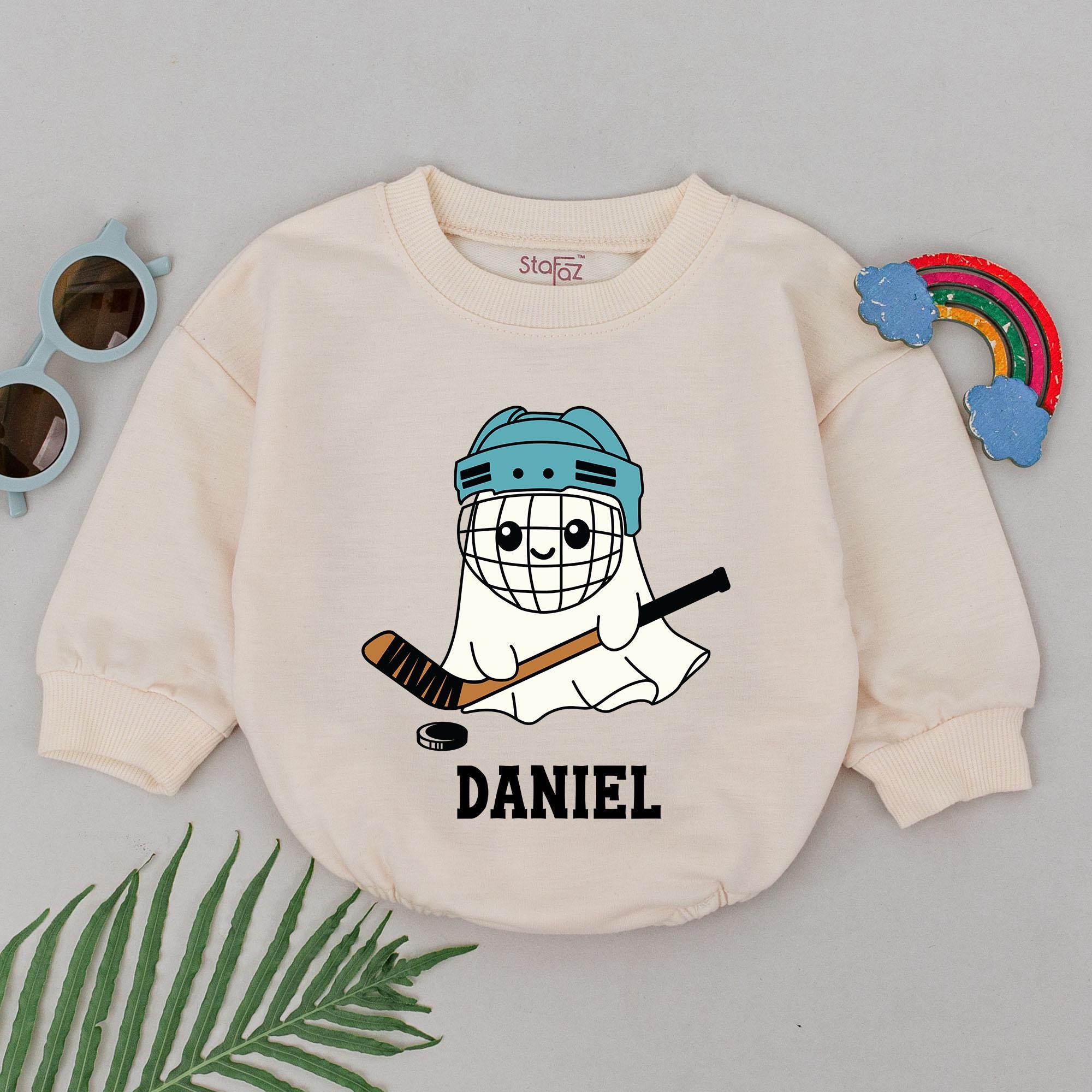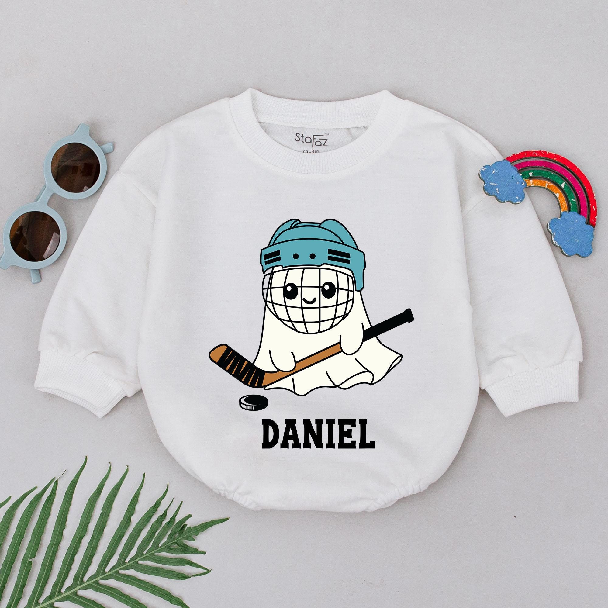 Imagine your little one celebrating their first Halloween with a touch of playful spirit and sporty charm. This adorable romper features a whimsical ghost character donning a teal hockey helmet, complete with a friendly smile and a trusty hockey stick, ready for a fun game day. The design is brought to life with a soft color palette of white, teal, brown, and black, making it perfect for both holiday gatherings and casual outings. Below the cheerful ghost, the name 'DANIEL' stands proudly, adding a personal touch that turns this outfit into a cherished keepsake. Whether it's for a spooky-themed Halloween party or a cozy family gathering, this romper is crafted from comfortable cotton, ensuring your baby boy stays snug and stylish. Adding a name transforms it into a unique gift, making every wear a memory in the making. Don't miss out on capturing these precious moments with a personalized touch that speaks volumes of love and joy.