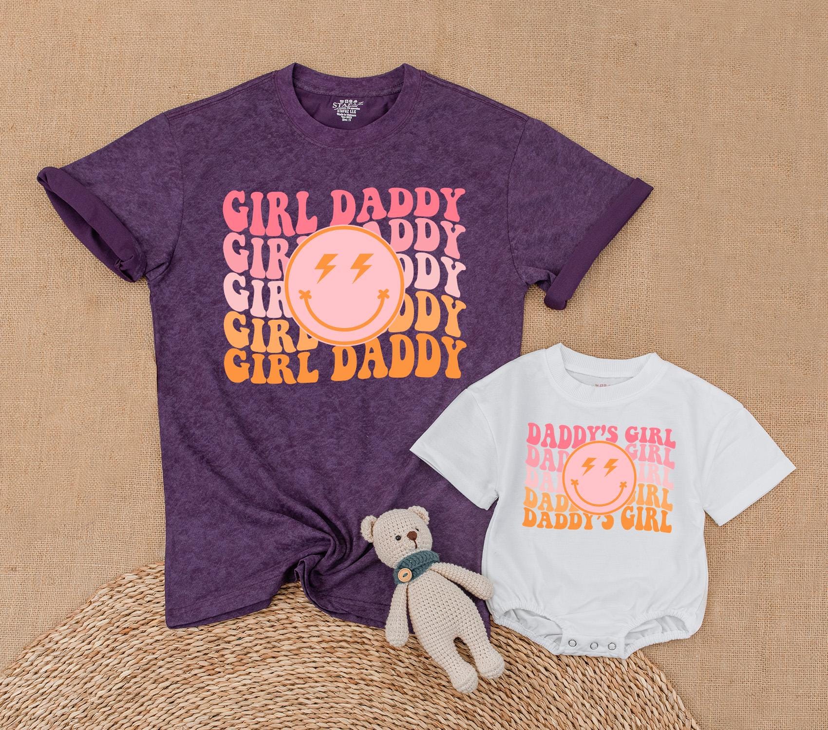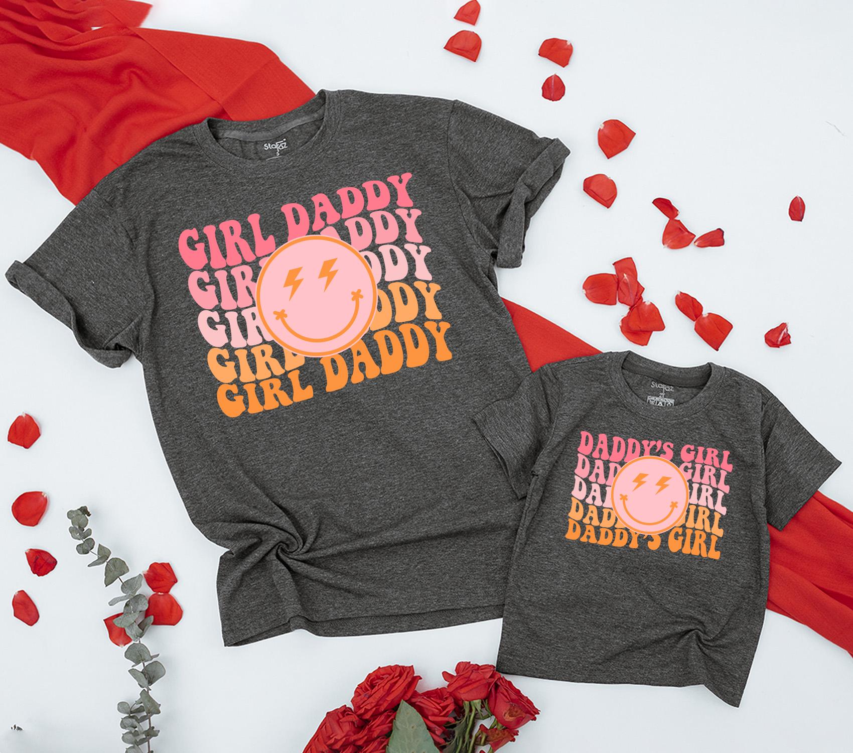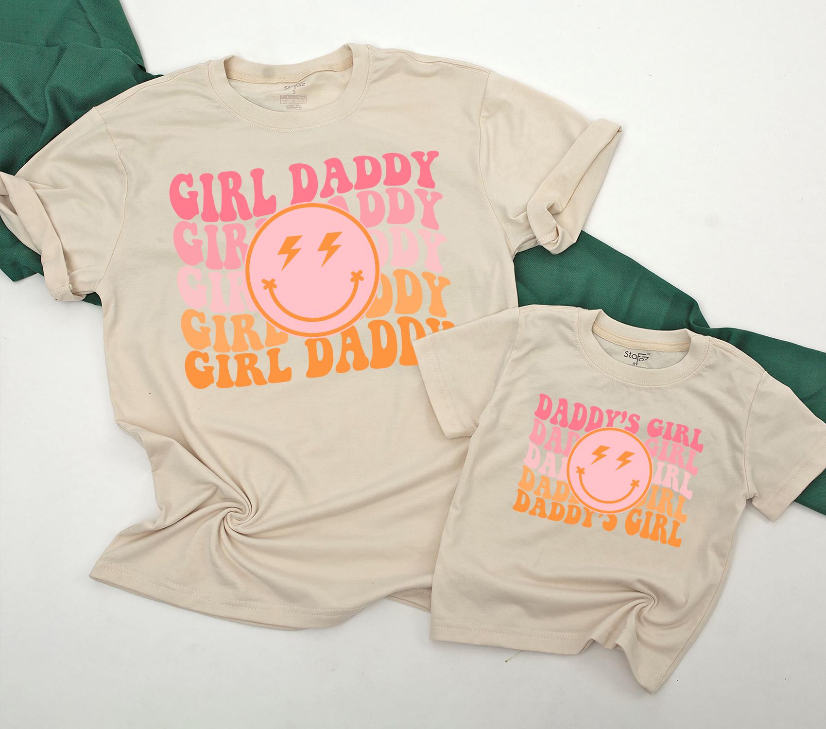 Picture a sunny afternoon where you and your little one are turning heads with matching outfits that speak volumes about your playful bond. This vibrant t-shirt set, with its retro aesthetic, alternates between 'GIRL DADDY' and 'DADDY'S GIRL' in joyful pink and orange hues, making every moment together more colorful. The standout smiley face with lightning bolt eyes adds a whimsical touch, capturing the energy and fun of cherished family gatherings or casual park strolls. Imagine the joy of personalizing this set with your names, turning it into a keepsake that tells your unique story. Whether it's for a family photo shoot or a cozy day at home, this matching set is more than just clothing—it's a celebration of the love and laughter you share. Embrace these precious moments and make them unforgettable with a personal touch that will be treasured for years.