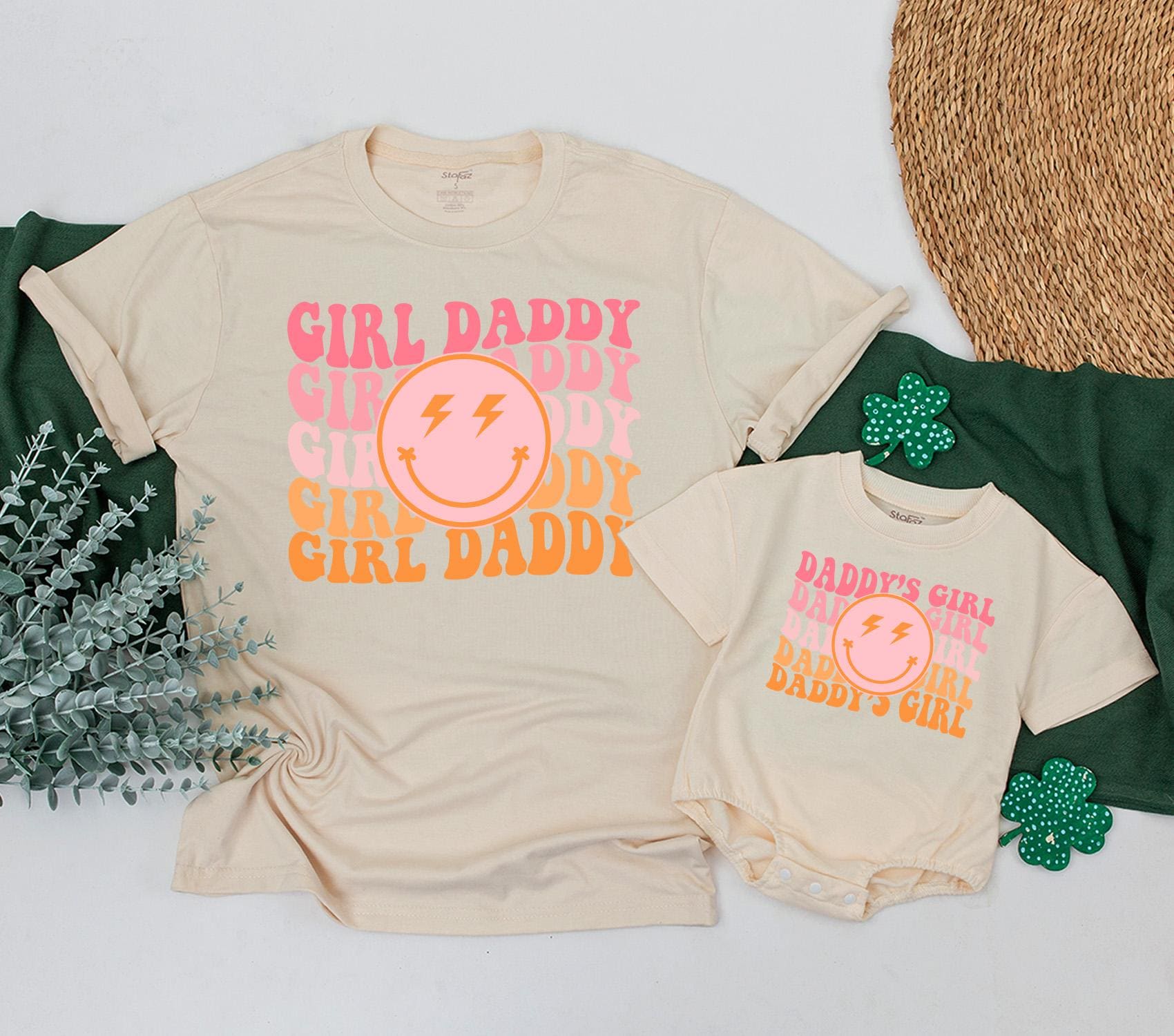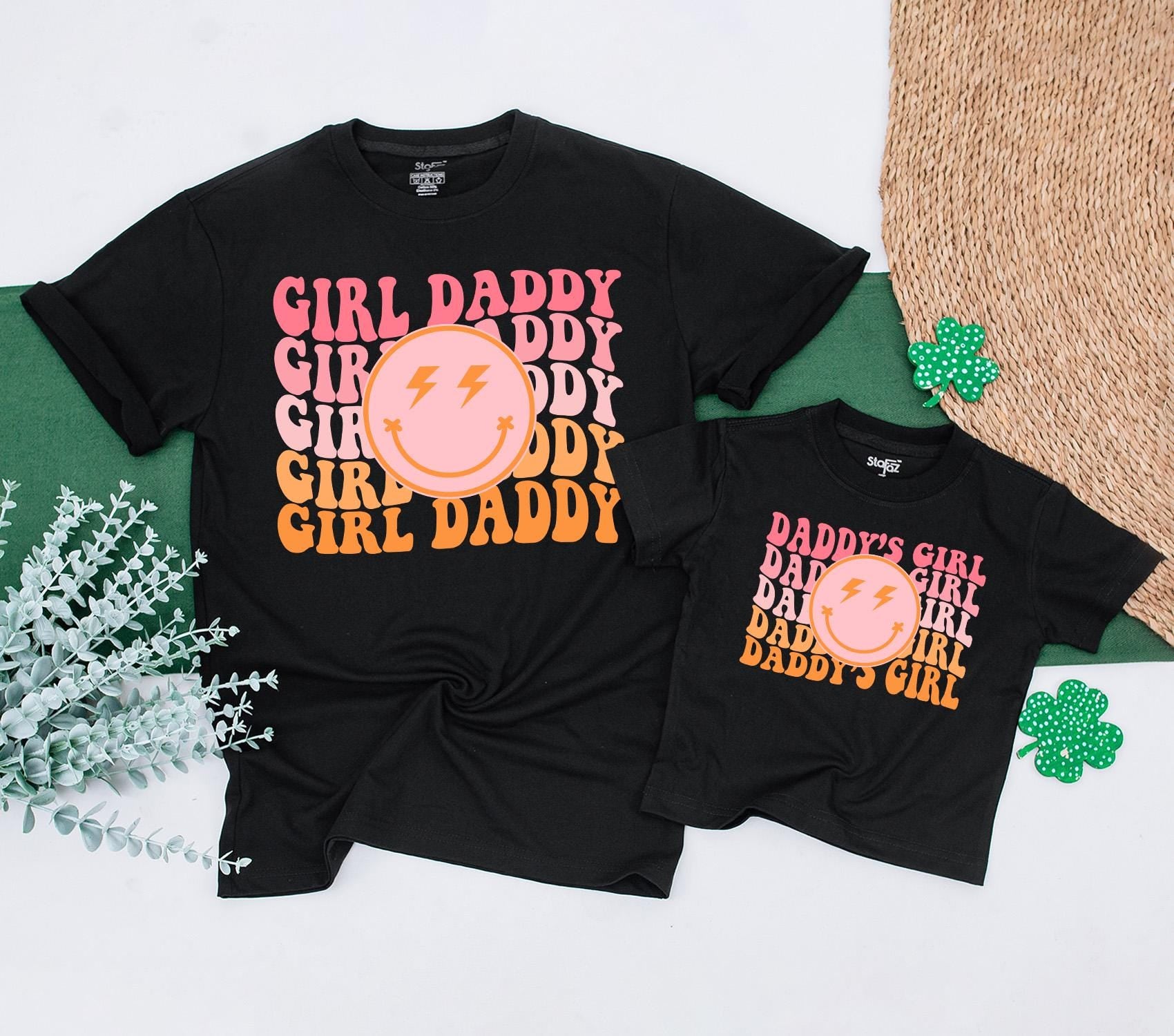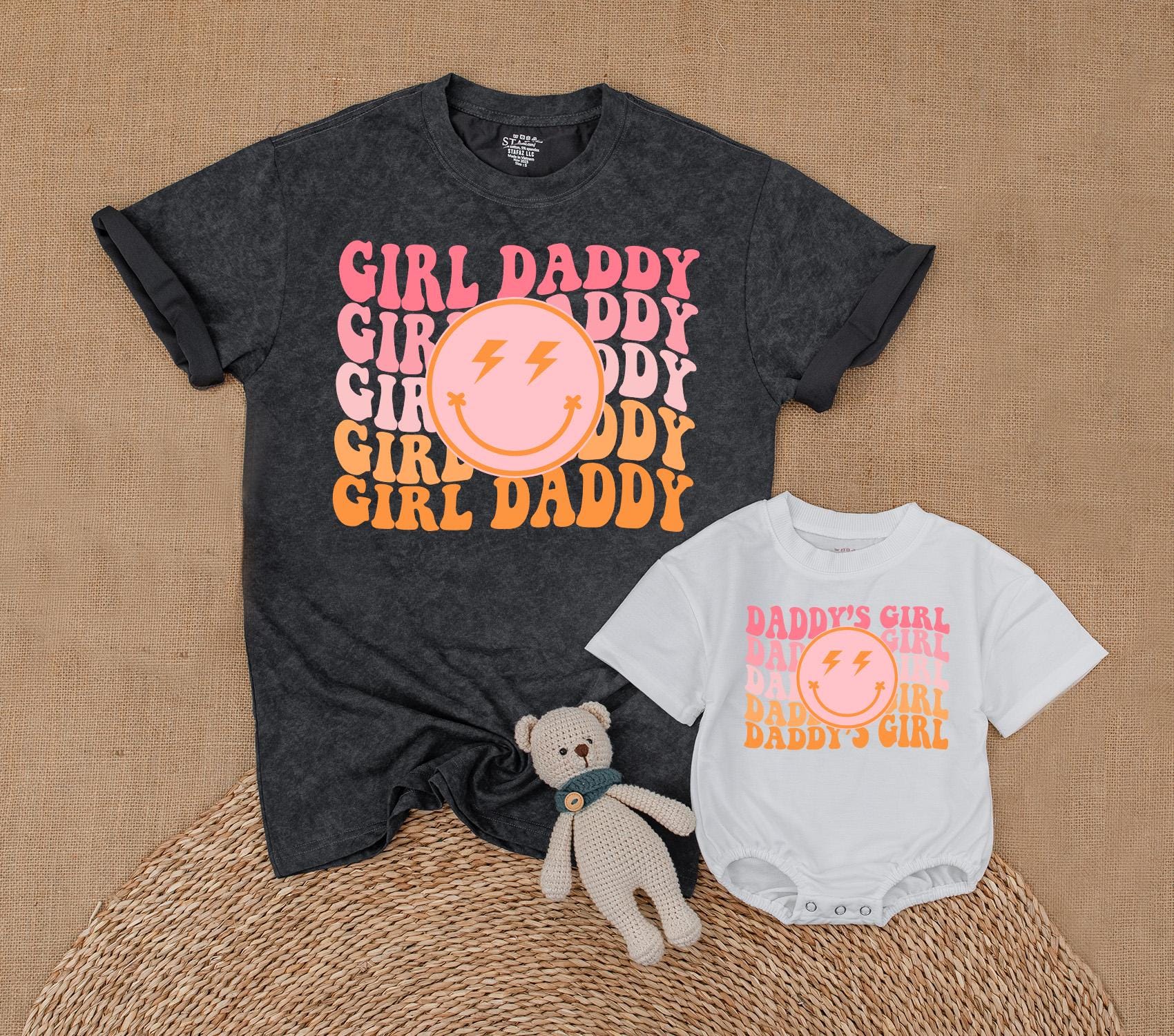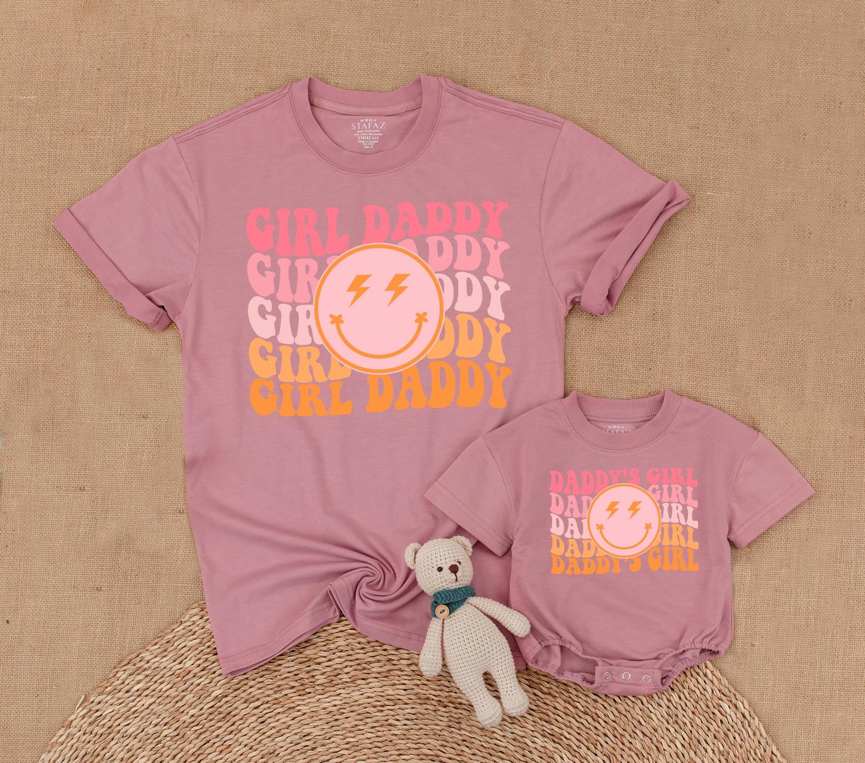 Picture a sunny afternoon where you and your little one are turning heads with matching outfits that speak volumes about your playful bond. This vibrant t-shirt set, with its retro aesthetic, alternates between 'GIRL DADDY' and 'DADDY'S GIRL' in joyful pink and orange hues, making every moment together more colorful. The standout smiley face with lightning bolt eyes adds a whimsical touch, capturing the energy and fun of cherished family gatherings or casual park strolls. Imagine the joy of personalizing this set with your names, turning it into a keepsake that tells your unique story. Whether it's for a family photo shoot or a cozy day at home, this matching set is more than just clothing—it's a celebration of the love and laughter you share. Embrace these precious moments and make them unforgettable with a personal touch that will be treasured for years.