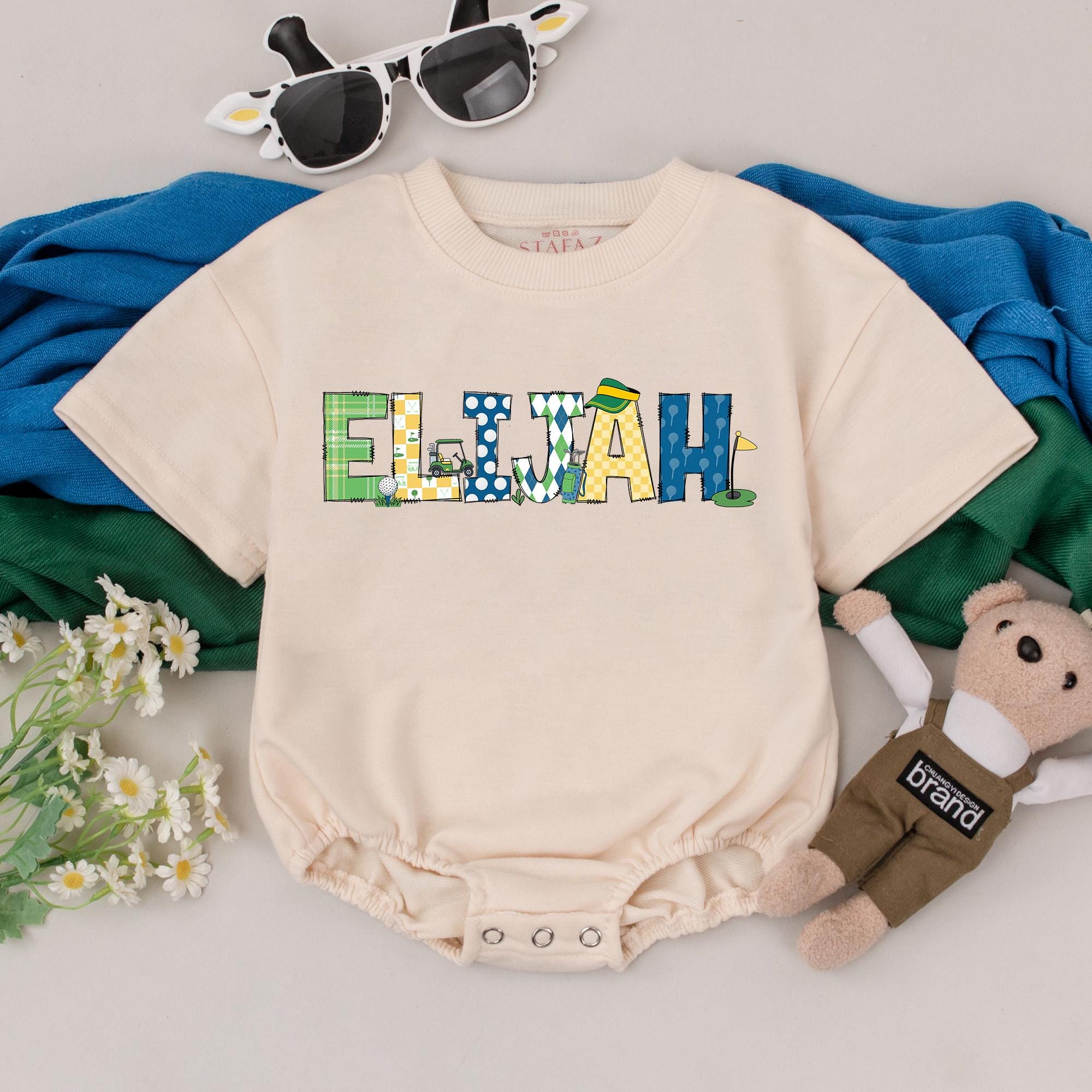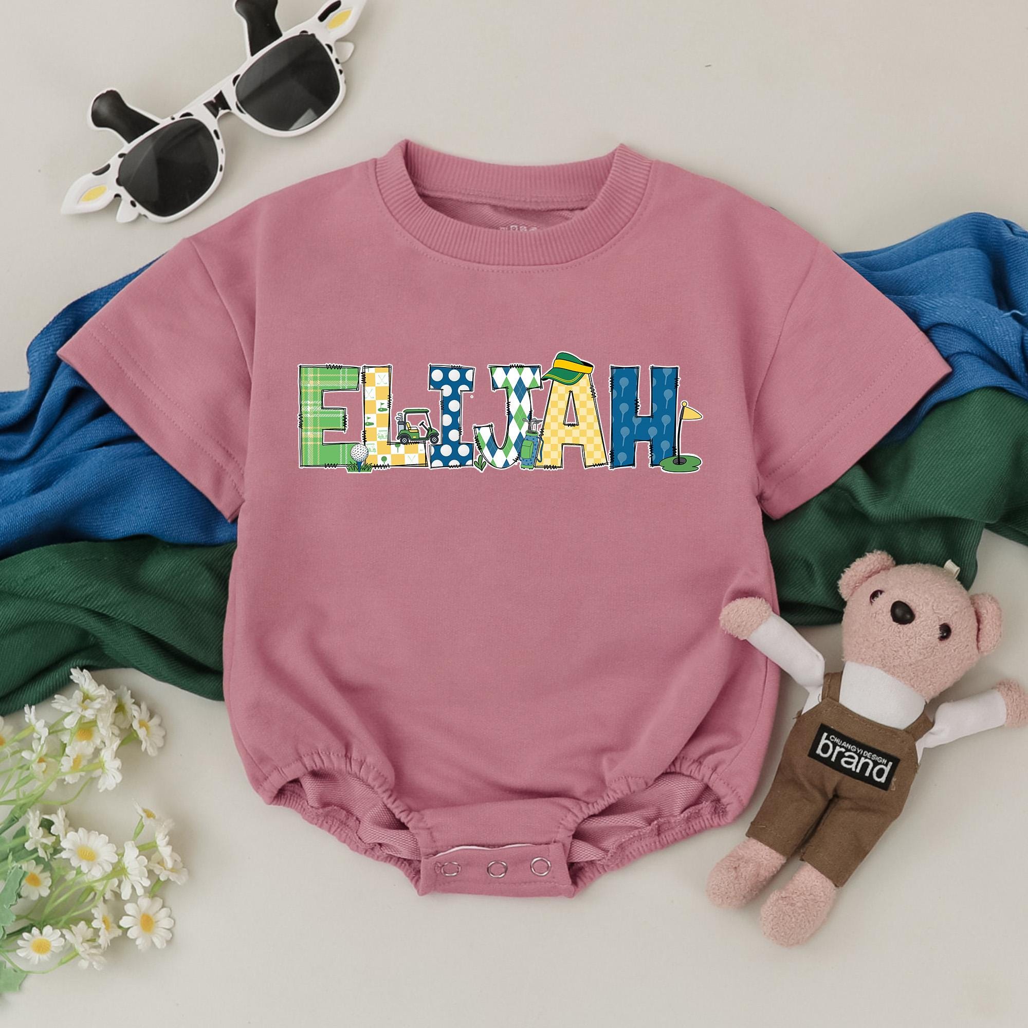 Personalized Elijah Golf Baby Romper Fun Patterned Birthday Outfit Toddler Boy or Girl Cotton Playful Colors Baby Shower Gift
