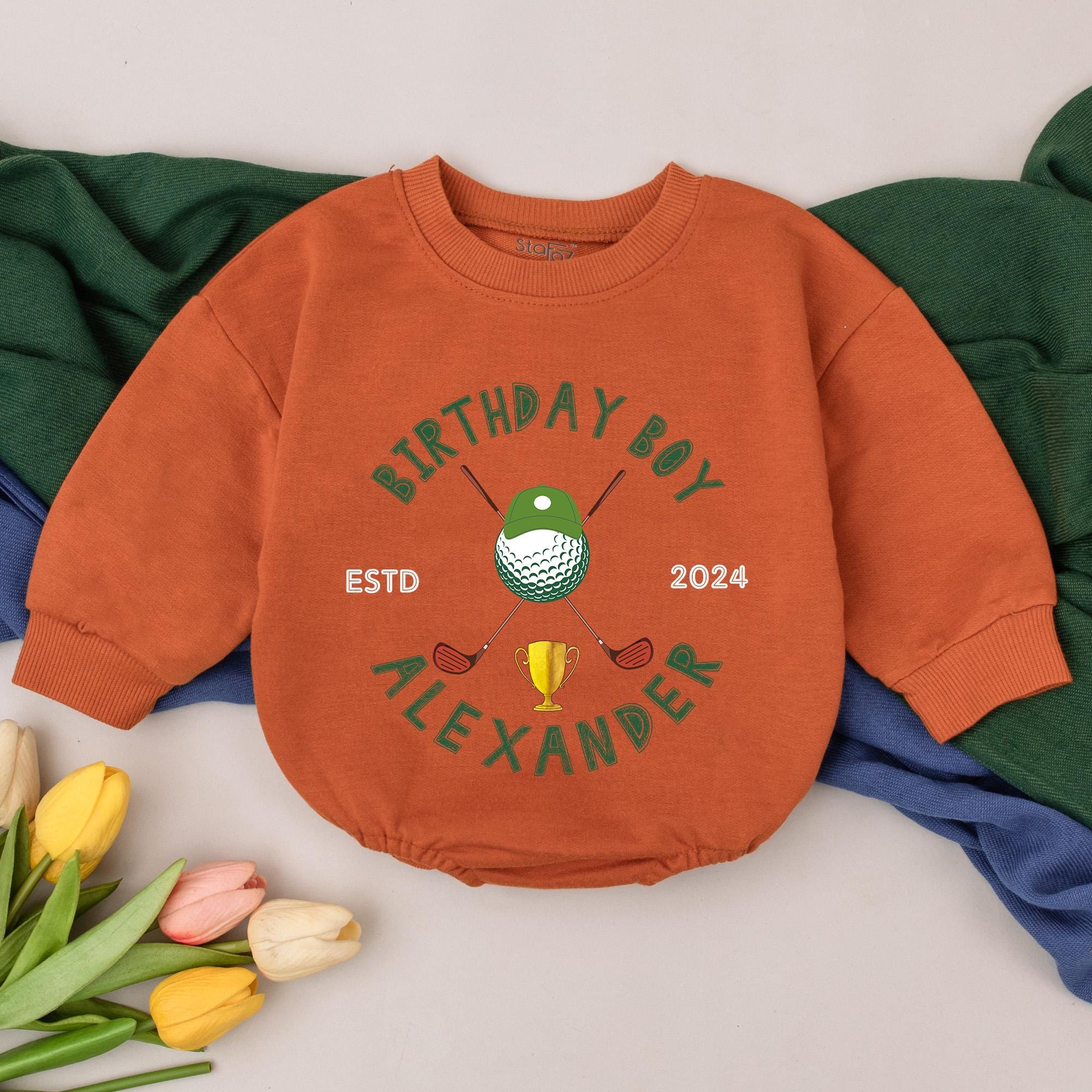 Celebrate your little one's first big milestone with this charming golf-themed romper, perfect for a birthday bash or a casual day out. The playful design features a vibrant green golf ball on a tee, flanked by crossed clubs, and topped with 'BIRTHDAY BOY' in cheerful green letters. Below, your child's name, like 'Alexander', adds that special touch, making this romper not just an outfit, but a keepsake. Imagine your baby boy crawling around at his birthday party, a tiny golden trophy gleaming beneath the golf ball, capturing the essence of a 'hole in one' celebration. Made from soft, comfortable cotton, this outfit ensures your little golfer stays happy all day. Add the year 2024 for a truly personalized gift that marks this joyous occasion. A perfect way to celebrate and capture the memory of this special year.