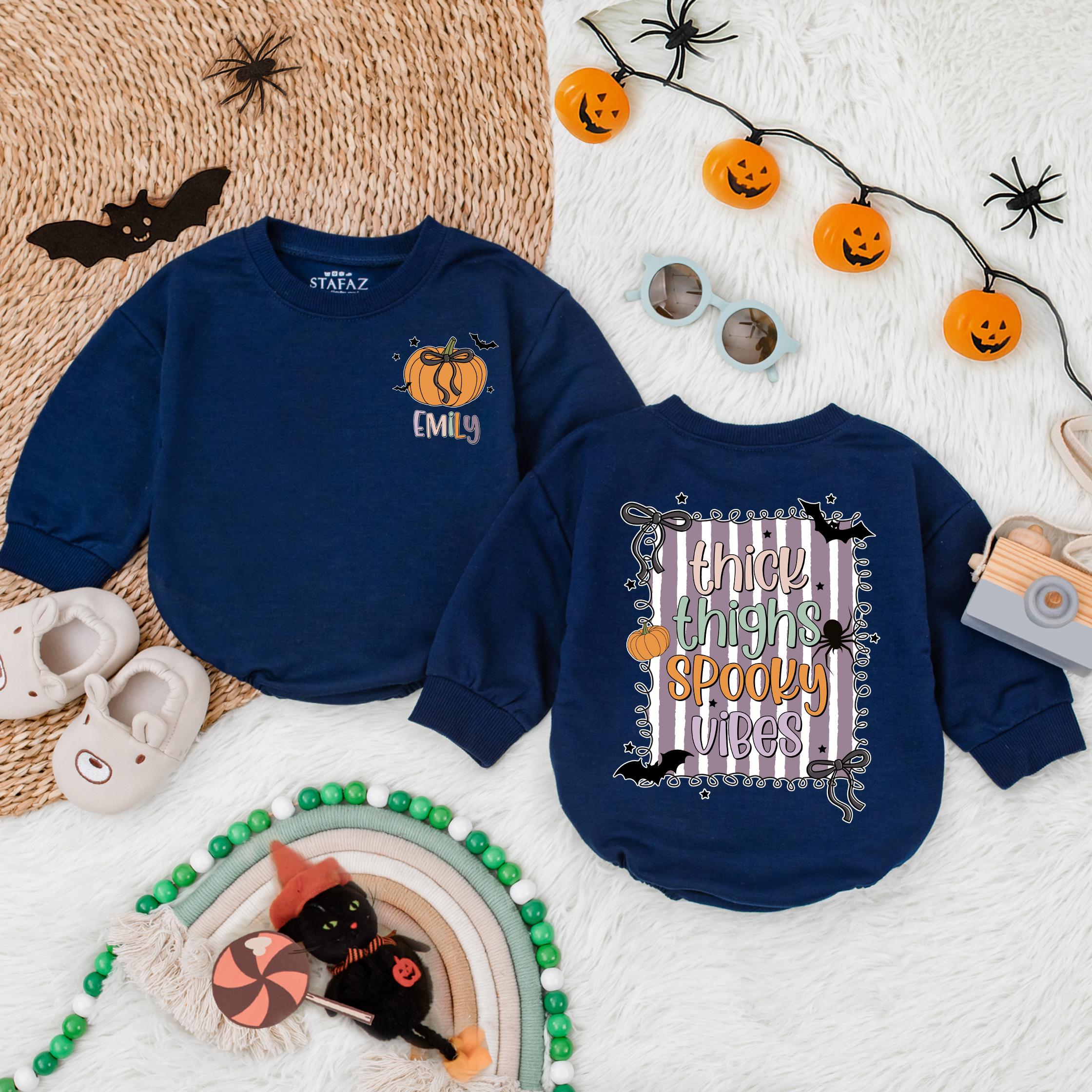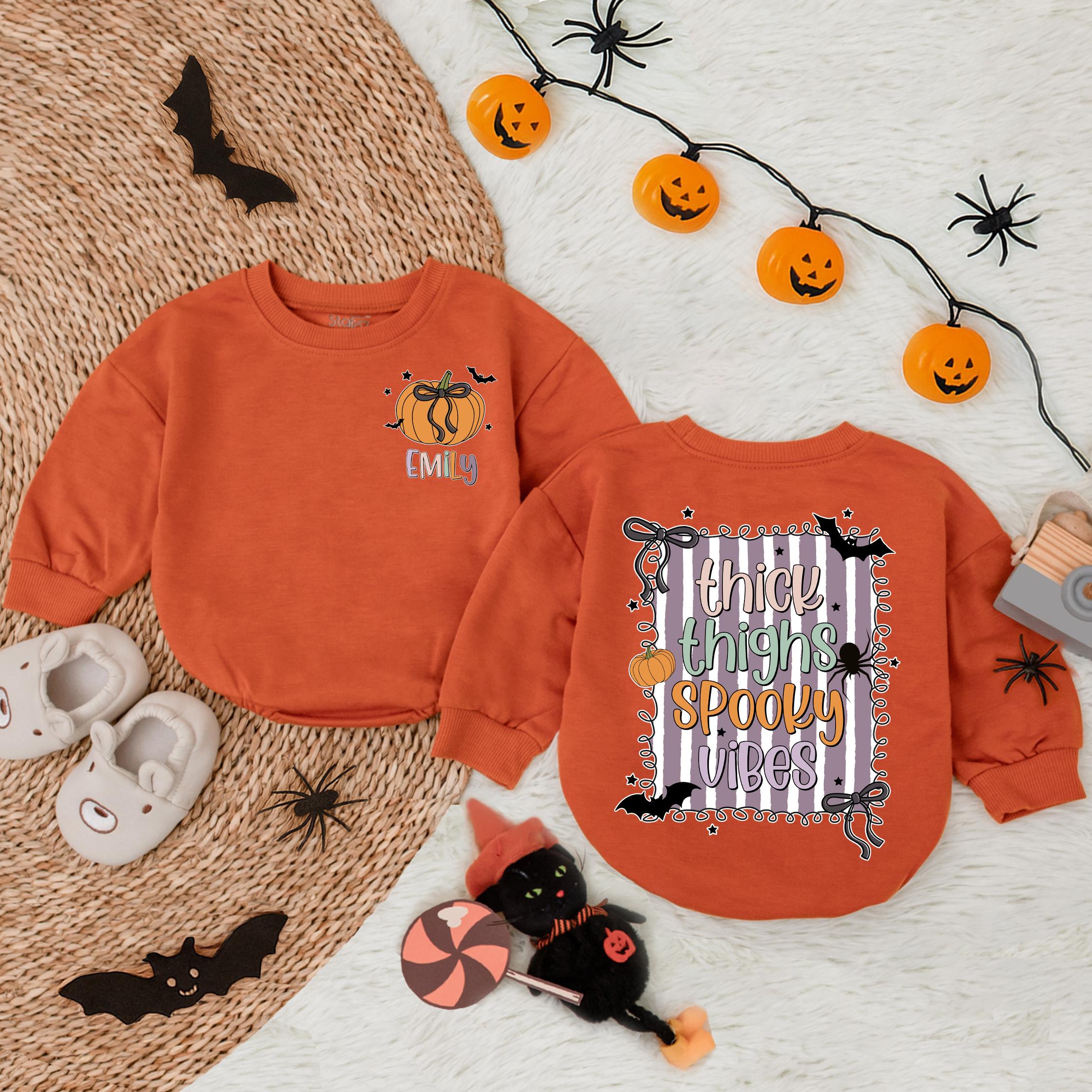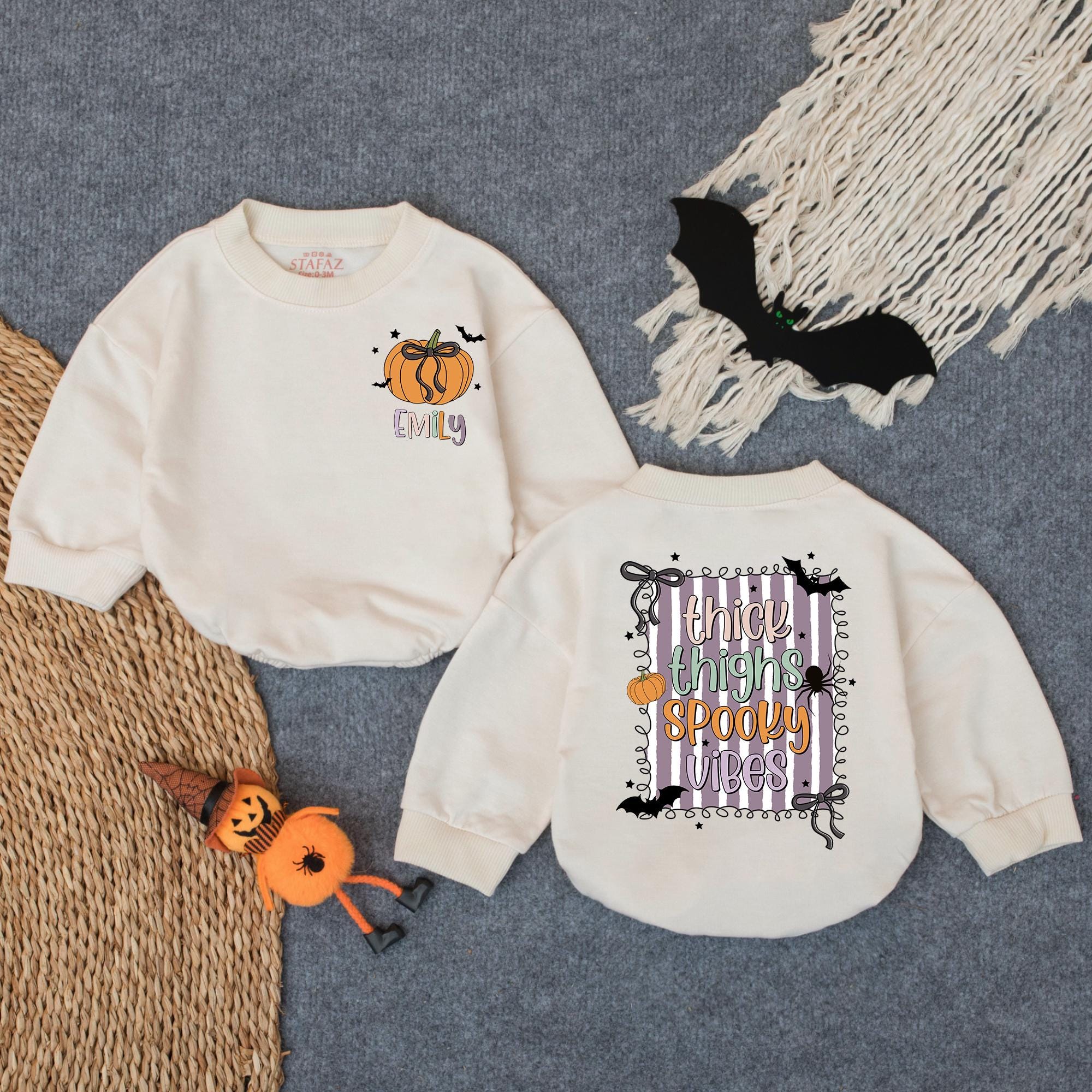 Imagine your little one joining the Halloween festivities with a romper that's as playful as a pumpkin patch. This delightful bodysuit features a whimsical orange pumpkin with a smiling face, paired with your child's name in a charming font. On the back, 'Thick Thighs Spooky Vibes' comes alive in vibrant purple, green, and orange, surrounded by bats and spider webs for a festive flair. Perfect for cozying up at a family Halloween gathering or capturing those first trick-or-treat memories. Adding a name turns this romper into a keepsake, making it a thoughtful gift that stands out. Let your baby bring joy and laughter to the season with this fun and festive outfit!
