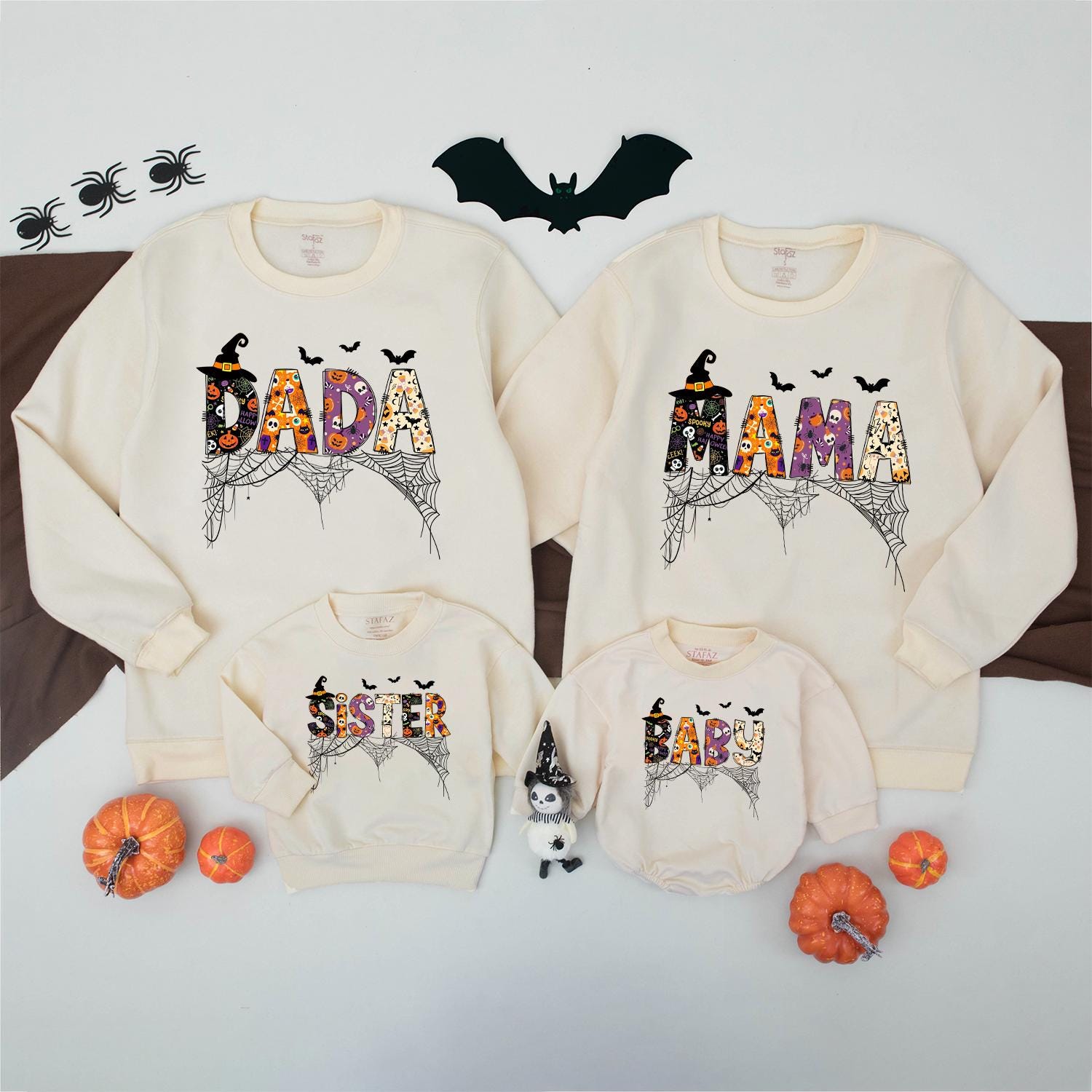 Imagine the joy of a cozy Halloween night with your family, each member wrapped in a uniquely personalized sweatshirt. The bold, playful text on your garment features words like 'DADA,' 'MAMA,' 'SISTER,' and 'BABY,' each filled with enchanting Halloween patterns. Adorned with witches' hats, bats, and spider webs, this design brings a fun, spooky vibe to your wardrobe. As you gather for a holiday brunch or a casual day out, these matching outfits create a sense of togetherness and family bonding. Adding a name turns this sweatshirt into a treasured keepsake, making it a heartfelt gift. Capture those special moments this season and make memories that last a lifetime.