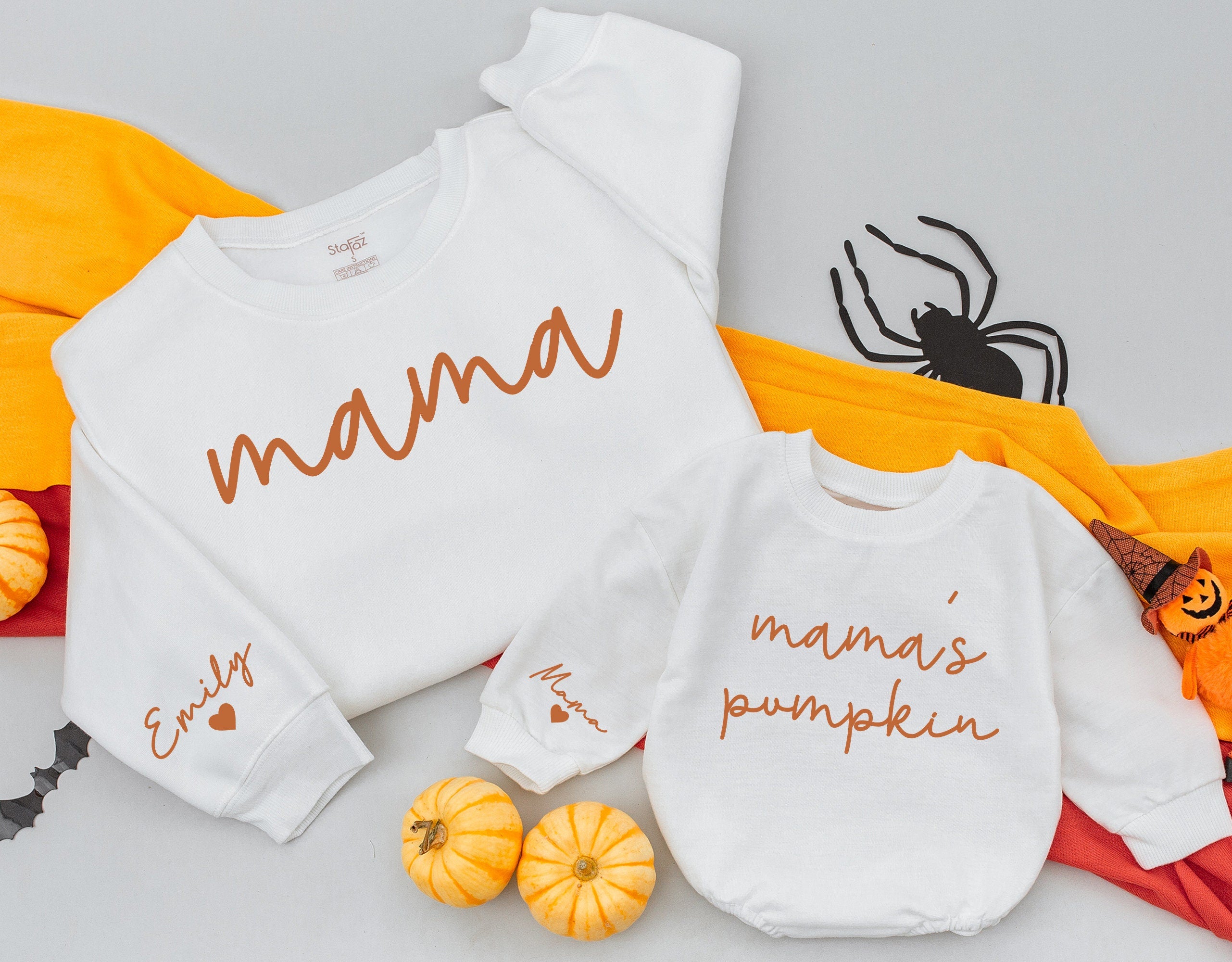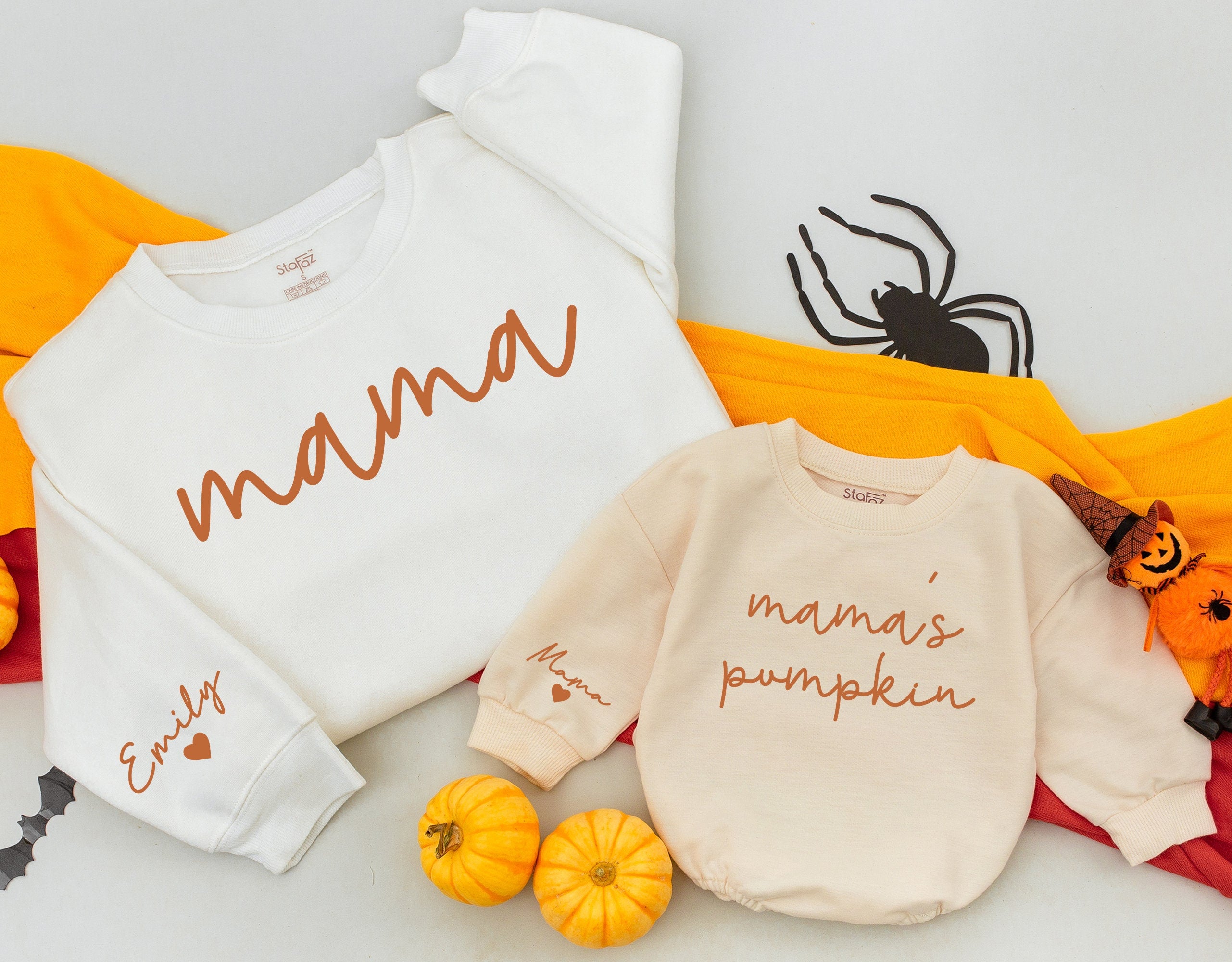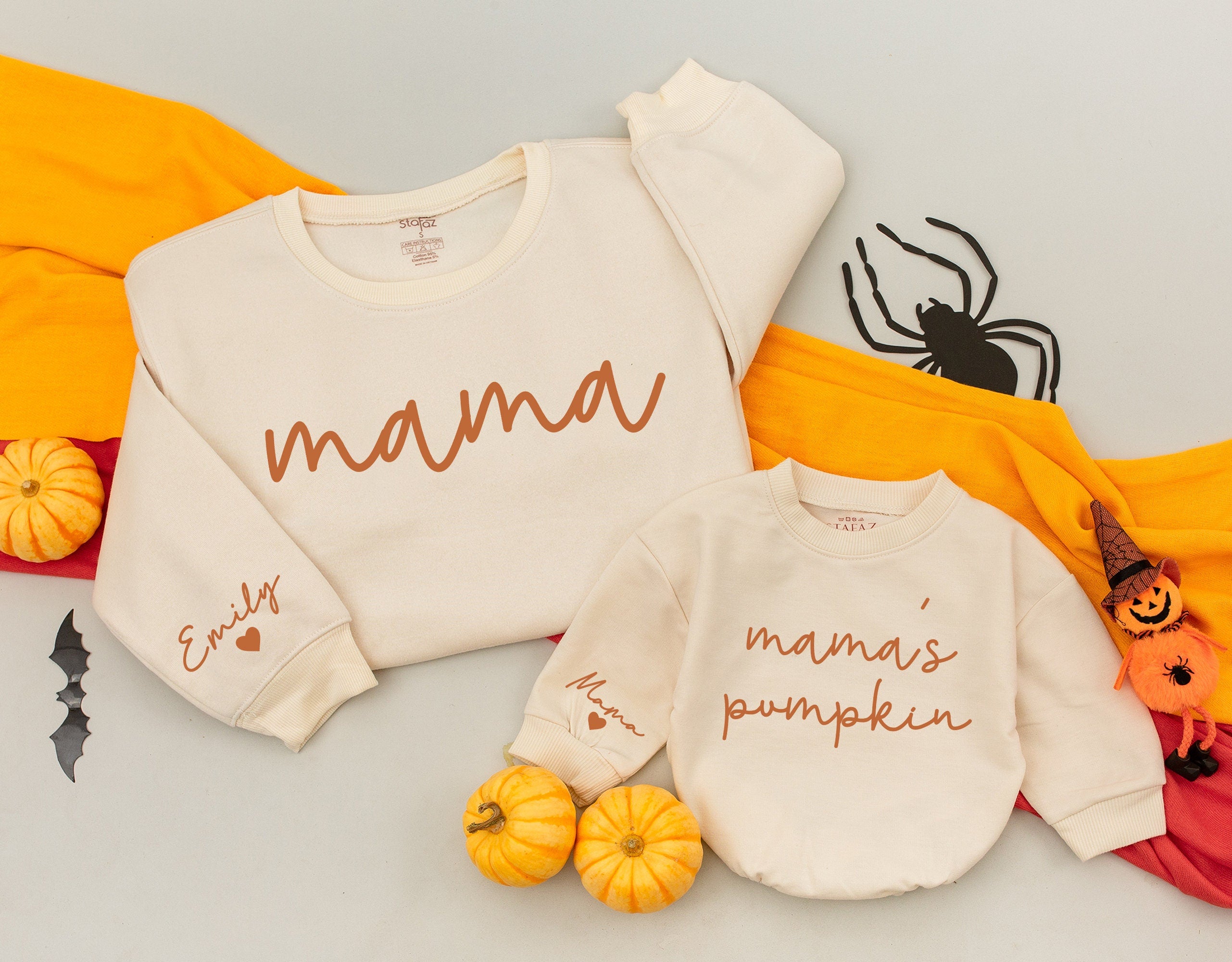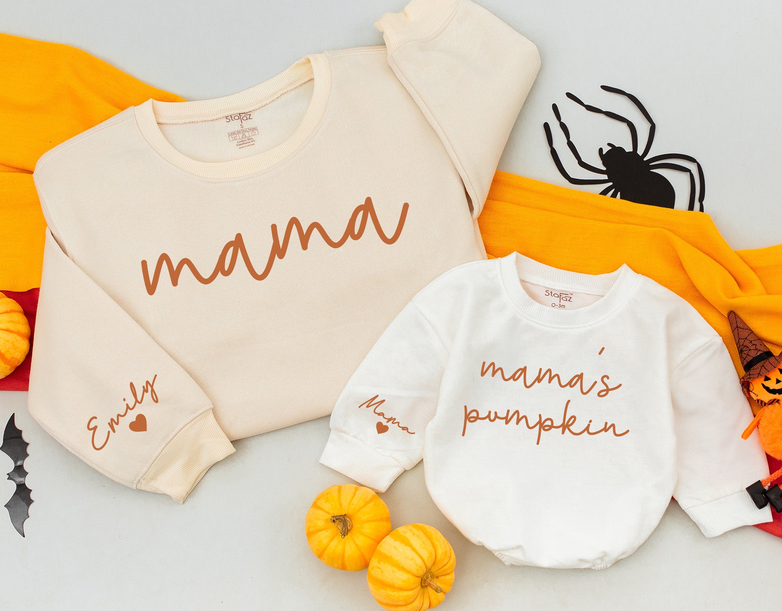 Imagine a crisp autumn day, leaves crunching underfoot as you and your little one share a cozy moment in matching sweatshirts. The 'mama' sweatshirt, adorned with elegant cursive in a warm earthy orange, perfectly complements the playful 'mama's pumpkin' design on the child's sweater. Both pieces are crafted with soft, comfortable cotton, ensuring a snug fit for those chilly fall outings. As you sip hot cocoa together, the personalized names on the sleeves add a special touch, celebrating your unique bond. Whether you're enjoying a family gathering or capturing memories in a fun photoshoot, these matching outfits create a cherished sense of togetherness. Treat yourself and your little pumpkin to this delightful ensemble—because every shared moment deserves a little extra warmth and style.