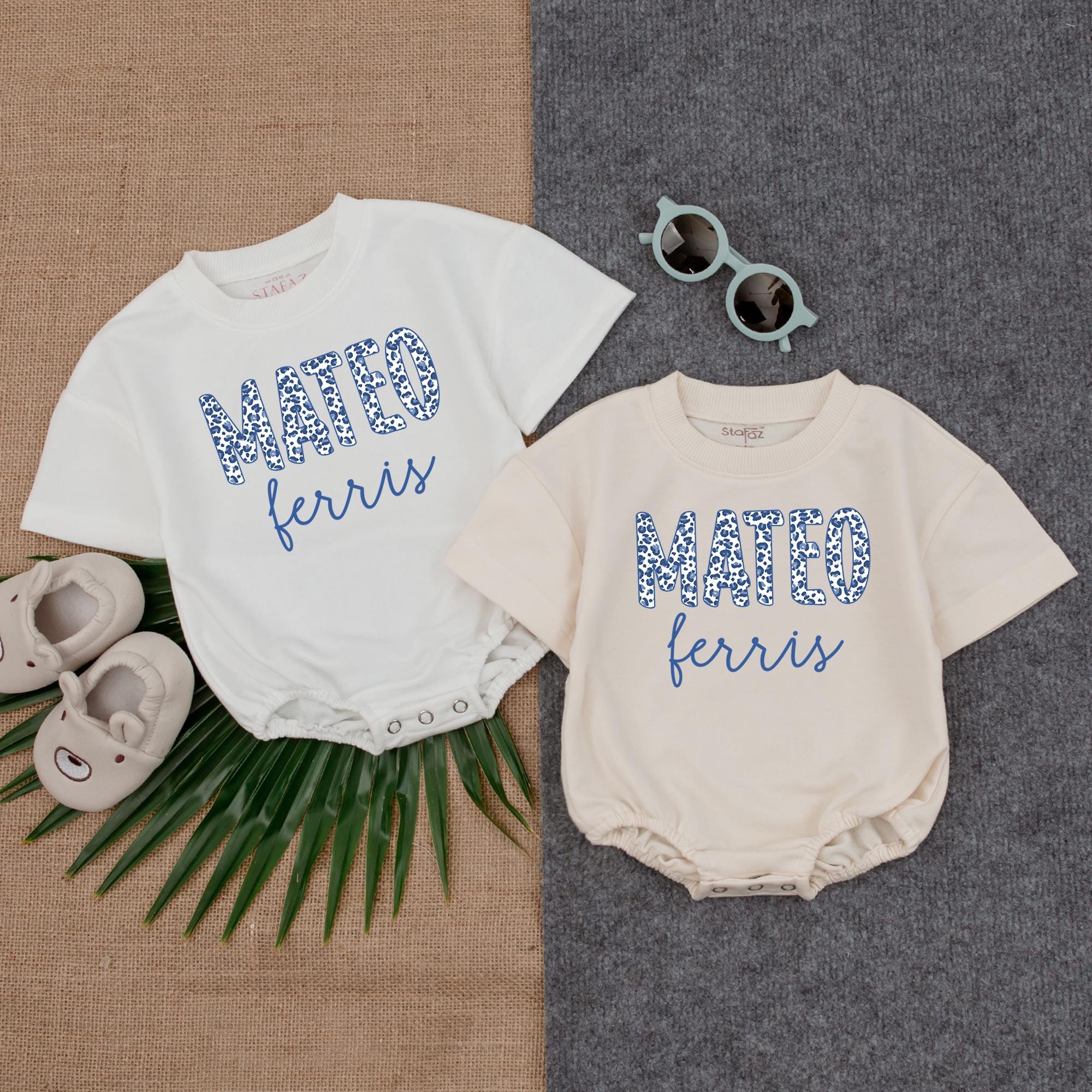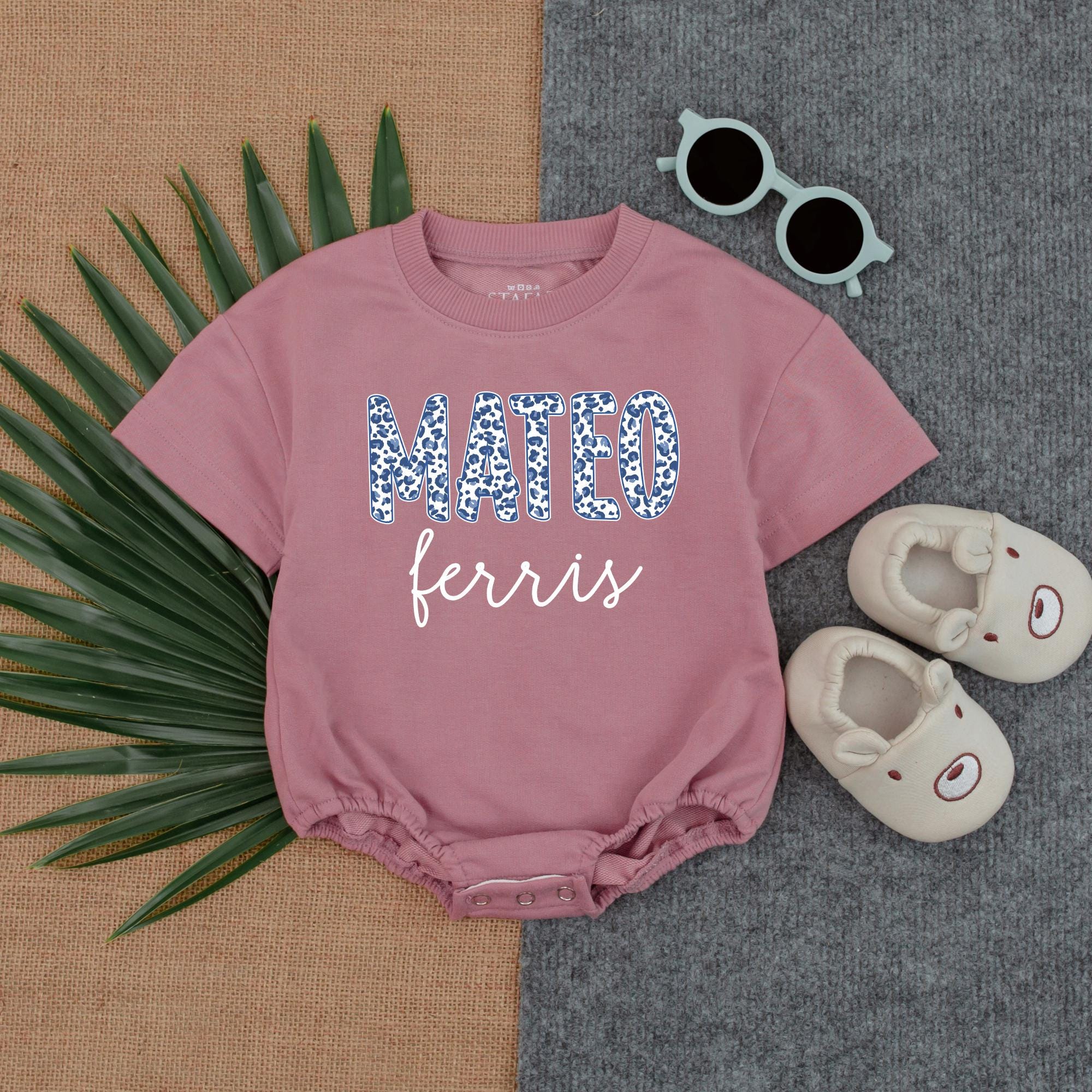 Imagine your little one exploring the world in a romper that's as unique as they are. The playful navy leopard print spelling 'Mateo' adds a wild touch, while the elegant script of 'Ferris' below brings a hint of sophistication. Perfect for casual family outings or special occasions, this romper invites joy and curiosity with every wear. Crafted from soft, comfortable cotton, it's ideal for snuggly afternoons or playful adventures at a weekend brunch. Personalizing it with your child's name transforms this outfit into a cherished keepsake, making it an unforgettable gift. Invite your loved ones to celebrate your child's individuality and capture those precious memories with this stylish piece.