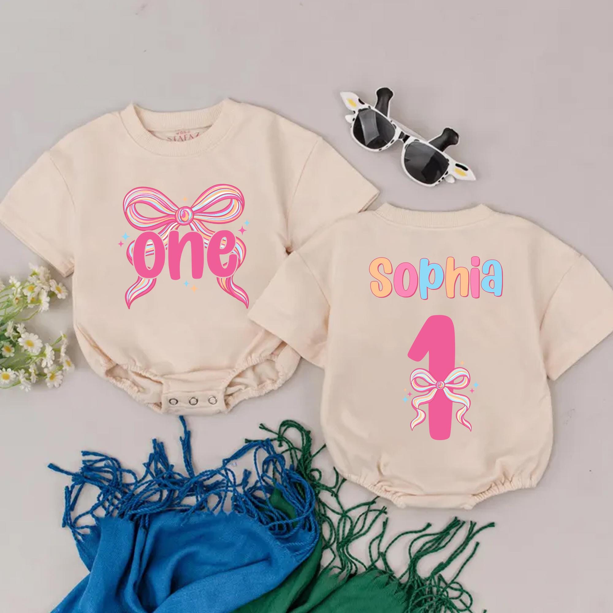 Celebrate your little one's first big milestone with a romper that's as joyful and vibrant as the occasion itself. Imagine your baby girl lighting up the room in this adorable outfit, with 'one' playfully displayed in bold pink on the front, accented by a whimsical bow. The back features a large number '1' adorned with another charming bow, and her name—Sophia—dances above in colorful pink, orange, and blue letters. This romper is perfect for cake smashes, family photos, and birthday parties, creating memories that you’ll treasure forever. Adding her name turns this piece into a keepsake, a cherished reminder of how small and sweet she was on her first birthday. It's a heartfelt gift that celebrates her big day in style. Don’t miss the chance to make her first birthday extra special with this delightful romper.