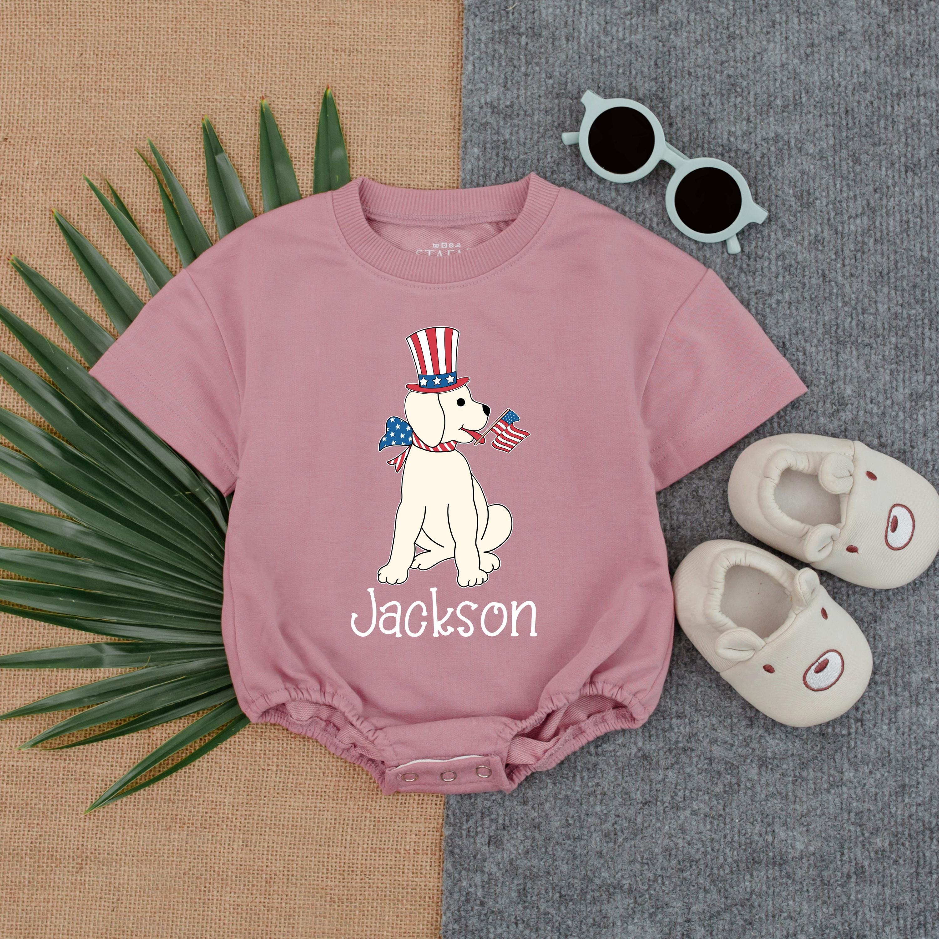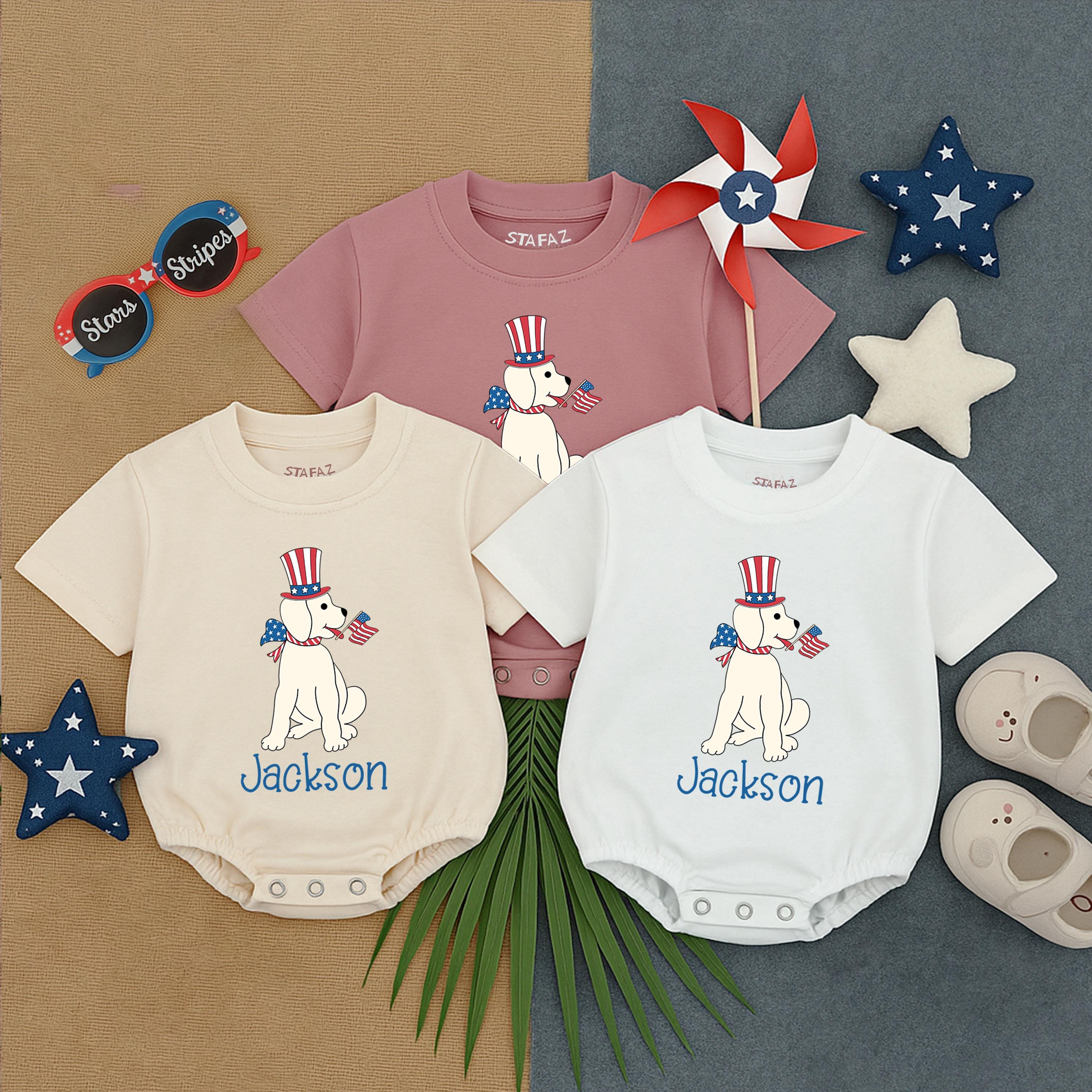 Imagine the joy of a sunny 4th of July picnic, where your little one is the star of the celebration in this charming romper. The playful illustration of a puppy proudly wearing a patriotic top hat, complete with stars and stripes, instantly brings a smile. With its vibrant red, white, and blue colors and the adorable puppy clutching a small American flag, this outfit perfectly captures the festive spirit. Whether it's a family barbecue or a parade in the park, your baby will look irresistibly cute and feel comfortable in this soft garment. Adding their name in bold blue font makes it a keepsake, turning an ordinary day into a cherished memory. This romper isn’t just clothing; it’s a heartwarming piece of a special day. Celebrate the moments that matter, and let your child wear their pride with joy.