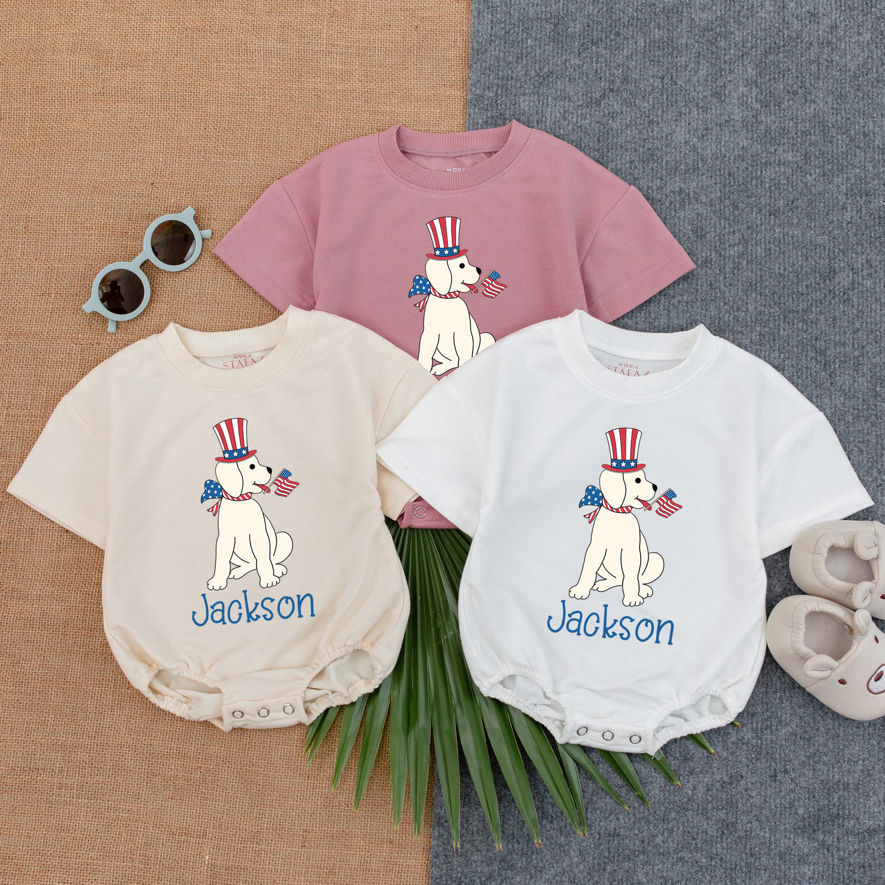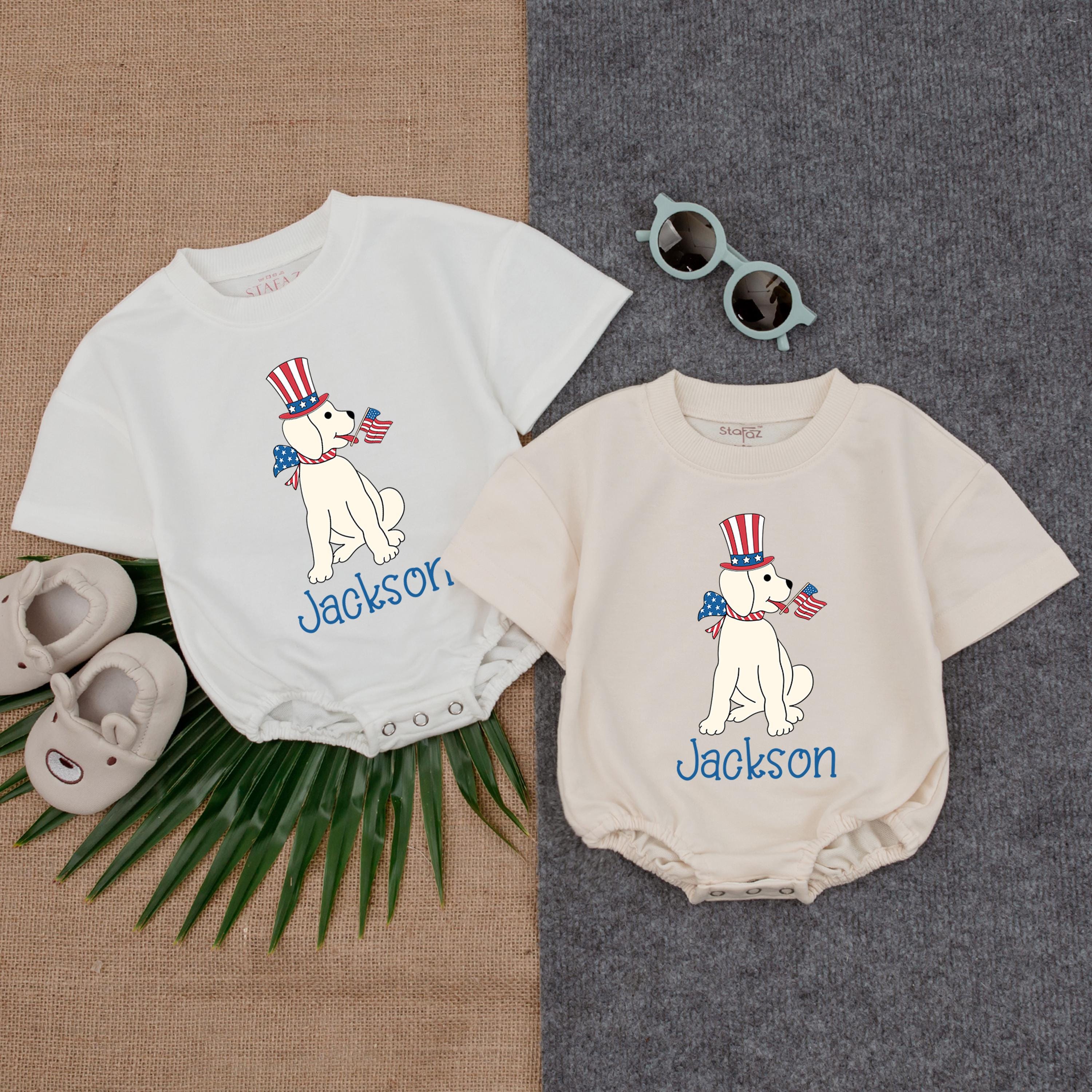 Personalized Puppy 4th of July Bubble Romper Baby Boy Patriotic Outfit Red White Blue Toddler Summer Gift Idea Custom Name
