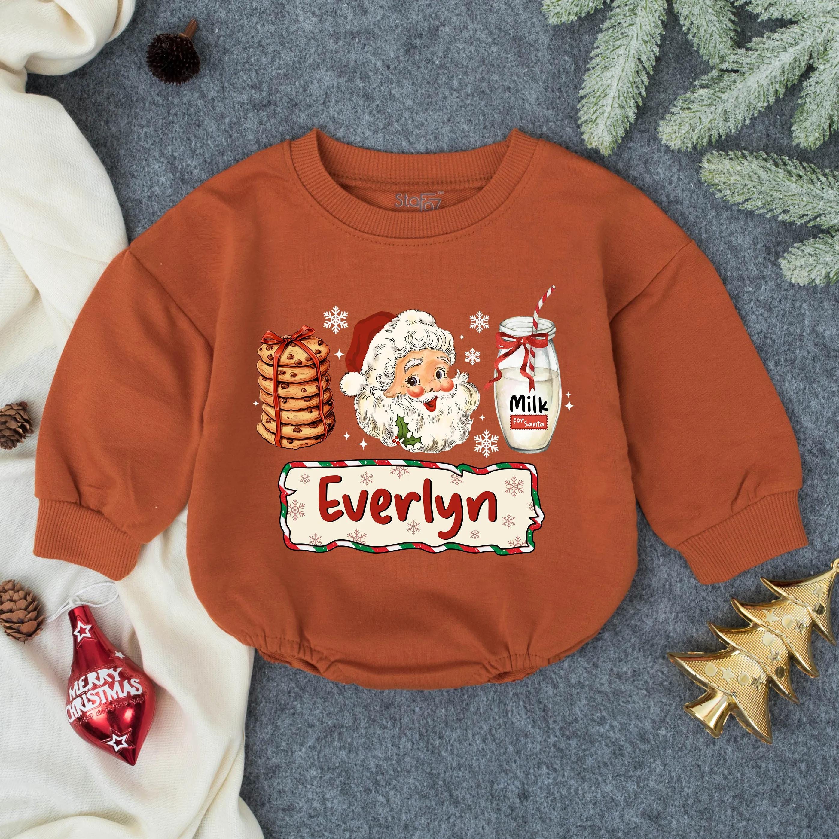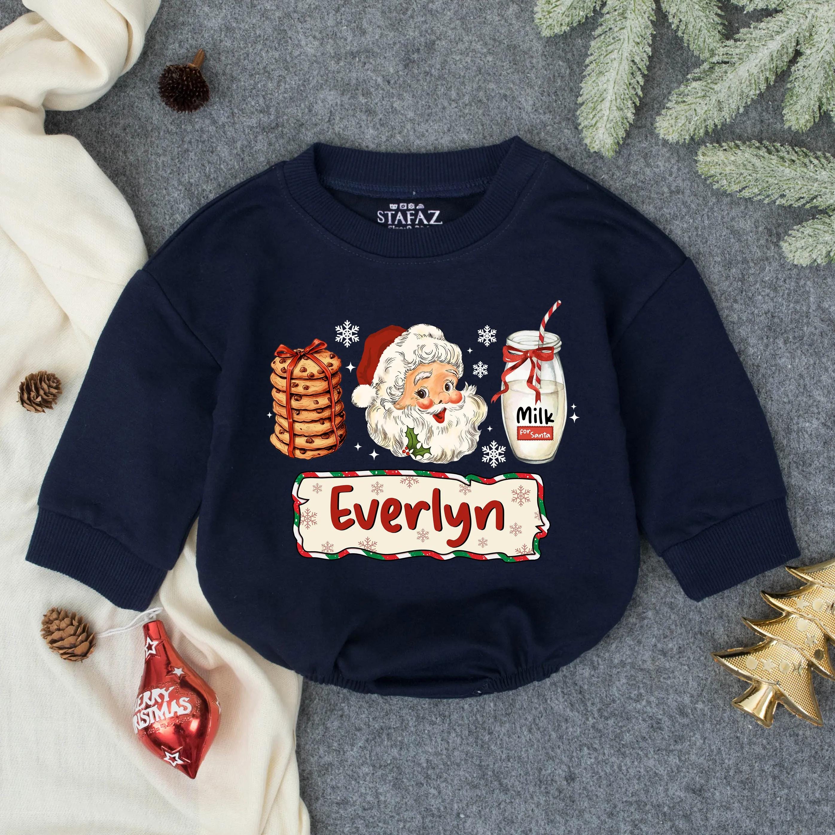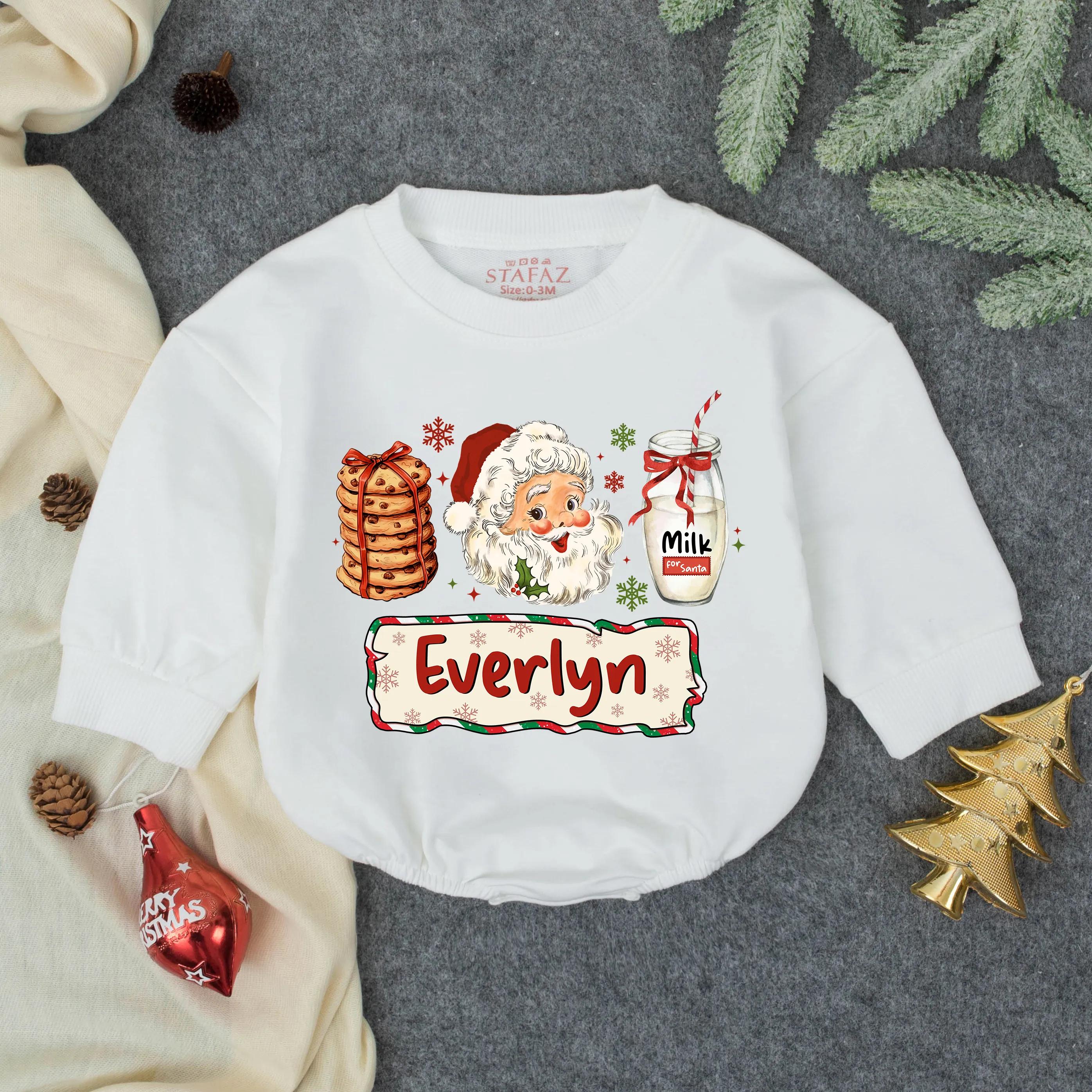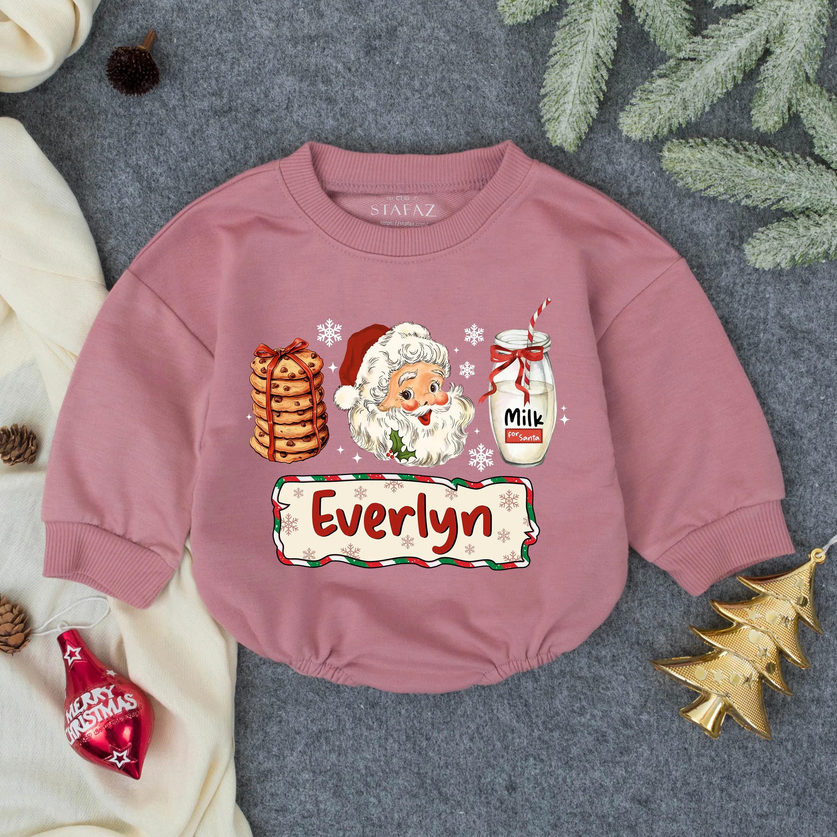 Personalized Retro Santa Baby Romper Christmas Outfit with Jolly Santa Claus Cookies Milk Whimsical Snowflakes Holiday Gift Cotton