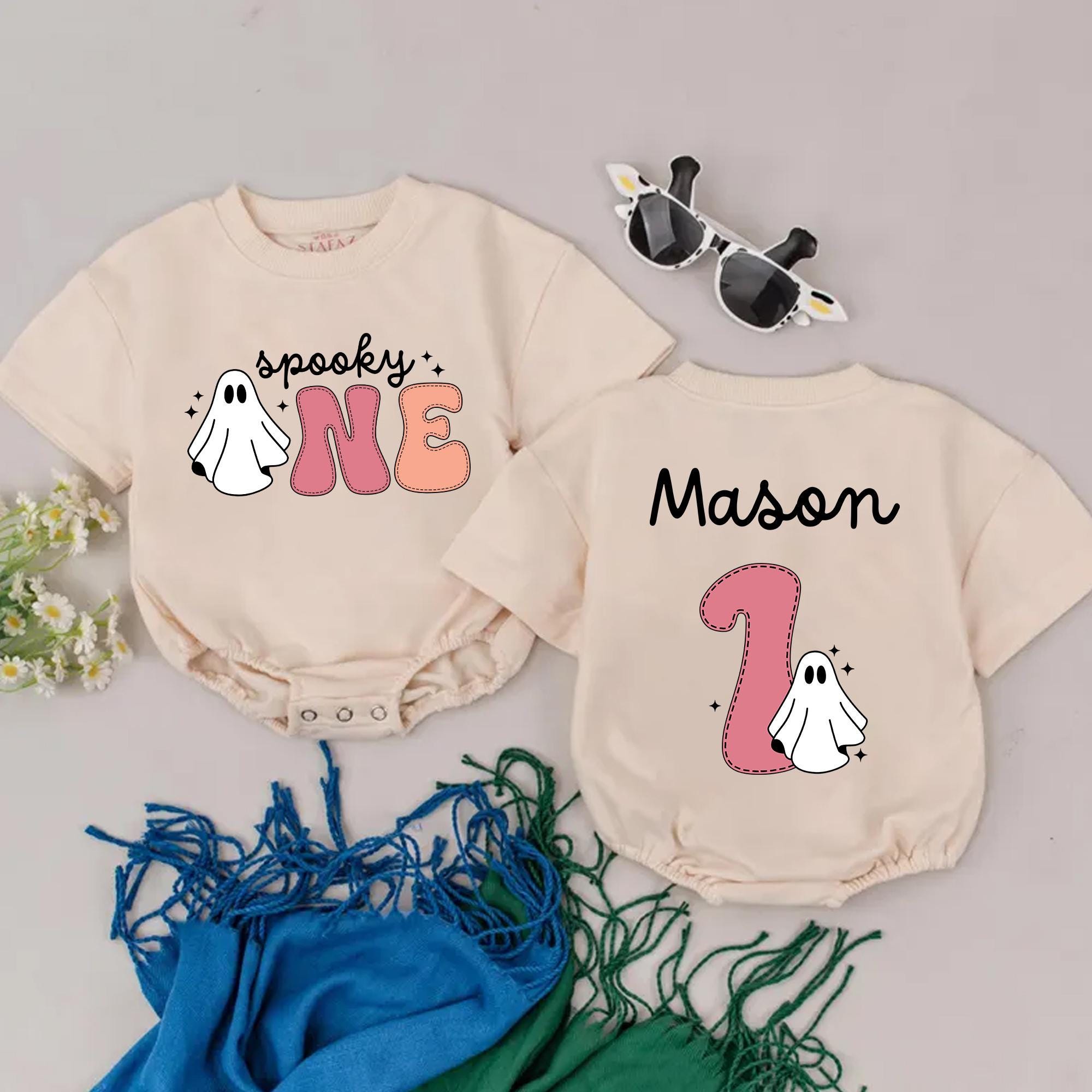 Capture the magic of your baby's first Halloween with this adorable romper, perfect for a memorable birthday celebration. The playful design features 'spooky' in whimsical black script, followed by 'ONE' in bold, colorful letters, bringing a festive charm to your little one's special day. A cute ghost graphic peeks from the 'O,' adding a touch of Halloween fun, while shades of pink and orange with textured patterns make it vibrant and lively. On the back, a large pink '1' accompanied by a ghost graphic and your baby's name in elegant black script personalize this outfit, turning it into a cherished keepsake. Picture her wearing this soft, comfortable cotton romper at a family gathering, spreading joy and smiles. It's a perfect gift that celebrates milestones and creates lasting memories, inviting you to mark this occasion with warmth and affection.