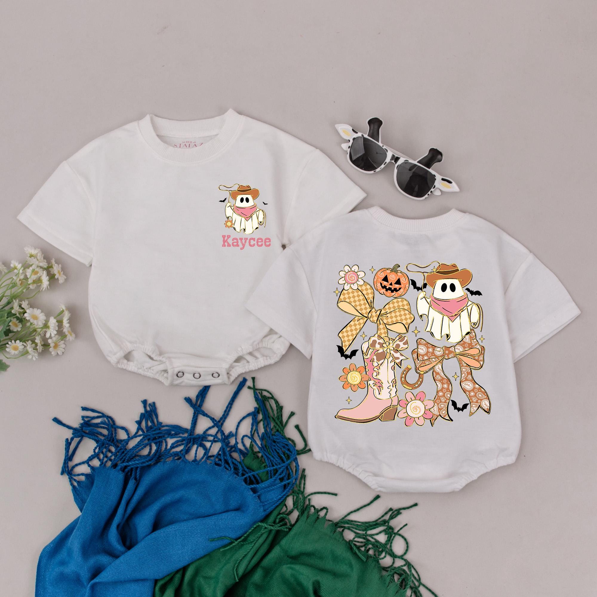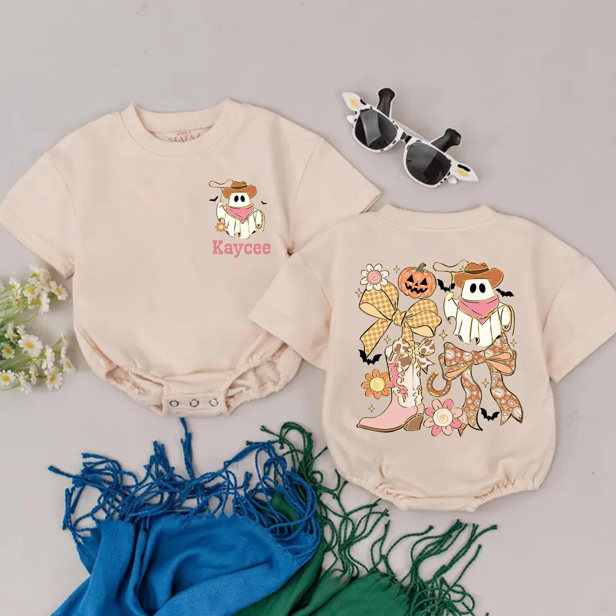 Personalized Western Ghost Halloween Romper with Cowboy Hat Floral Pumpkin Design Baby Outfit Perfect for Spooky Season Gift