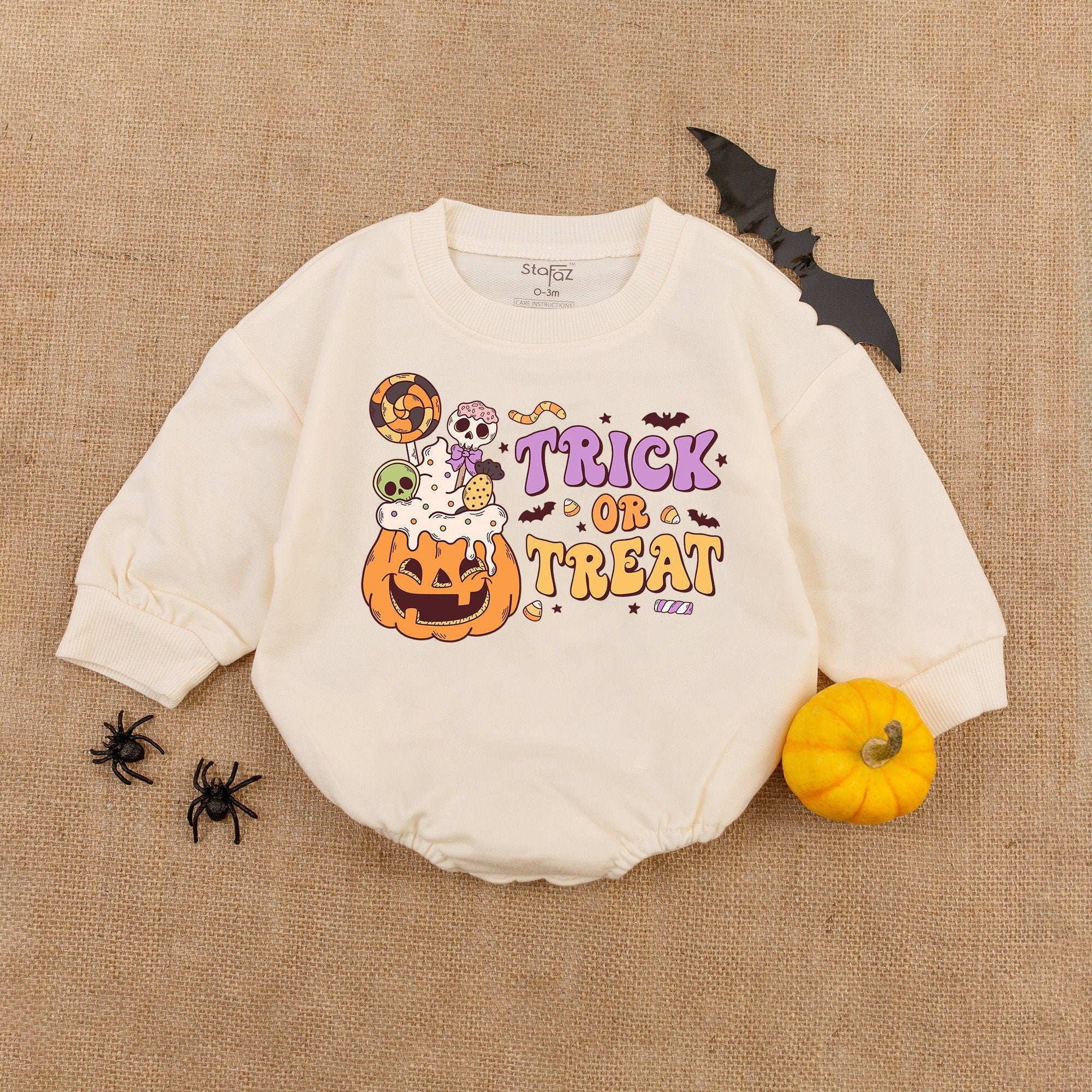 Imagine your little one wrapped in the festive spirit of Halloween, their eyes wide with wonder and joy. This adorable baby romper features a whimsical design with a cheerful orange jack-o'-lantern at its heart, surrounded by playful cartoon skulls and a sweet lollipop. The vibrant text 'TRICK OR TREAT' stands out in bold purple and orange, accompanied by fluttering black bats and twinkling stars, creating a delightful vintage aesthetic. Perfect for capturing those precious first Halloween memories, this romper is not only a cozy choice for a baby's first holiday but also a charming outfit for seasonal family gatherings. Crafted from soft, comfortable cotton, it's ideal for all-day wear, whether you're celebrating at home or out on a festive adventure. Let your baby be the star of the show, bringing smiles to every face and joy to the holiday season. Capture the magic of their first Halloween with this special outfit that promises both comfort and cuteness.