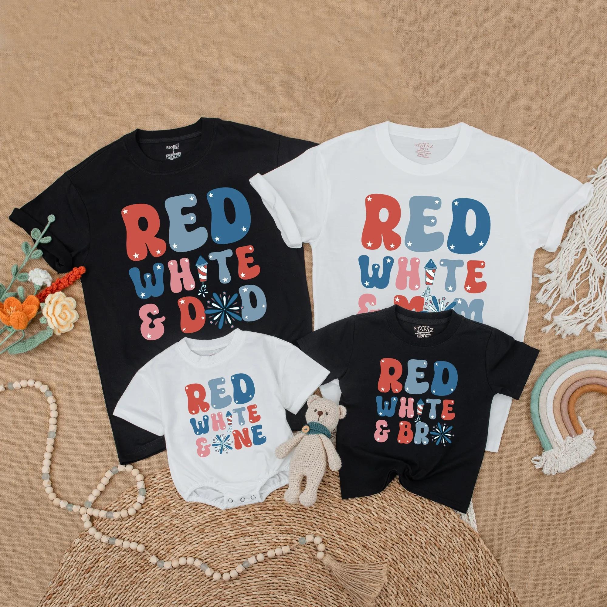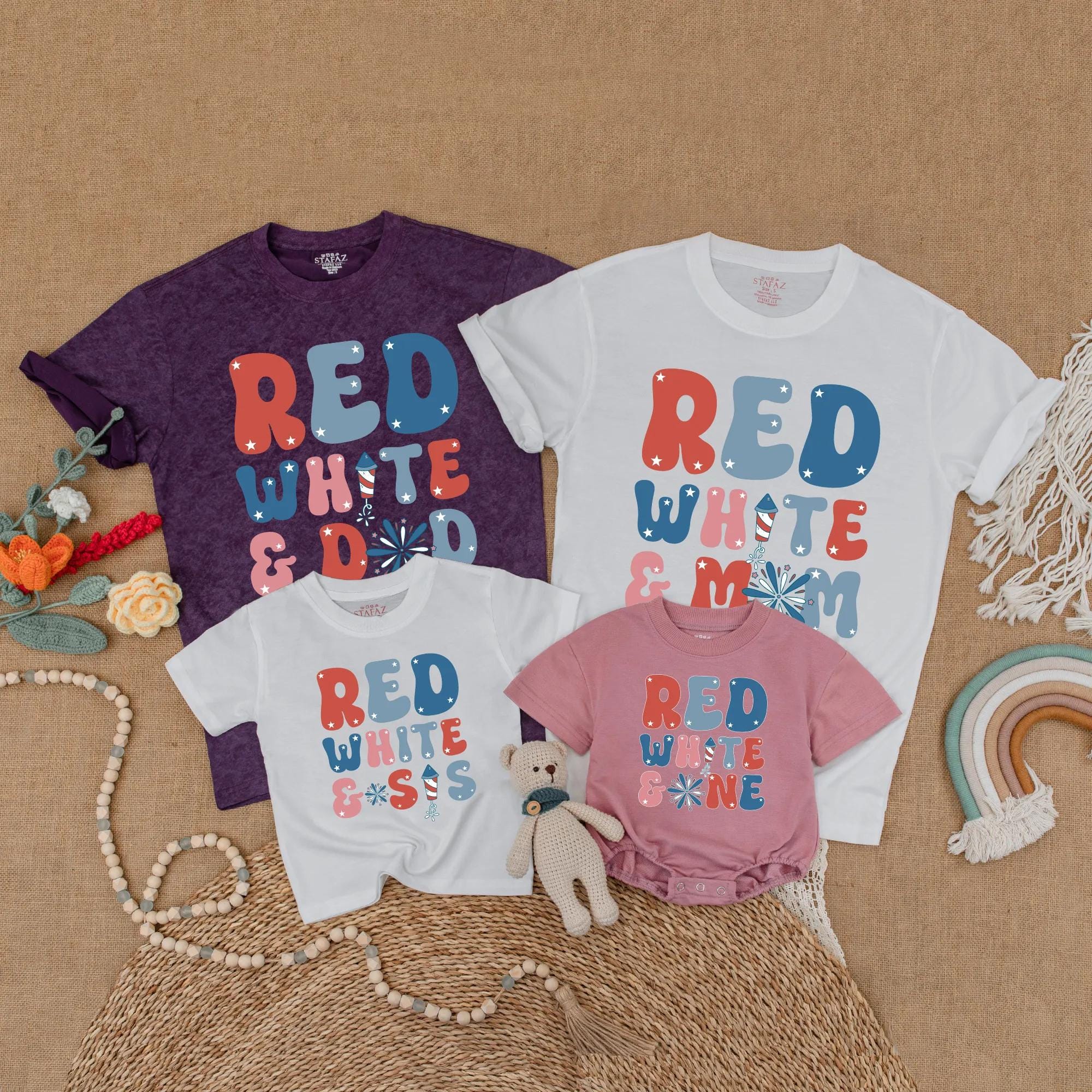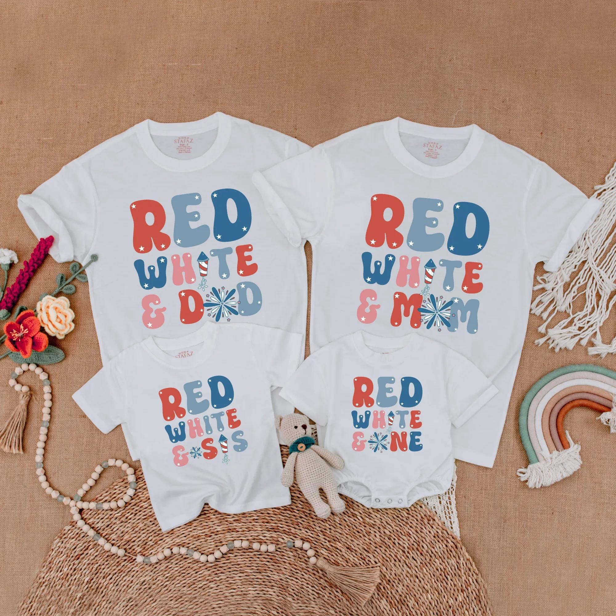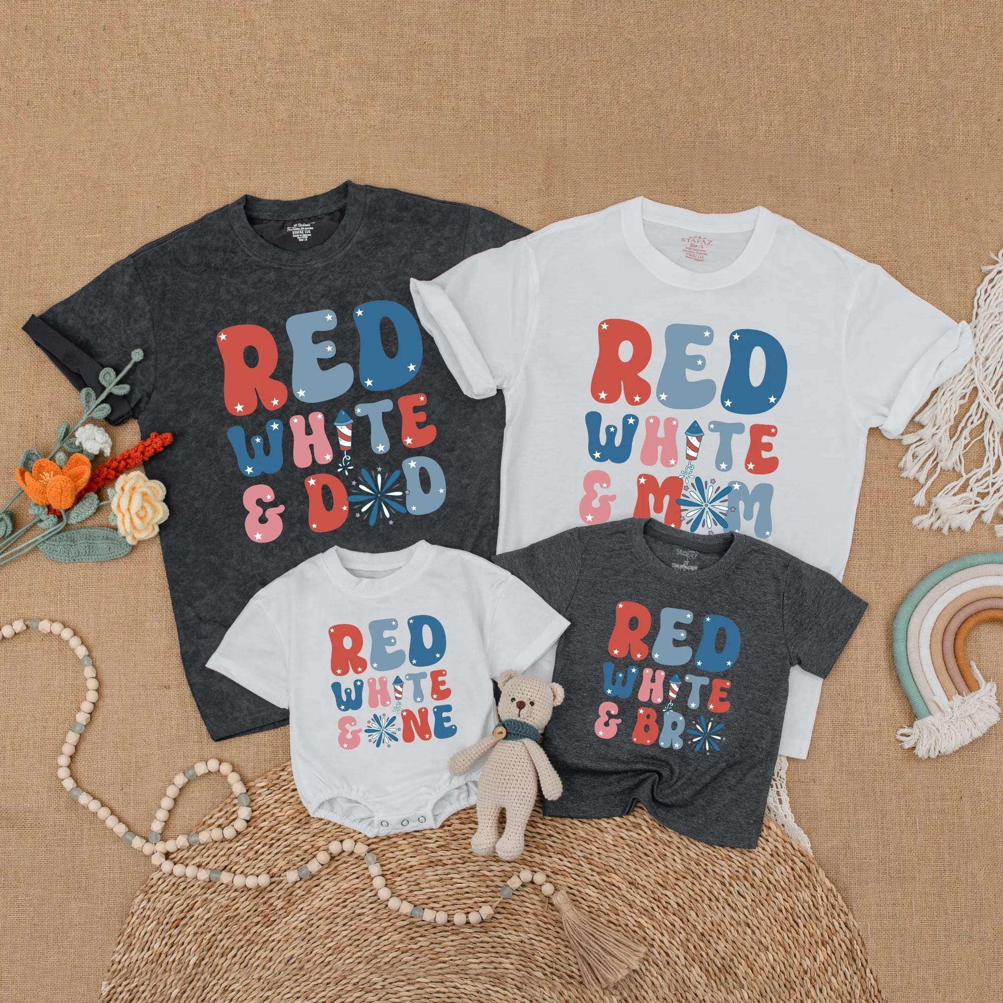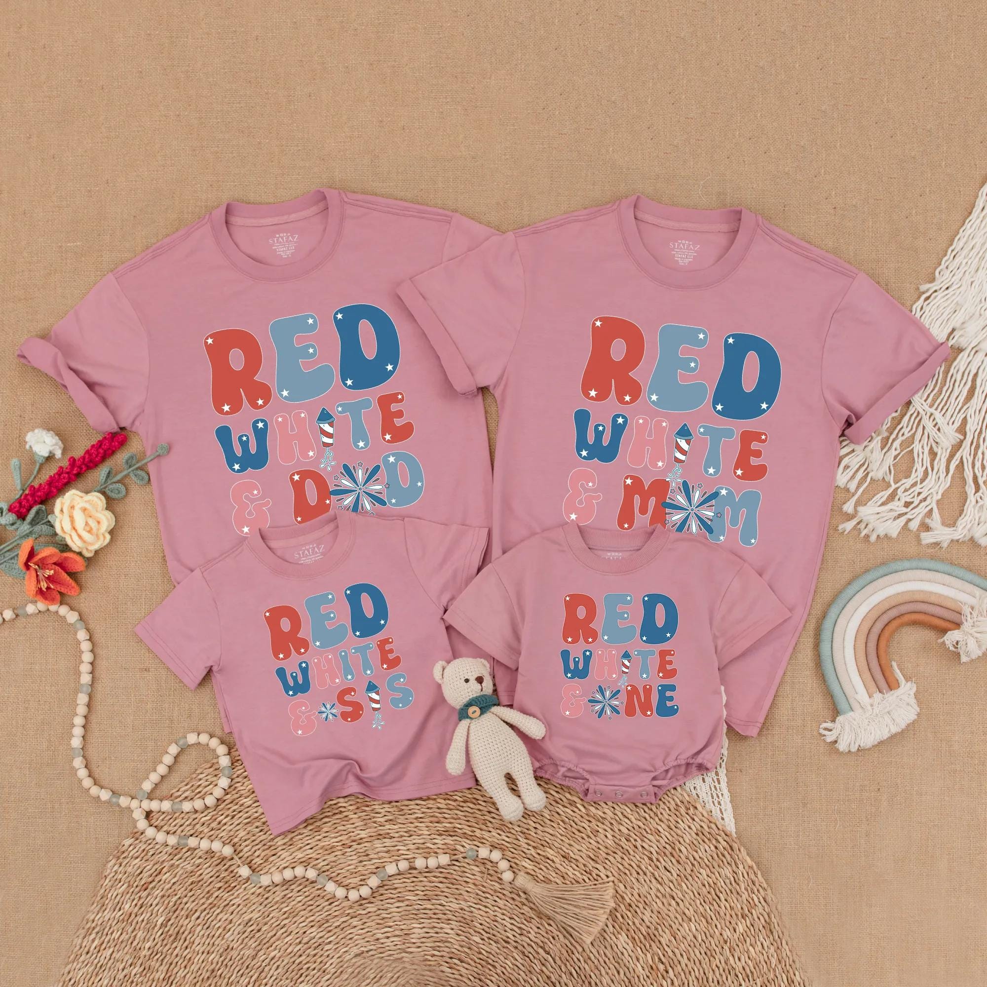 Picture a lively 4th of July family picnic where everyone is laughing and playing, each wearing a shirt that boldly says 'RED WHITE & DAD,' 'RED WHITE & MOM,' 'RED WHITE & SIS,' or 'RED WHITE & ONE.' The vibrant colors of red, white, and blue in large, retro-style letters bring a festive spirit to any gathering. Imagine capturing those joyful moments in a family photo, with the firework design adding a touch of celebration. These matching outfits not only strengthen family bonds but also create unforgettable memories. With the option to add your loved ones' names, each shirt becomes a cherished keepsake, making it a thoughtful gift for birthdays or holidays. Embrace the joy of togetherness and let these personalized shirts be a part of your family's special moments.