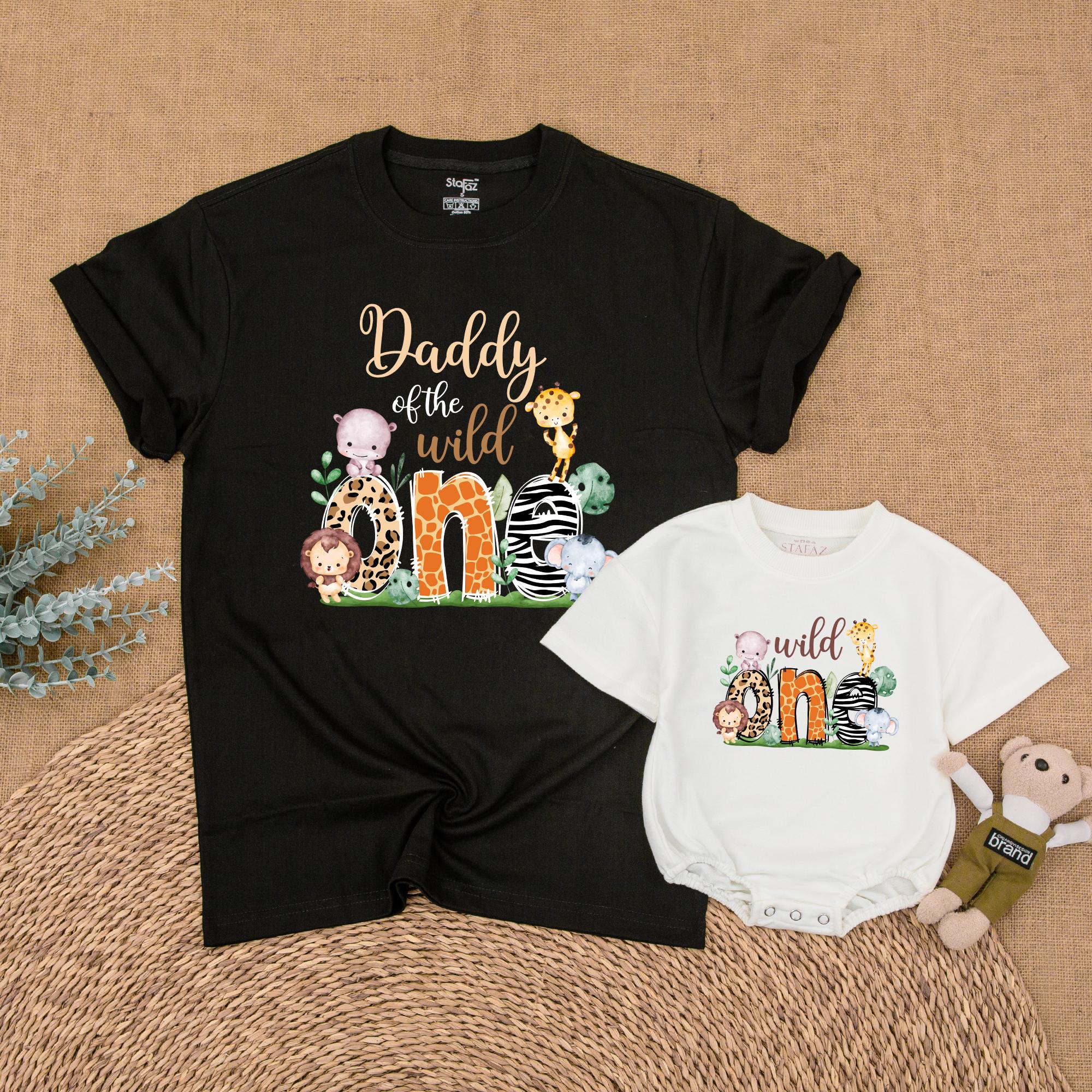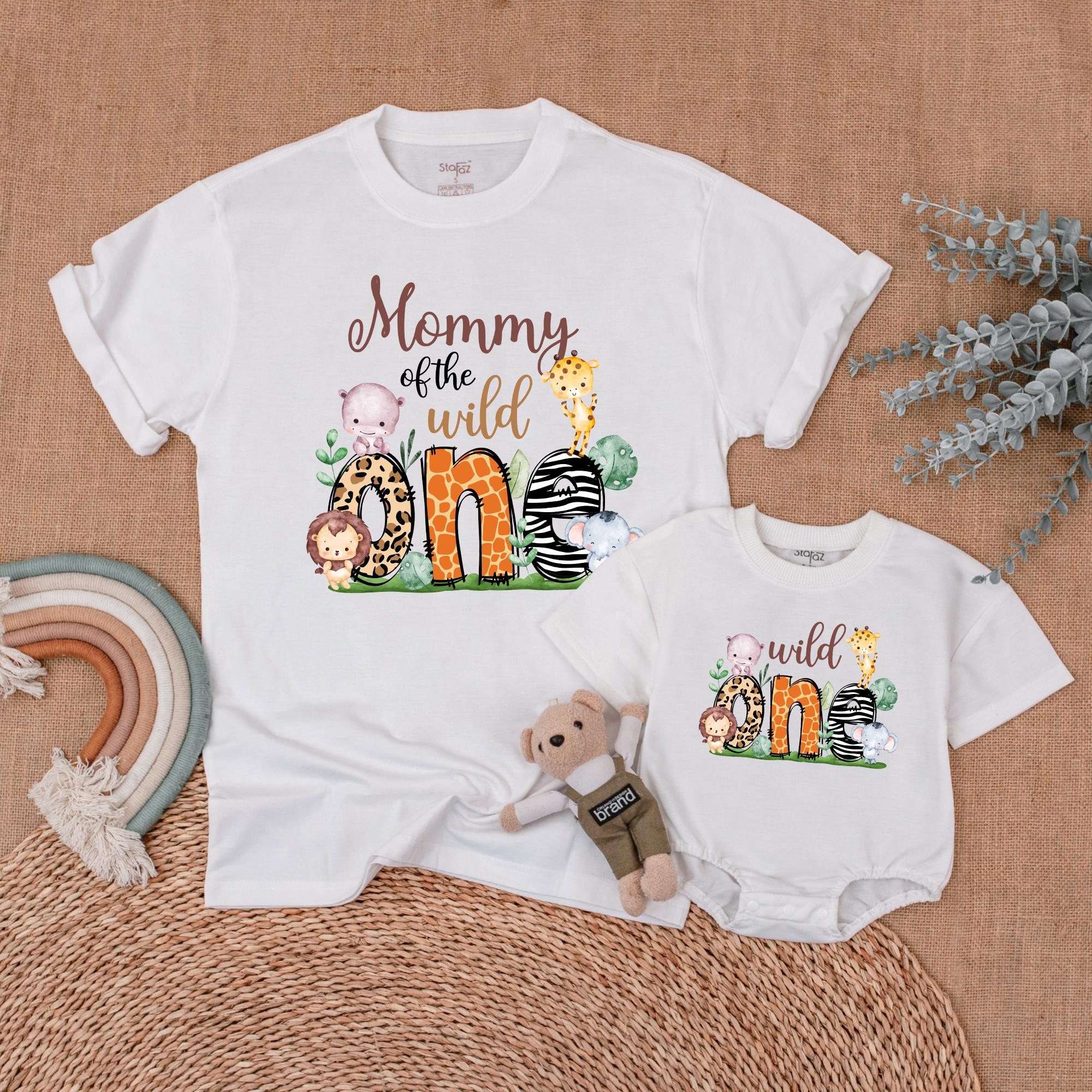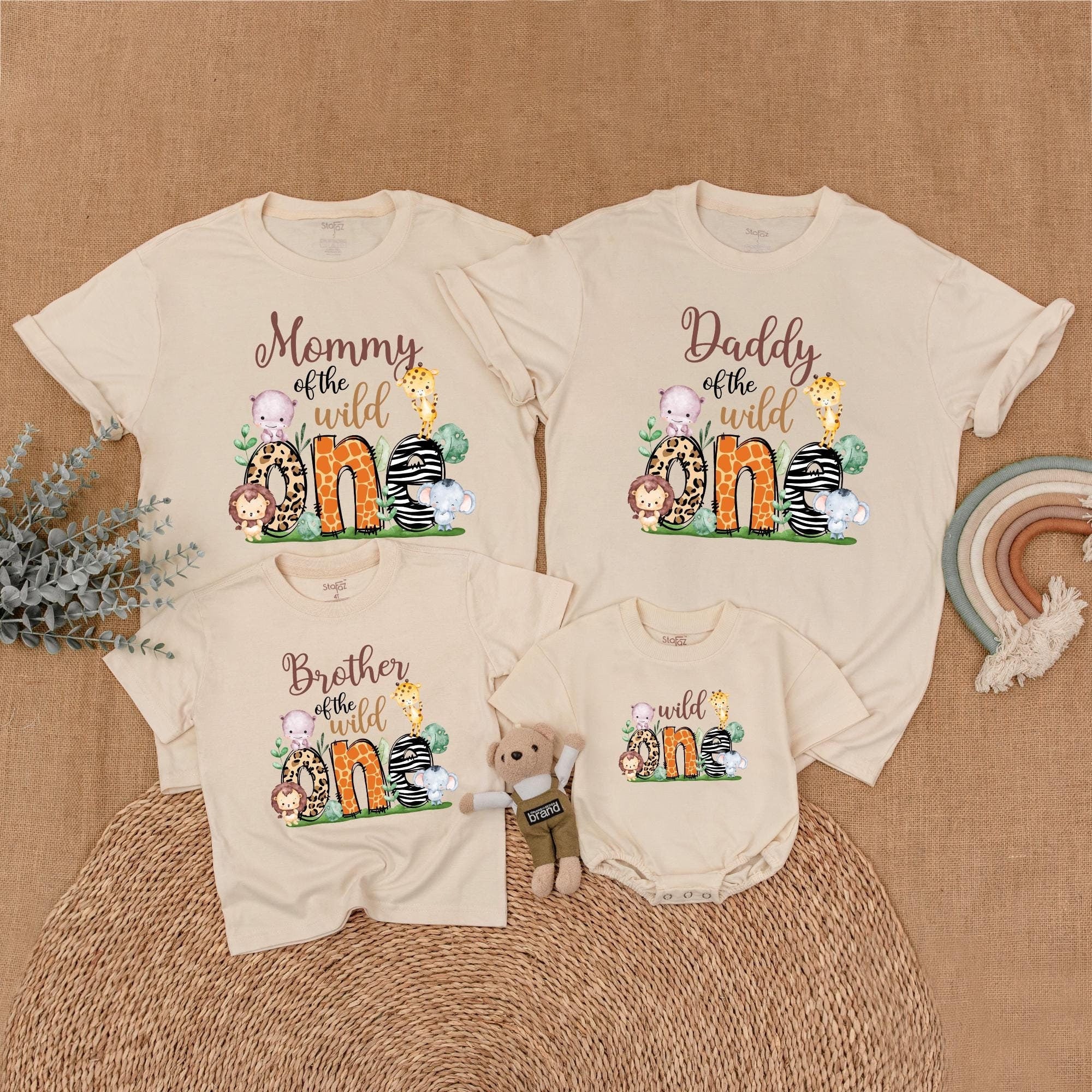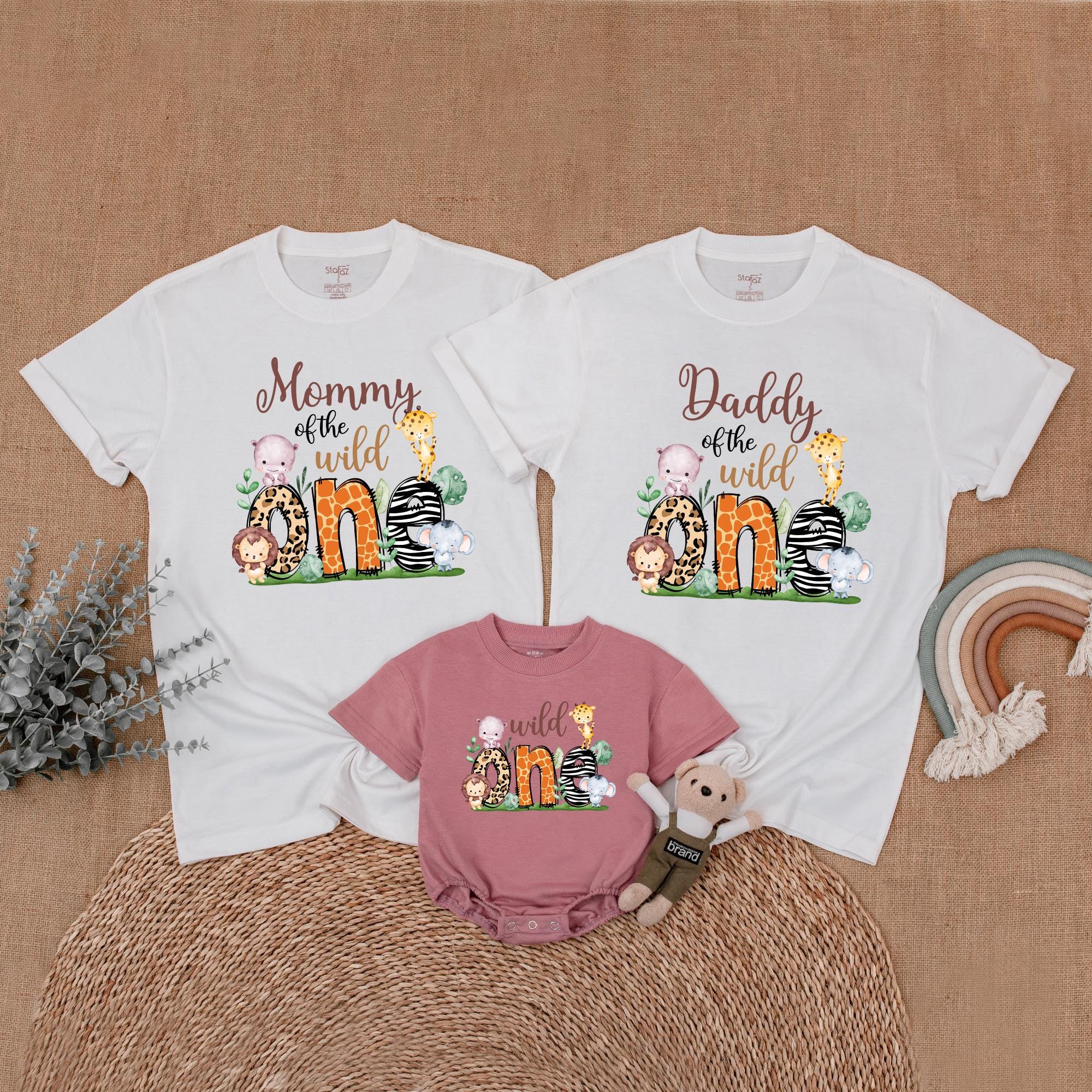 Imagine the joy of celebrating your little one's first birthday with a safari adventure theme that brings smiles to everyone. Our delightful shirts feature a charming safari design with adorable cartoon animals like giraffes, zebras, and monkeys, all gathered around a vibrant orange and brown jeep. The cheerful phrases 'Mommy of the wild,' 'Daddy of the wild,' and 'Brother of the wild' add a playful touch, making these outfits perfect for a fun family gathering or a memorable photoshoot. Crafted in soft cotton, these shirts are not only comfortable but also a heartwarming way to strengthen family bonds. Picture a family brunch or a casual day out, each member sporting their personalized shirt, creating cherished memories. Personalize each shirt with a name for an extra special touch that turns this outfit into a keepsake. Capture the moment and the love with these uniquely themed shirts that celebrate the joy of family and adventure.