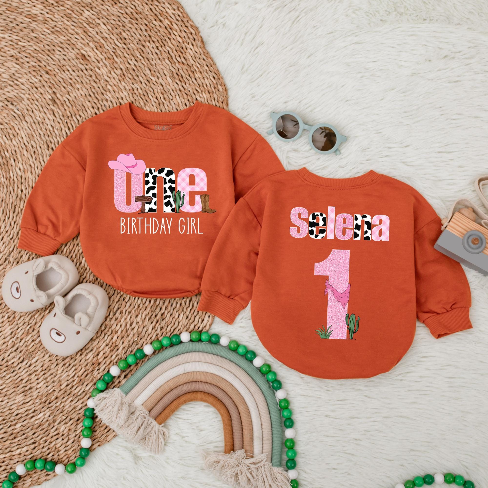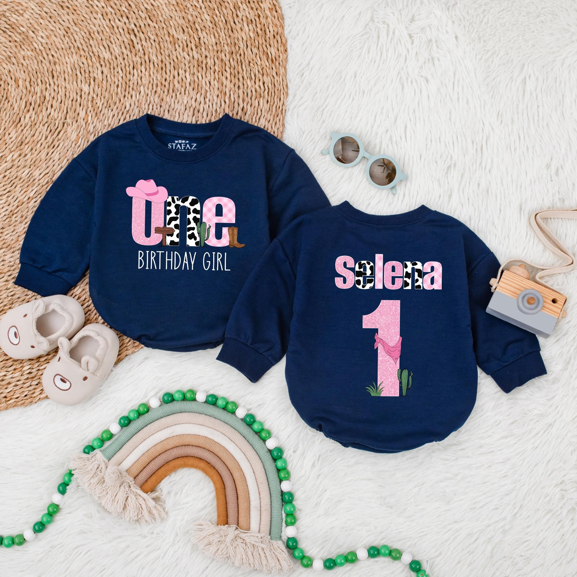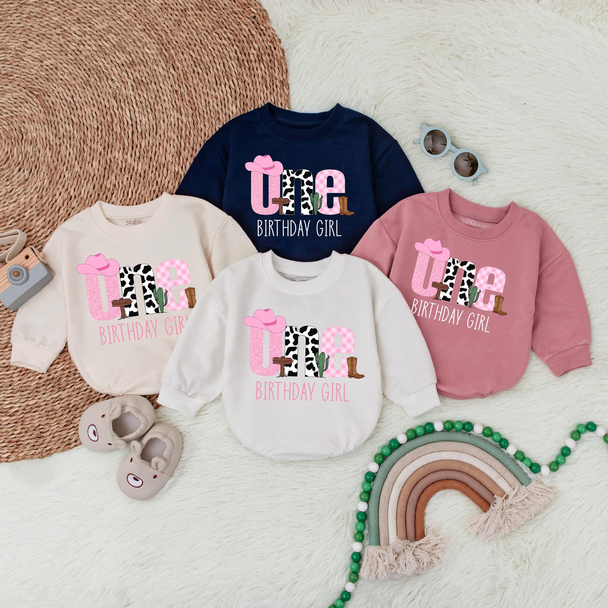 Celebrate your little one's first big milestone with a romper that's as vibrant and joyful as the occasion itself. Imagine your baby girl stepping into her special day, adorned in a romper filled with playful western charm. The whimsical design features a pink cowboy hat on 'O', cow print 'N', and a pink checkered 'E', with 'BIRTHDAY GIRL' in pink, perfectly capturing her spirit. On the other side, her name 'Selena' in cow print with a pink '1', cowboy boot, and cactus graphic, adds a unique personal touch. It's perfect for capturing those precious moments at a family gathering or birthday party. Soft, comfortable cotton ensures she feels as good as she looks, making it a keepsake to cherish forever. Personalize this romper to make her day even more special, and create a memory that will last a lifetime.