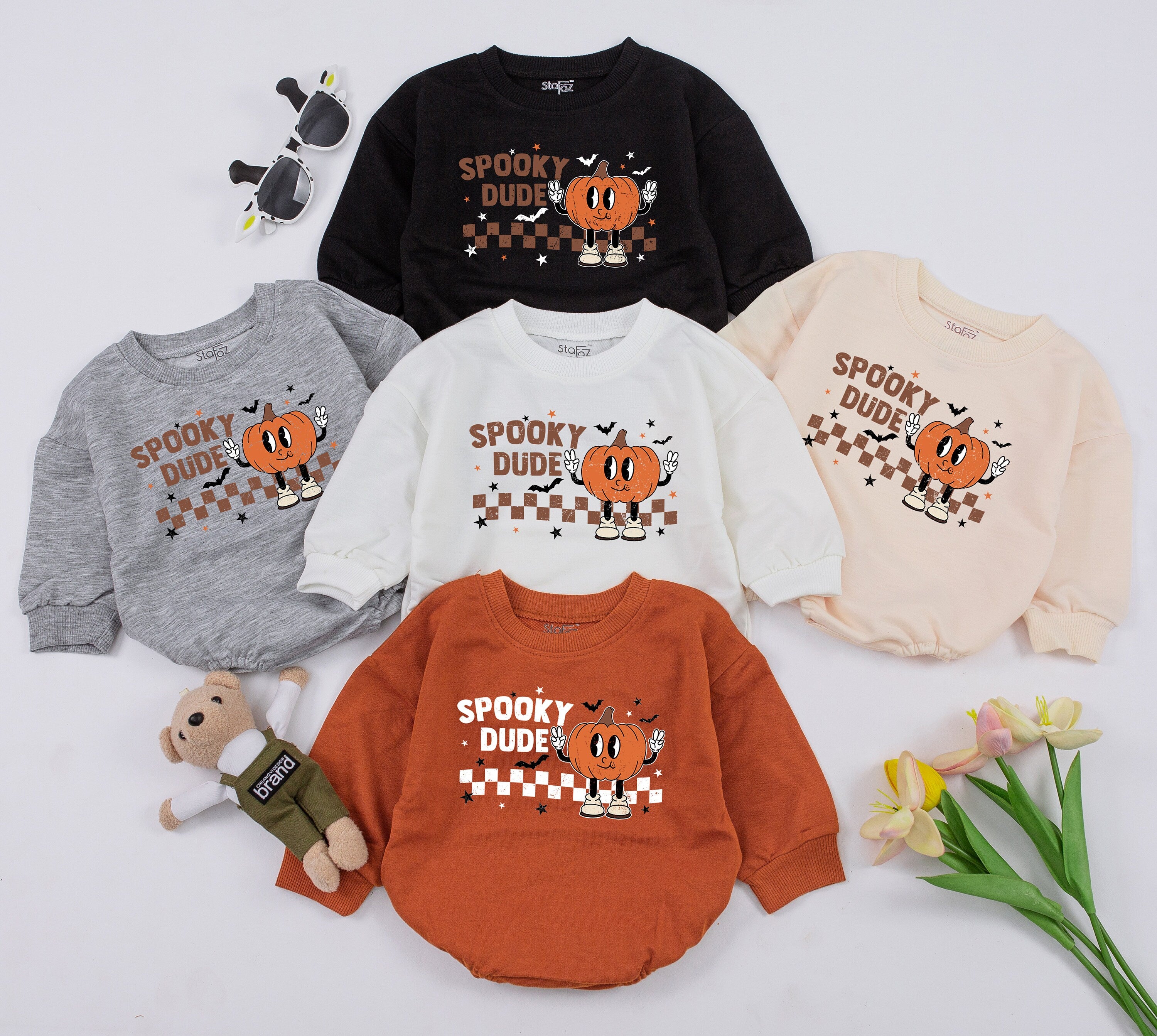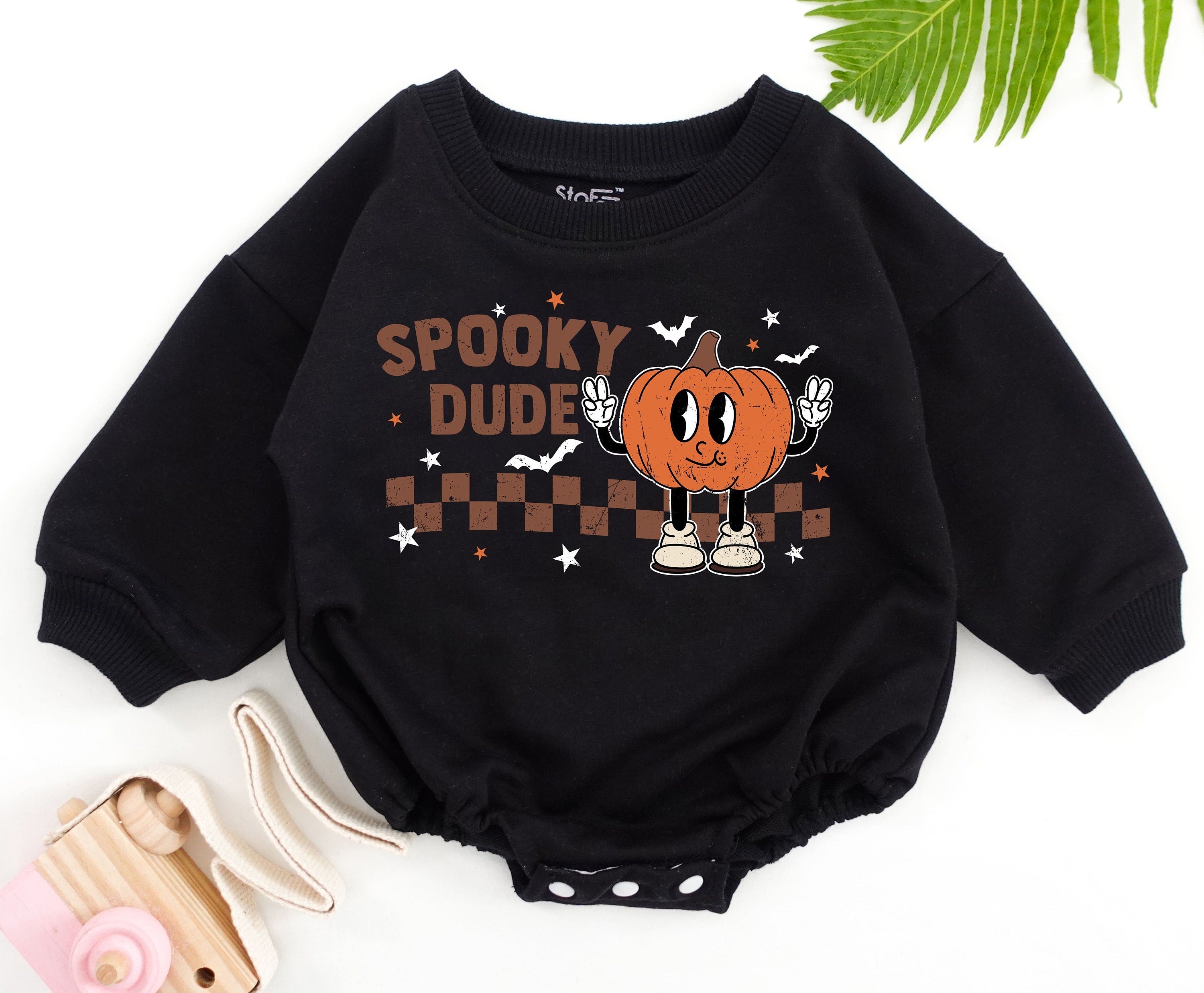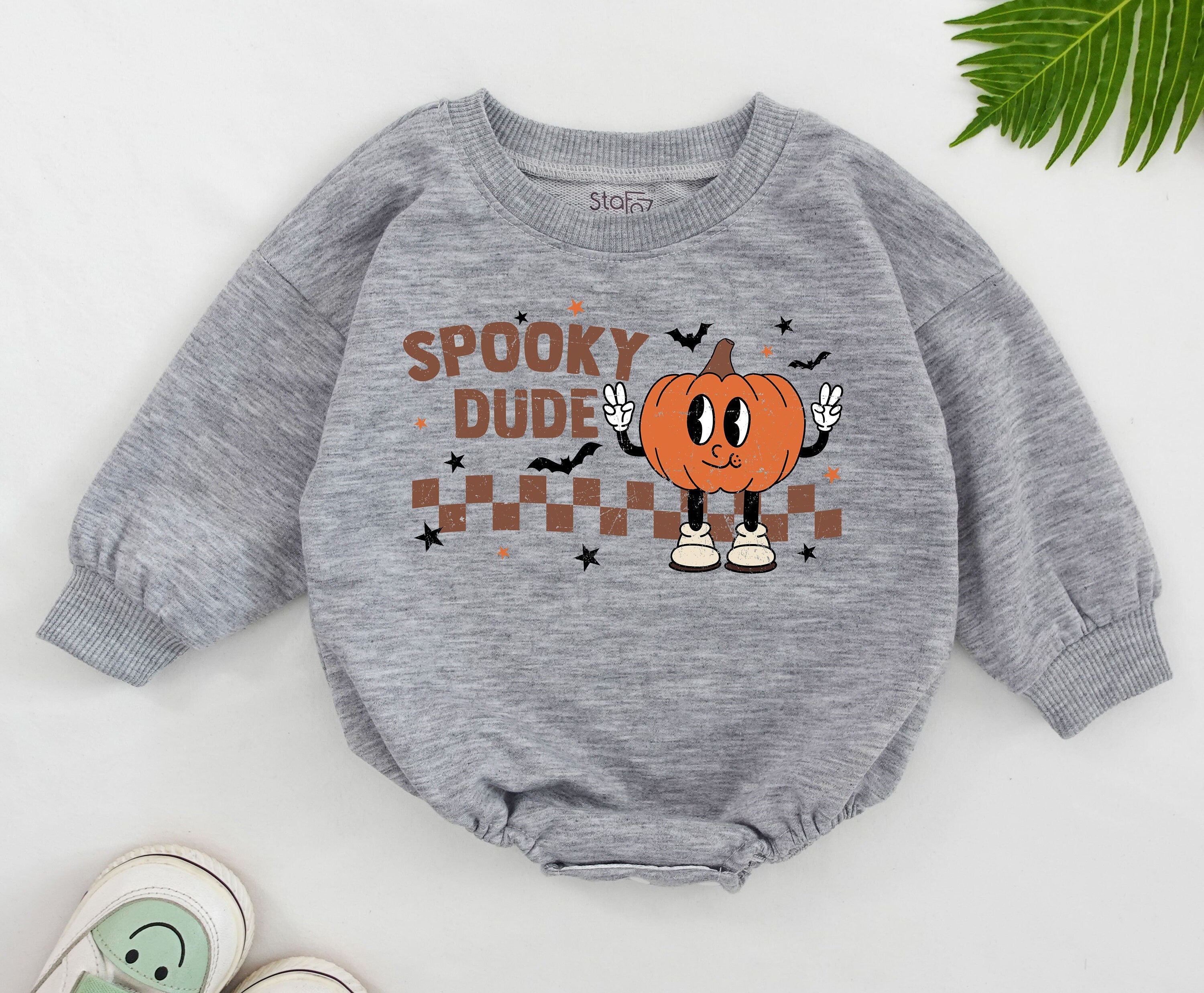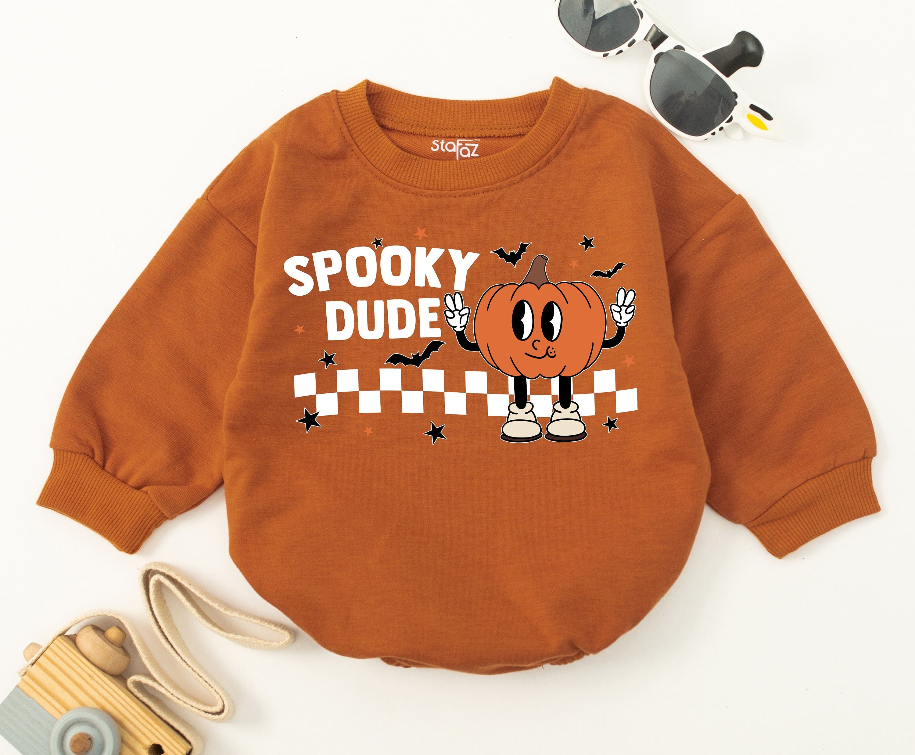Picture your little one giggling as they explore the world in this charmingly retro baby romper, perfect for Halloween festivities or a cozy autumn day. The playful cartoon pumpkin character with expressive eyes and a cheeky smile brings a whimsical vibe, while the bold 'SPOOKY DUDE' lettering adds a fun, seasonal touch. With warm autumnal tones of orange, brown, and cream, complemented by a vintage checkered pattern, this romper is as delightful as a crisp fall morning. Crafted from soft, comfortable cotton, it’s ideal for your baby’s everyday adventures or a special family gathering. Imagine the joyful memories as your infant toddles around in this adorable outfit, bringing smiles to everyone around. Embrace the seasonal spirit and create cherished moments with this unique piece, perfect for capturing those precious first Halloween photos.