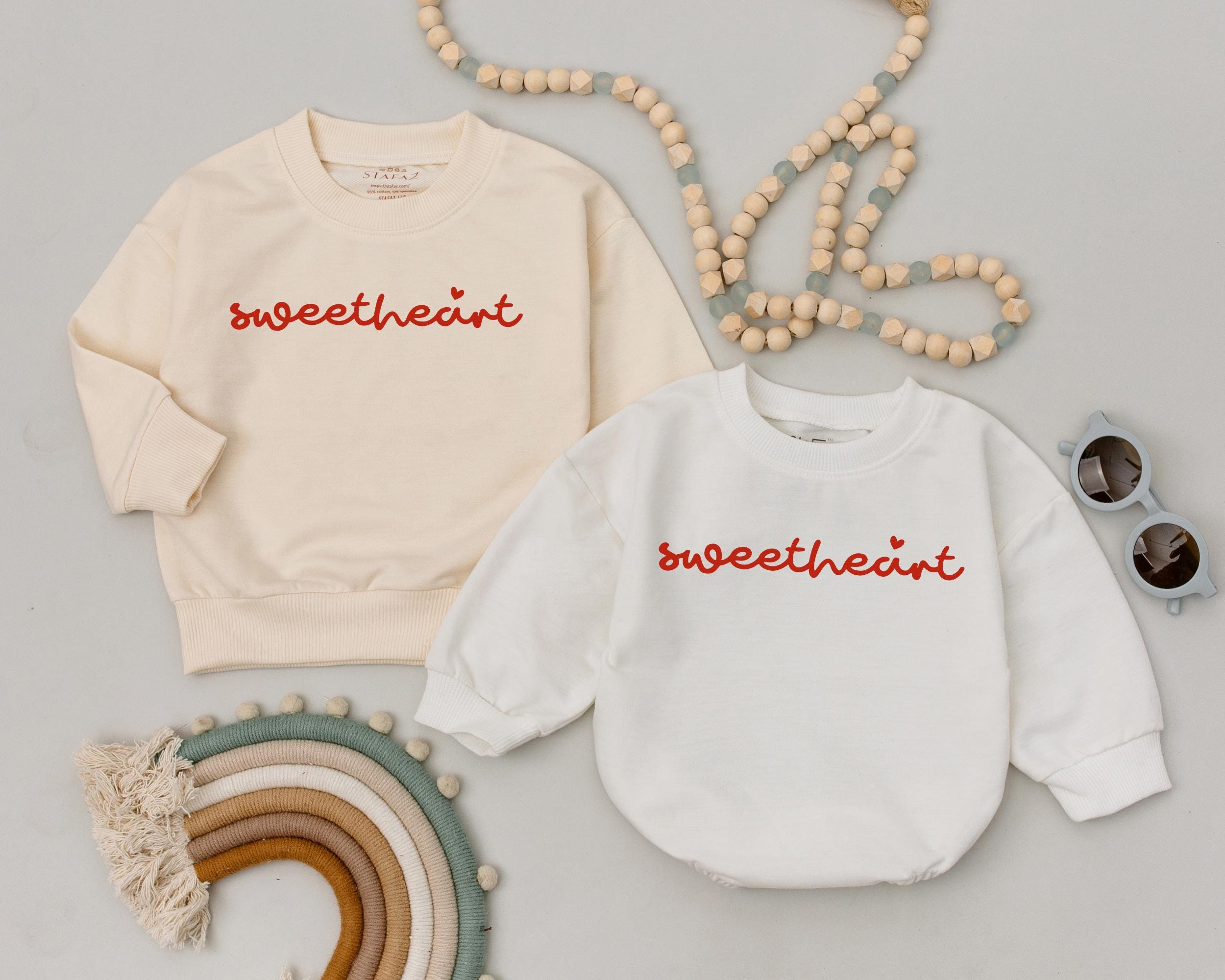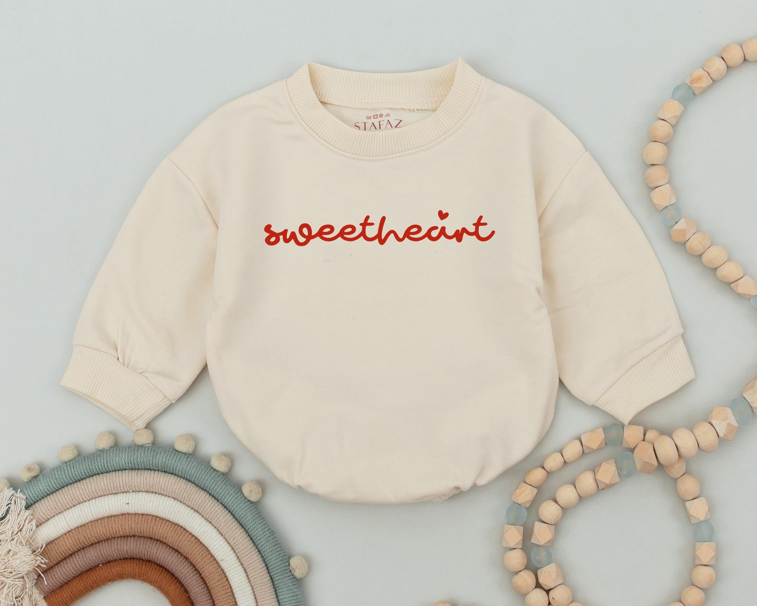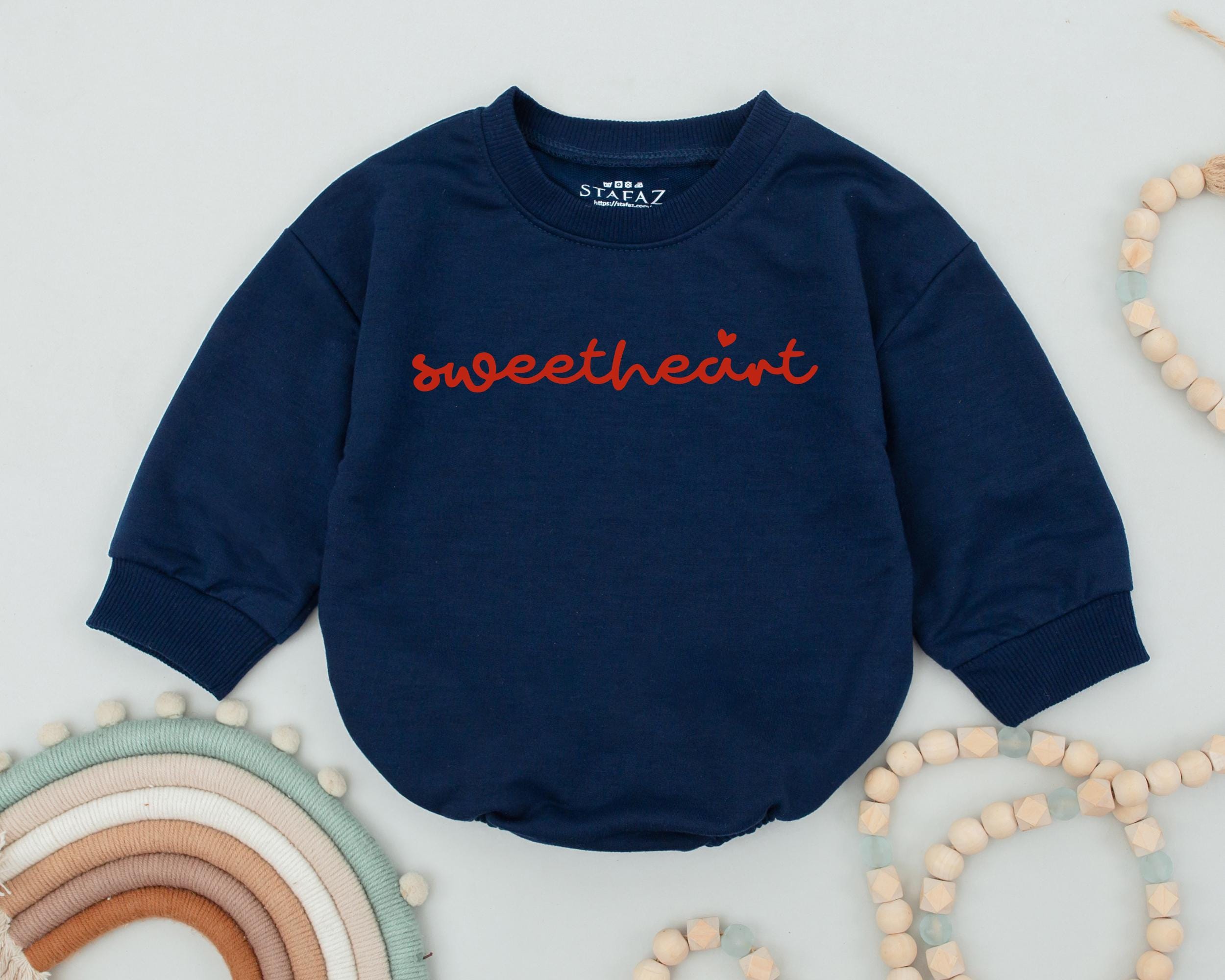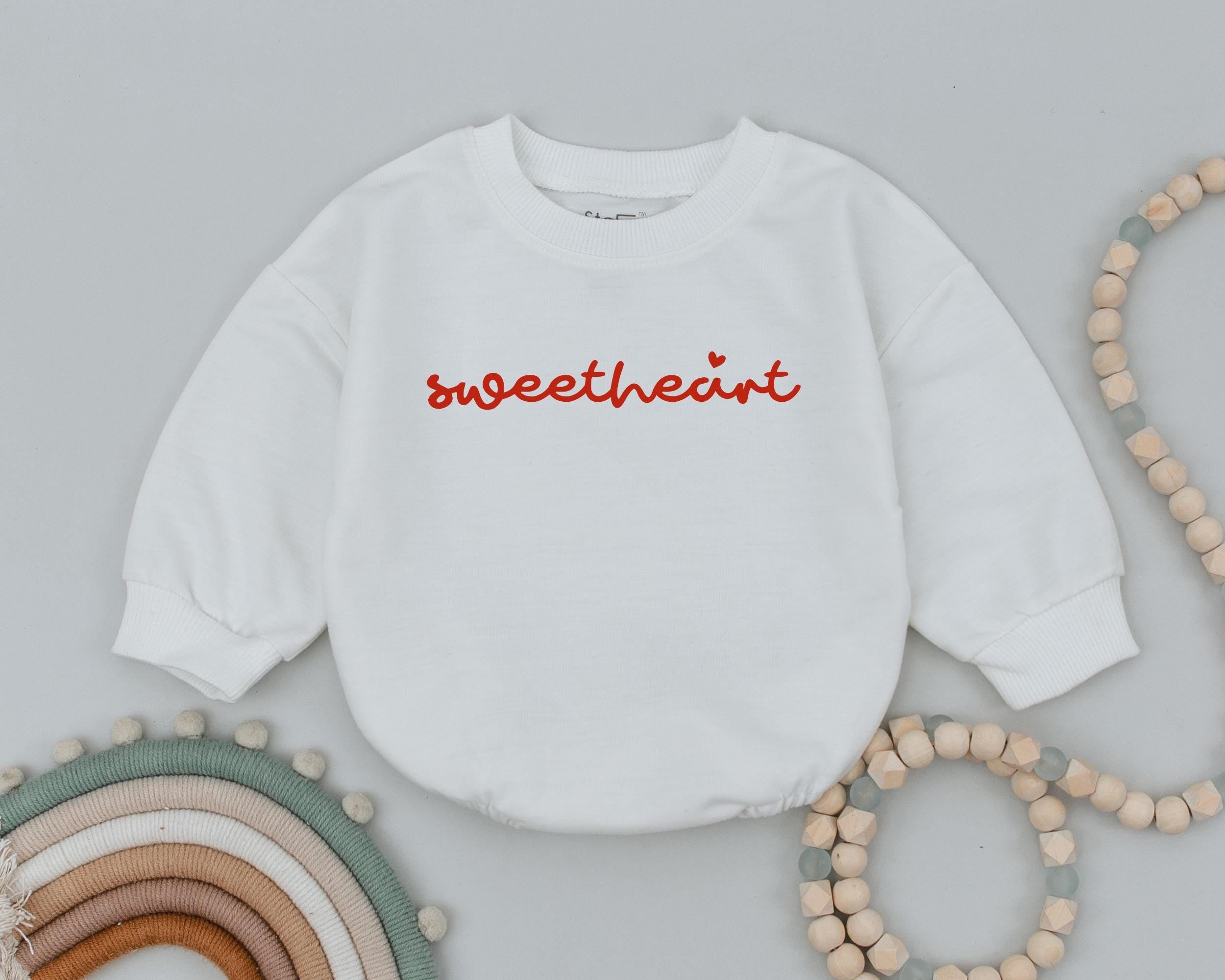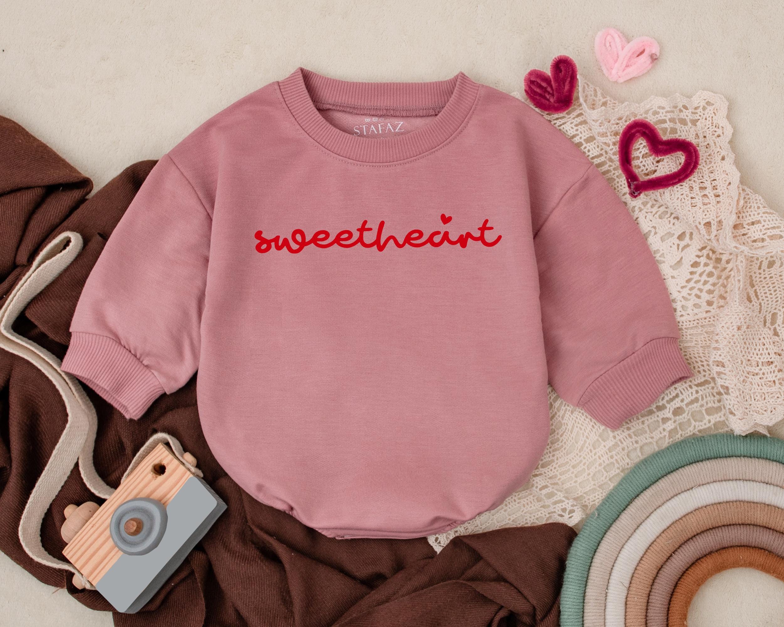 Imagine the joy of dressing your little one for their first Valentine's Day, capturing those precious moments in a Sweetheart Bubble Romper. The playful cursive 'sweetheart' in vibrant red stands out beautifully against the soft pink background, with a tiny heart replacing the dot in the 'i' adding a whimsical touch. Picture your baby wearing this charming outfit at a family brunch or during a cozy gathering, spreading love and smiles all around. Made from soft, comfortable fabric, it's perfect for cuddles and play. This romper makes an ideal baby shower gift, inviting warmth and affection into any wardrobe. Celebrate the season of love and make unforgettable memories with this delightful Valentine's Day attire.