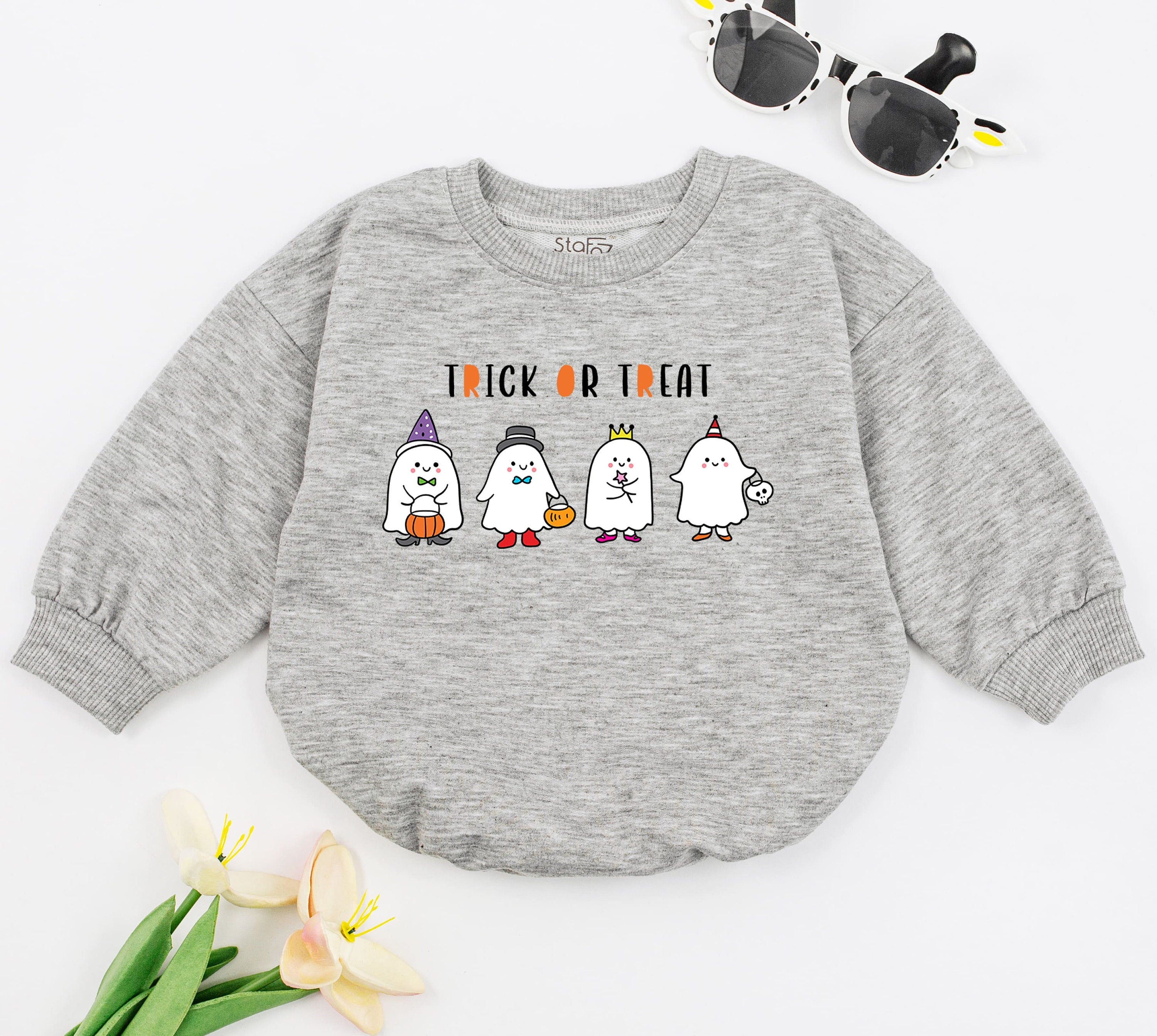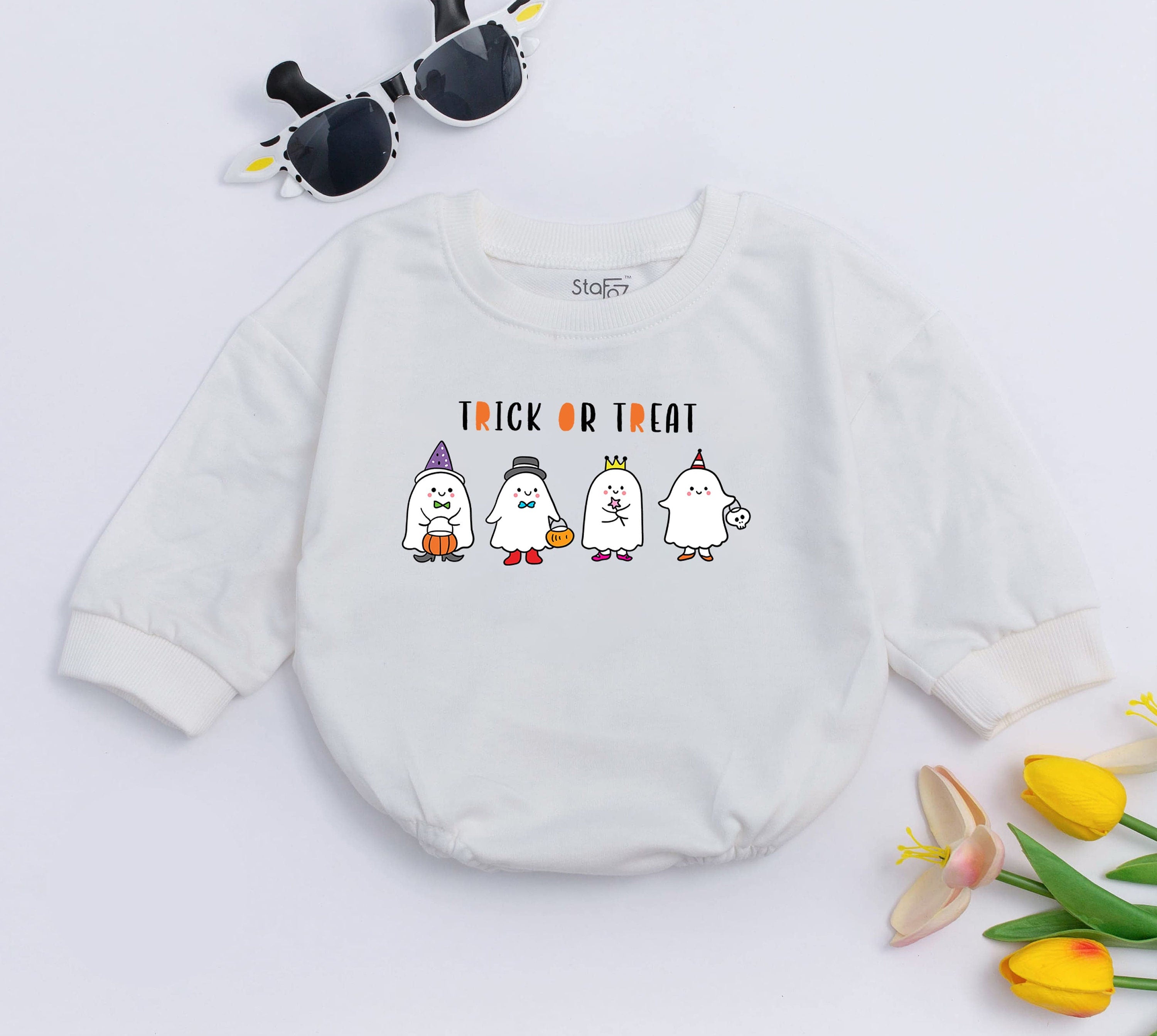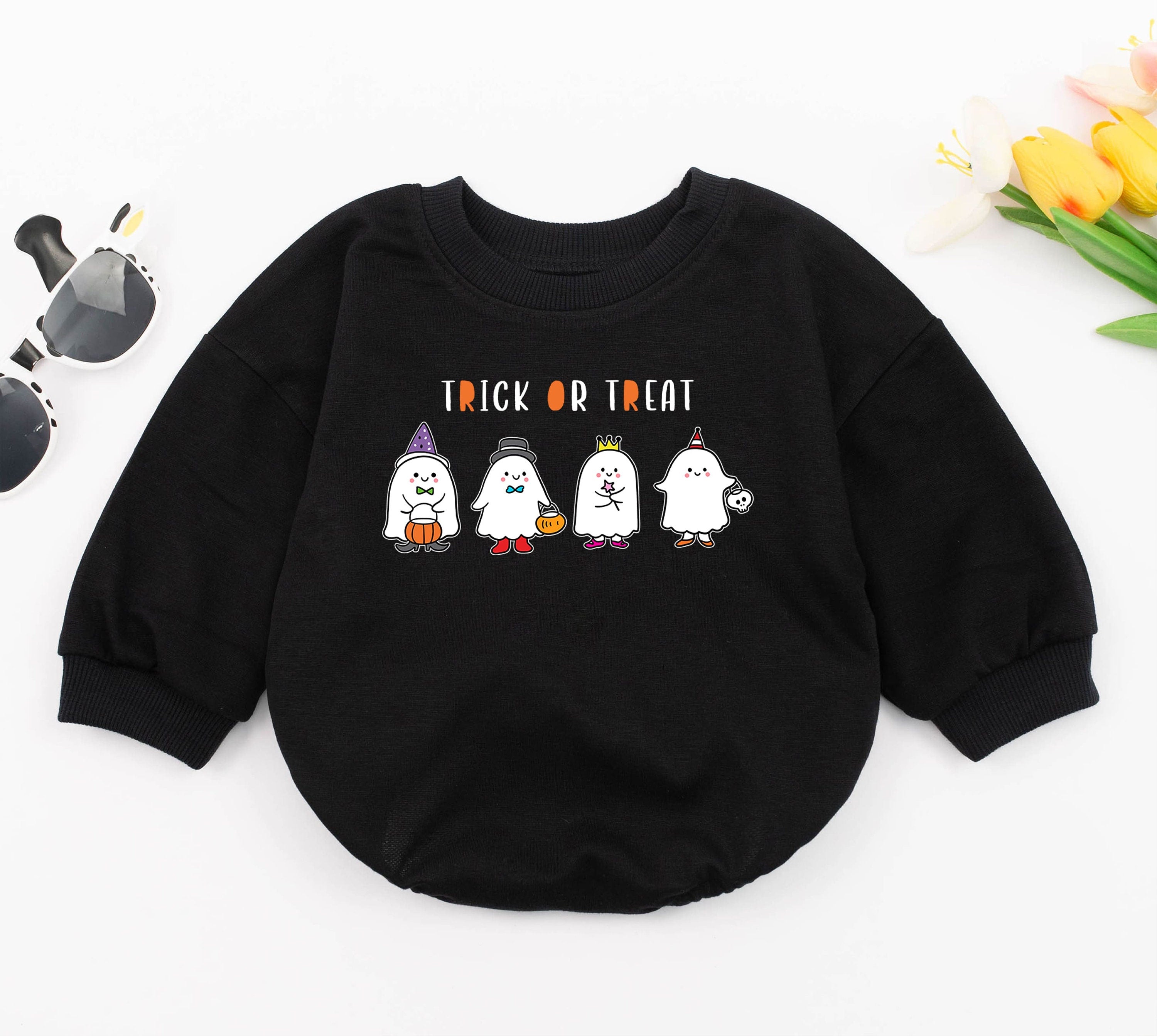 Imagine your little one giggling in this delightful baby romper, perfect for the spookiest season of the year. The playful design features adorable ghost characters, each wearing charming witch hats and holding colorful candy, bringing a whimsical Halloween spirit to life. The bright, cheerful colors and the bold 'TRICK OR TREAT' text make it an ideal choice for festive gatherings, whether it's a cozy family party or a lively Halloween baby shower. Crafted with soft, comfortable cotton, this romper ensures your baby feels snug and happy during fall adventures. Picture the joy of capturing precious moments as your baby lights up every room in this charming outfit. Embrace the magic of Halloween with this romper, a perfect gift to create memories that last a lifetime.