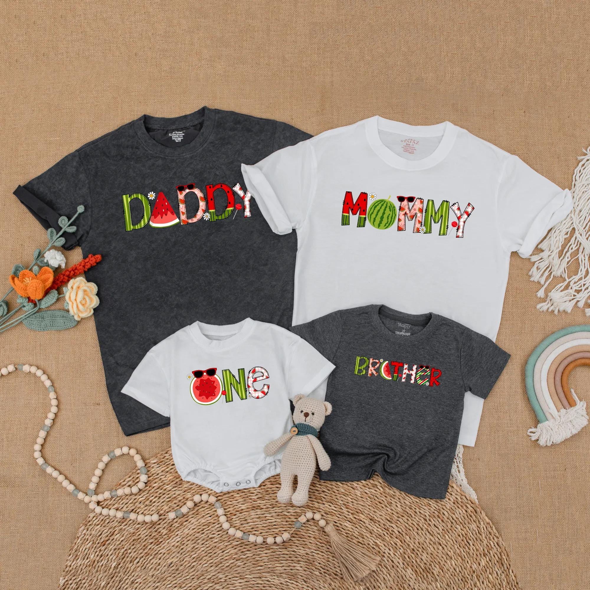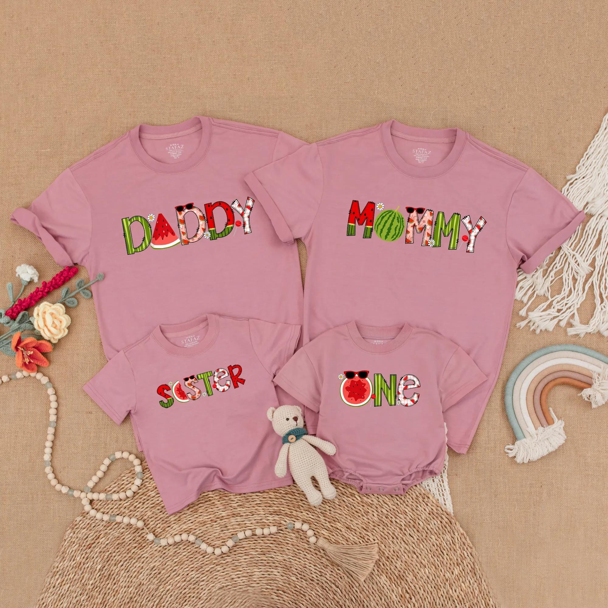 Imagine the giggles and smiles at your little one's birthday party as they wear this vibrant watermelon-themed outfit, surrounded by family in matching shirts. Each letter on the shirt is playfully adorned with watermelon slices, seeds, and stripes, painting a picture of cheerful summer fun. Whether it's for a backyard cookout or a cozy indoor gathering, these soft cotton shirts bring joy and whimsy to any family moment. Picture a family photoshoot capturing your toddler's first birthday with everyone in coordinated outfits, celebrating togetherness and love. Personalize each shirt with names to create a lasting treasure, making this not just an outfit but a cherished memory. Gift your family the joy of matching outfits, creating moments that are as sweet and refreshing as a summer watermelon.